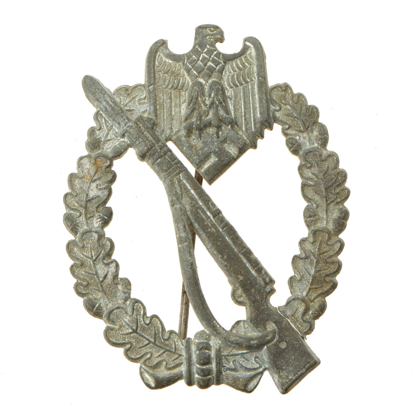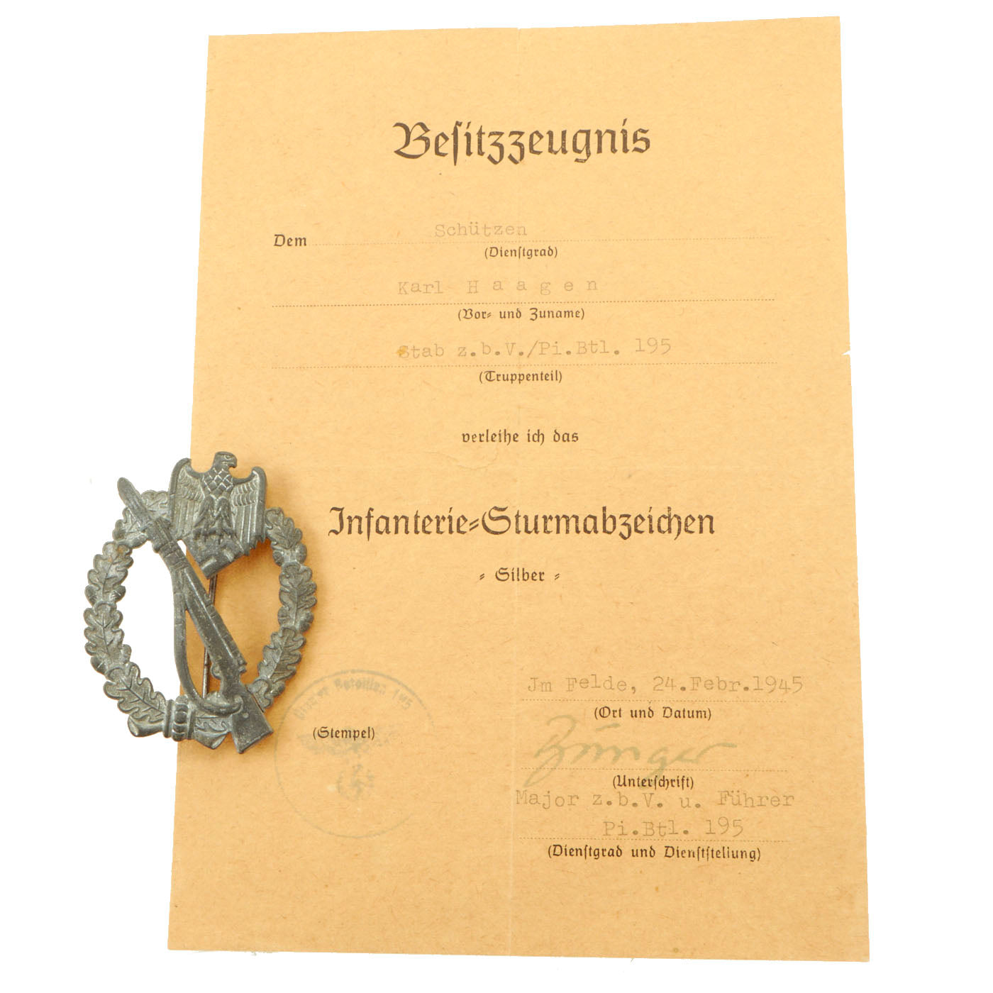 Original Items: Only One Available. This is a very nice example of a German WWII Infantry Assault Badge, complete with its original named and dated Besitzzeugnis "possession/award" certificate!