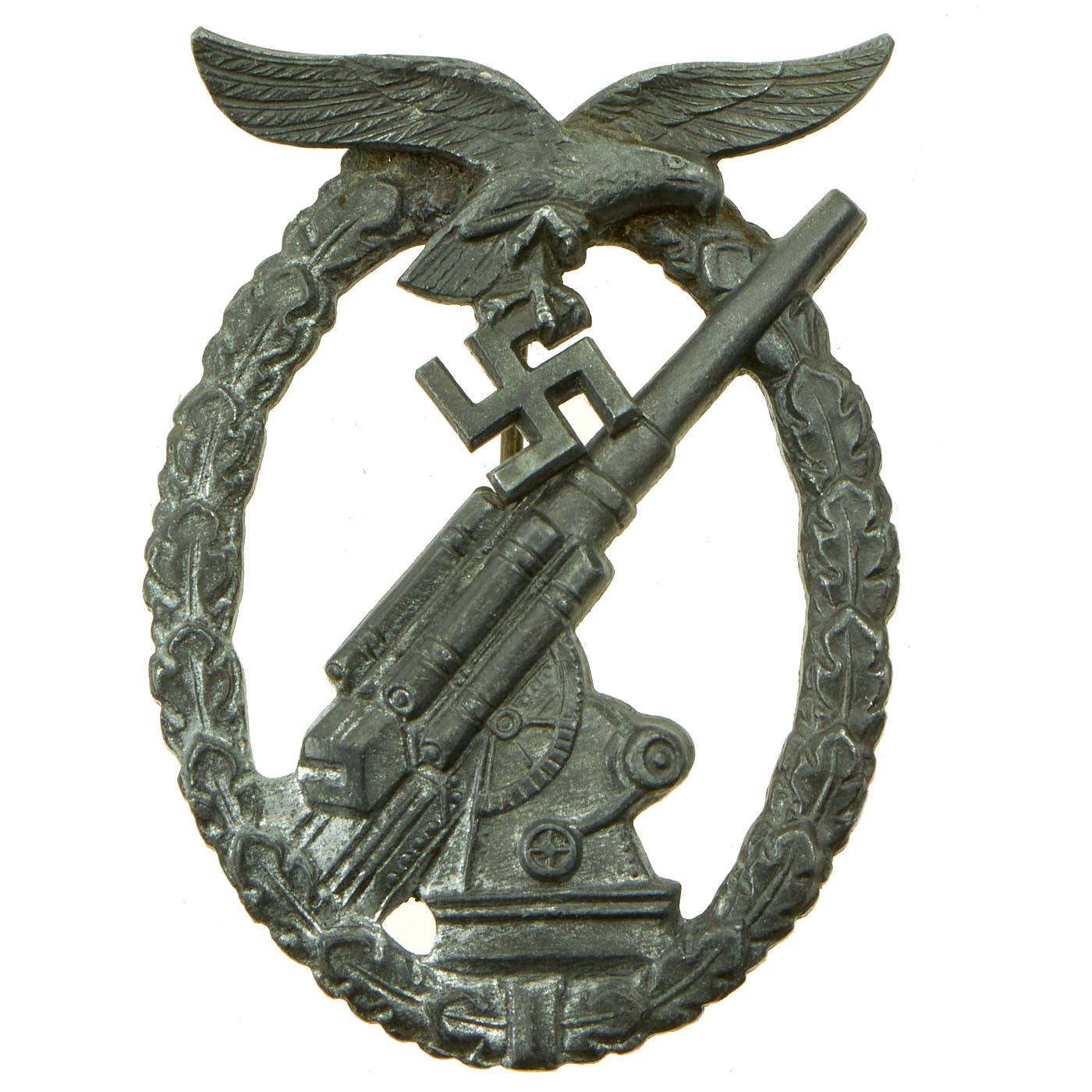 Designed by Wilhelm Ernst Peekhaus, the badge was of single piece construction with a pin back and clasp. It was made in one grade; it had a Luftwaffe eagle at the top, and an oak leaf wreath around the outside rim. In the middle was an 88 mm flak gun with the barrel facing upwards to the right. The badge was worn on the lower part of the left breast pocket of the service tunic, underneath the 1st class Iron Cross if awarded.