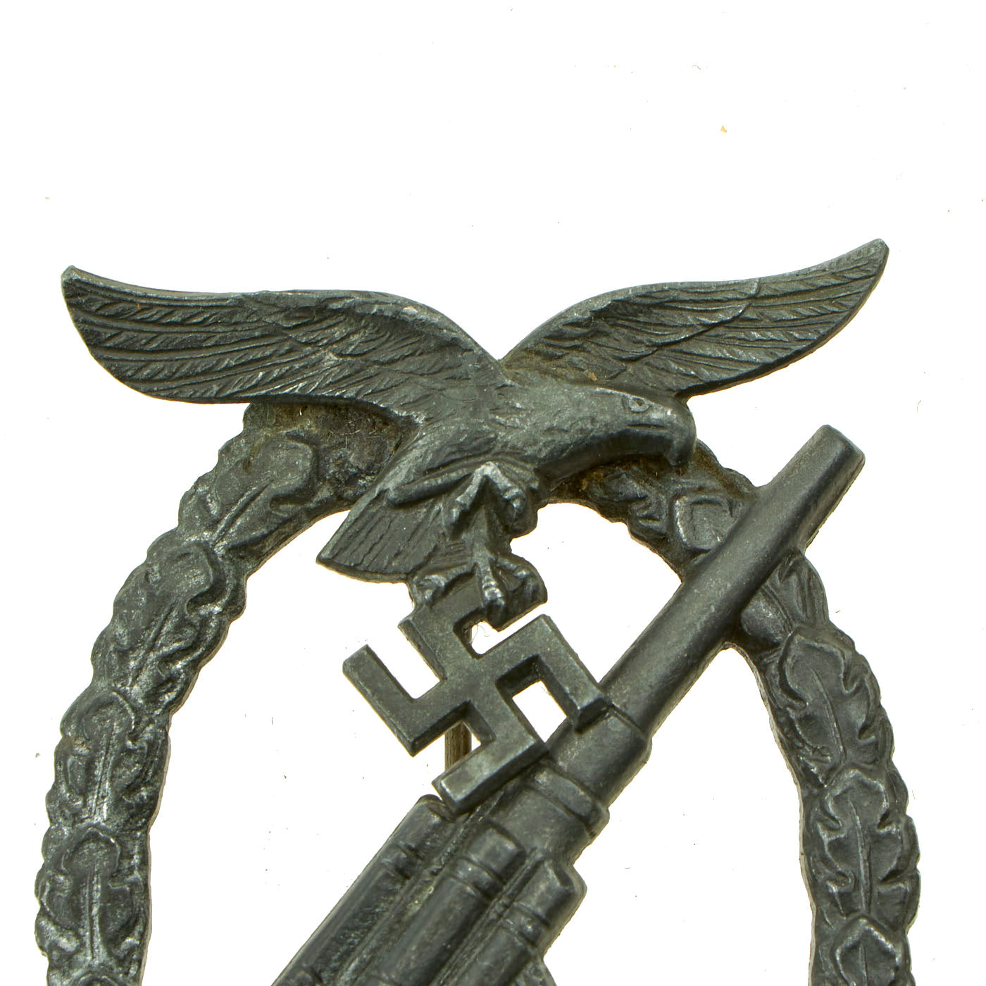 Original Items: Only One Available. This is a very nice Luftwaffe Anti-Aircraft Flak Battle Badge (Flak-Kampfabzeichen der Luftwaffe). It is a textbook example, consisting of an oak leaf wreath, with a ribbon on the bottom, and a Luftwaffe eagle on the top of the badge, clutching a swas, and a Flak 88 facing towards the top right, with the barrel extending past the badge. It looks to be made of tombak or another zinc alloy, and is a solid back design, with a nice slightly vaulted contour.
