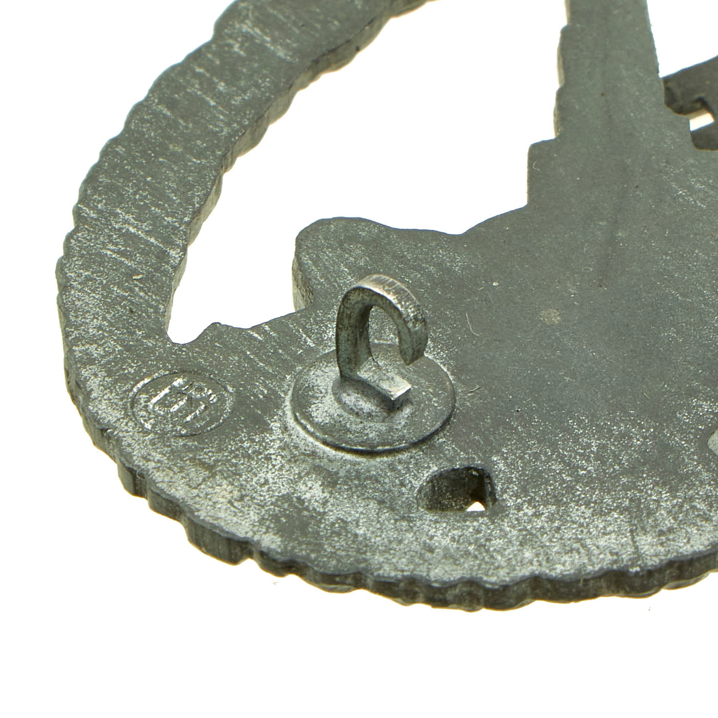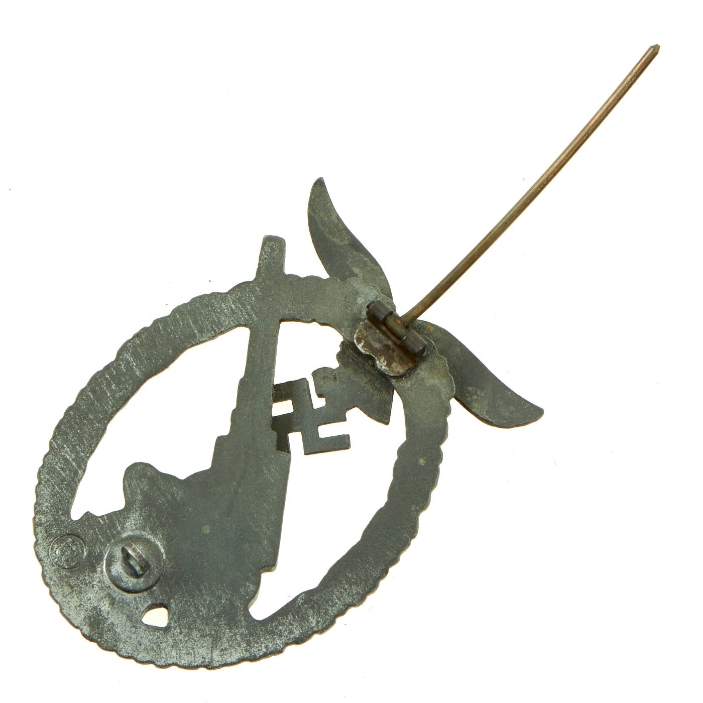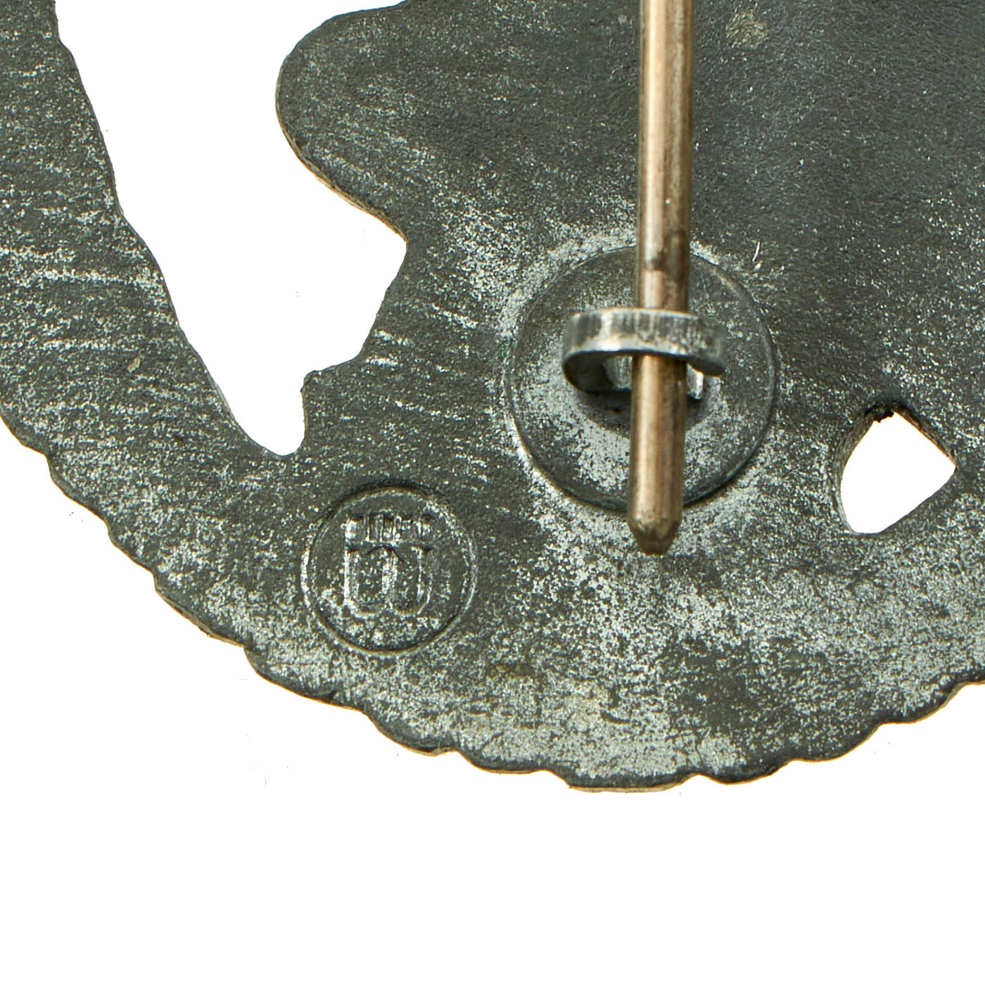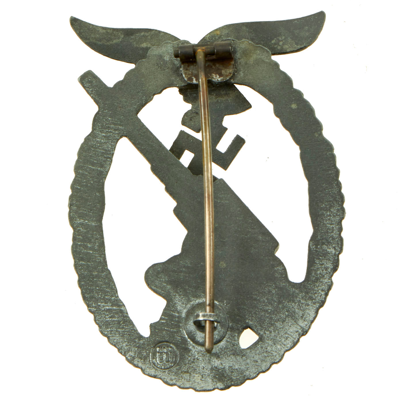 The back of the badge has a vertical needle style pin, with a barrel hinge, and a flat wire catch; measuring 2.4 inches (61 mm) x 1.7 inches (43 mm); offered in very good condition. The reverse of the award is maker marked with a W with four dots over it, sometimes referred to as "ÜÜ", the trademark logo of E. Ferdinand Wiedmann of Frankfurt.