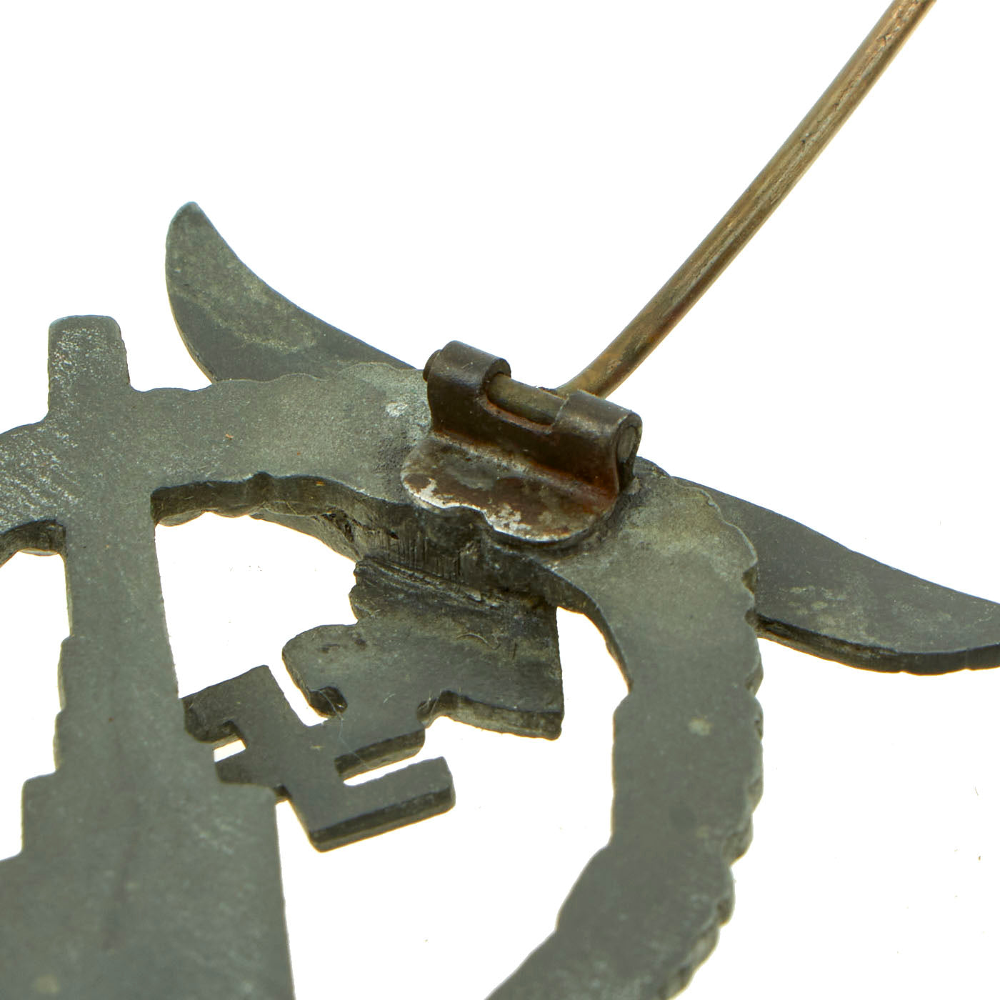 The details are still all there on this badge, with minimal wear, and there is even some of the original silver wash present. Areas where it has worn are now a slightly dull zinc color.