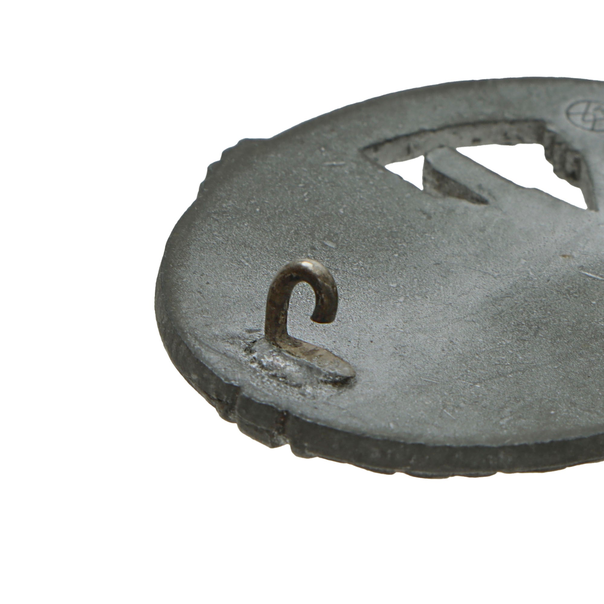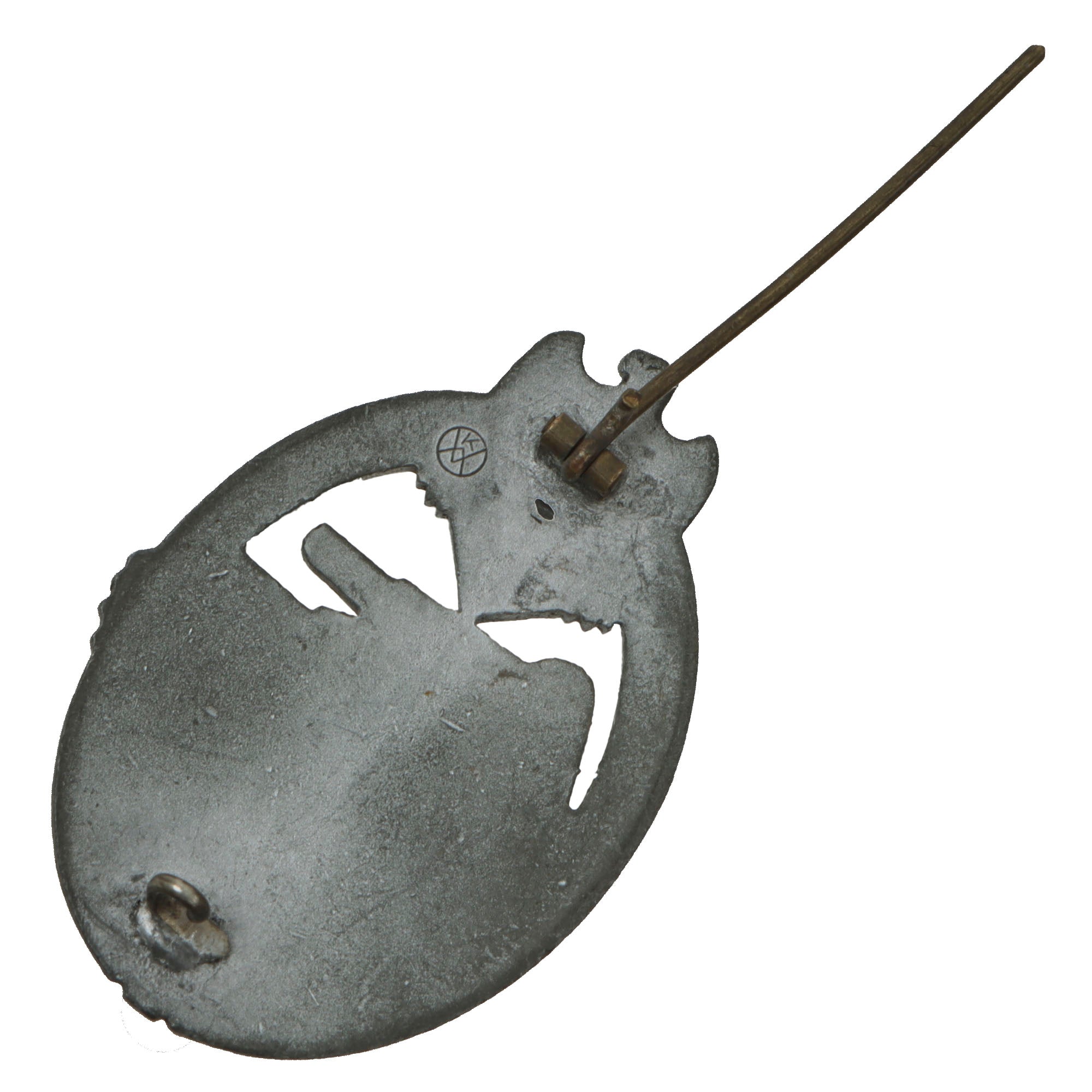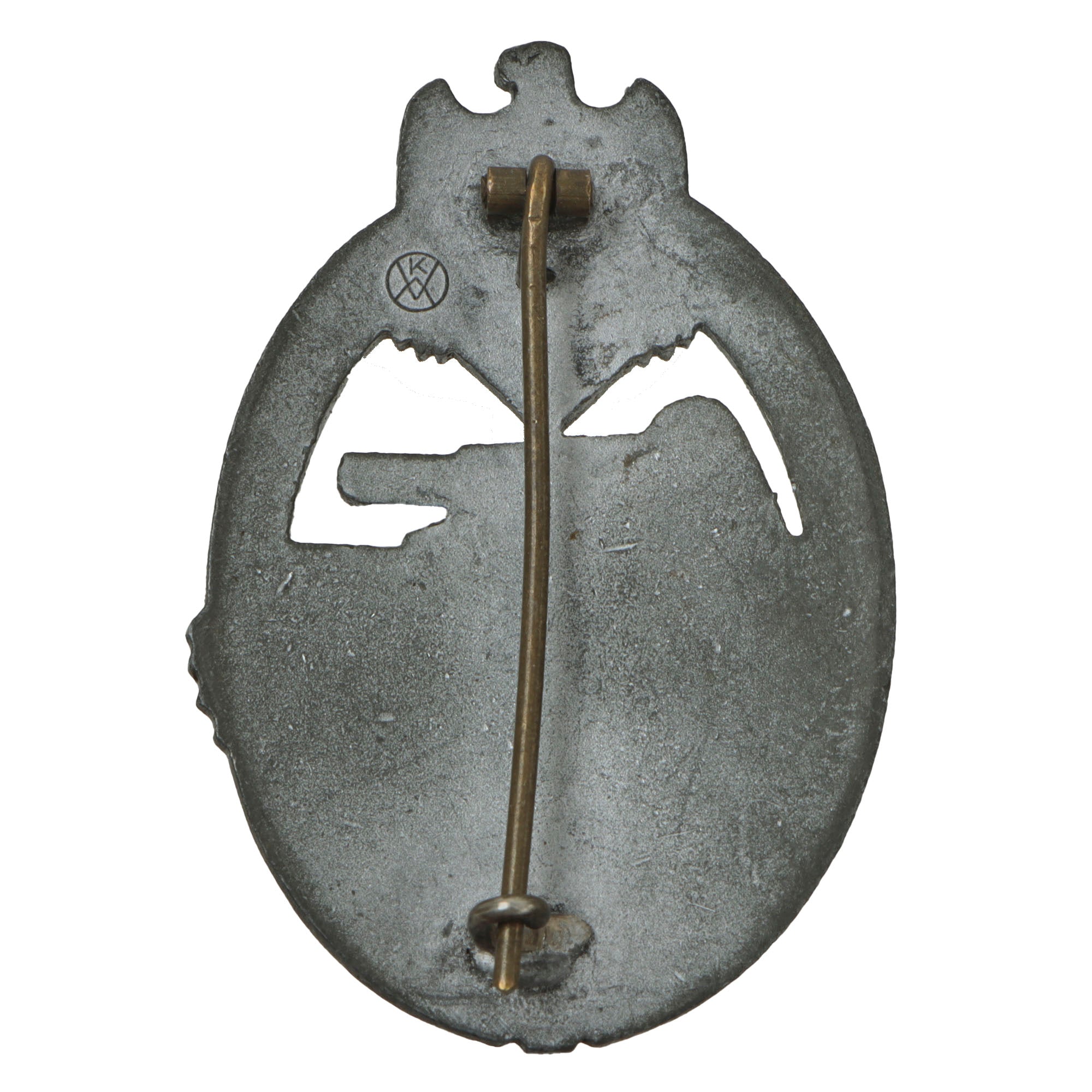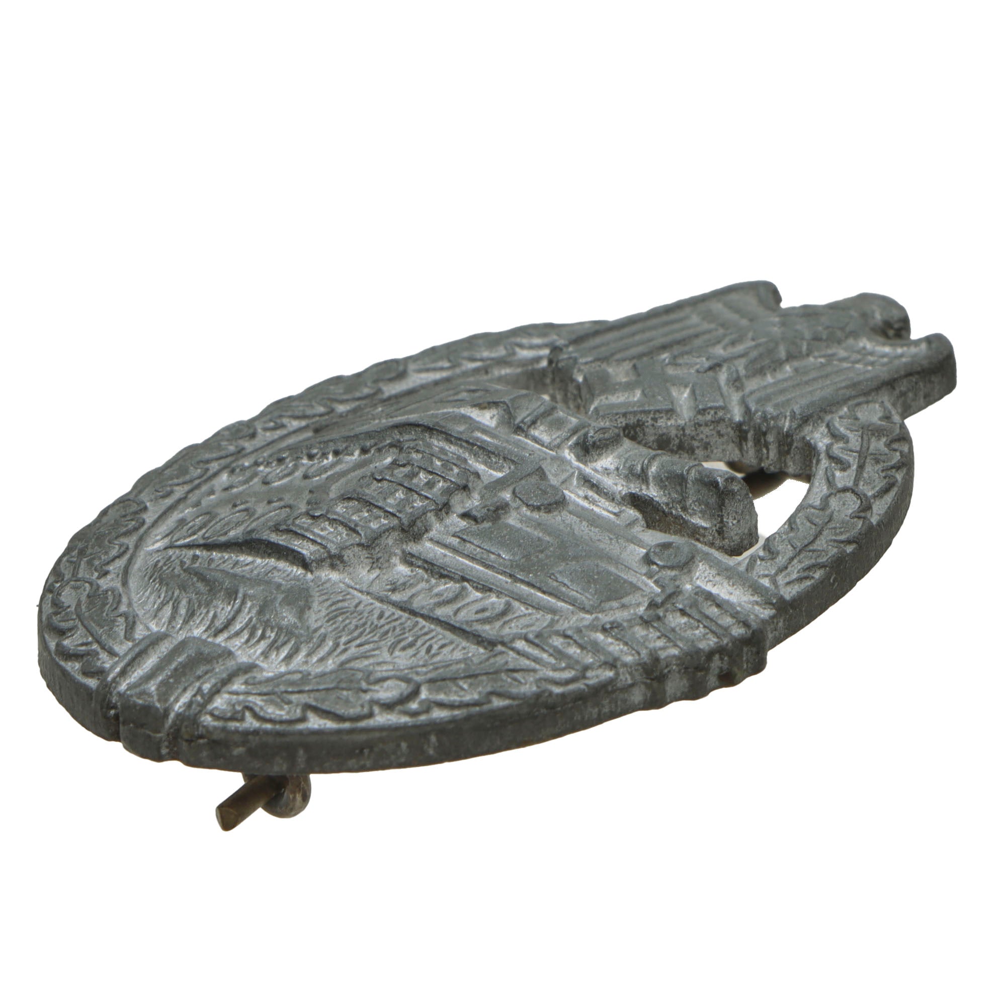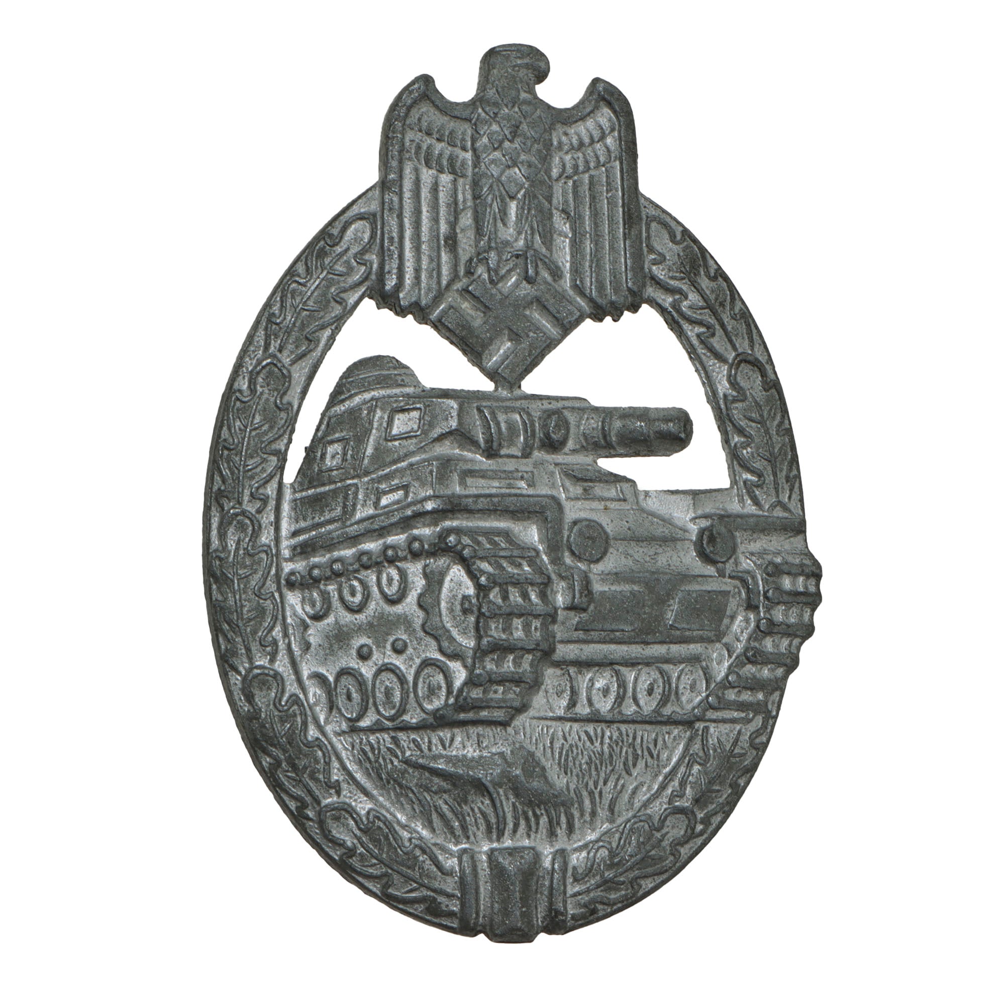 This lovely wartime pattern example in Silver grade is constructed of oval shaped zinc alloy with a silver wash. This example looks to have retained much of the silvering, unlike many that we see, and now shows a lovely light oxidized patina, with the base metal visible on the edges and raised areas of the design. The design is iconic, the front has a border of oak leaves tied at the base, a Heer-style national eagle clutching a mobile swas (hook cross) perches at the top of the wreath, a Panzerkampfwagen IV superimposed in the center on grassy ground, with its left tank track extending over the edge of the badge.