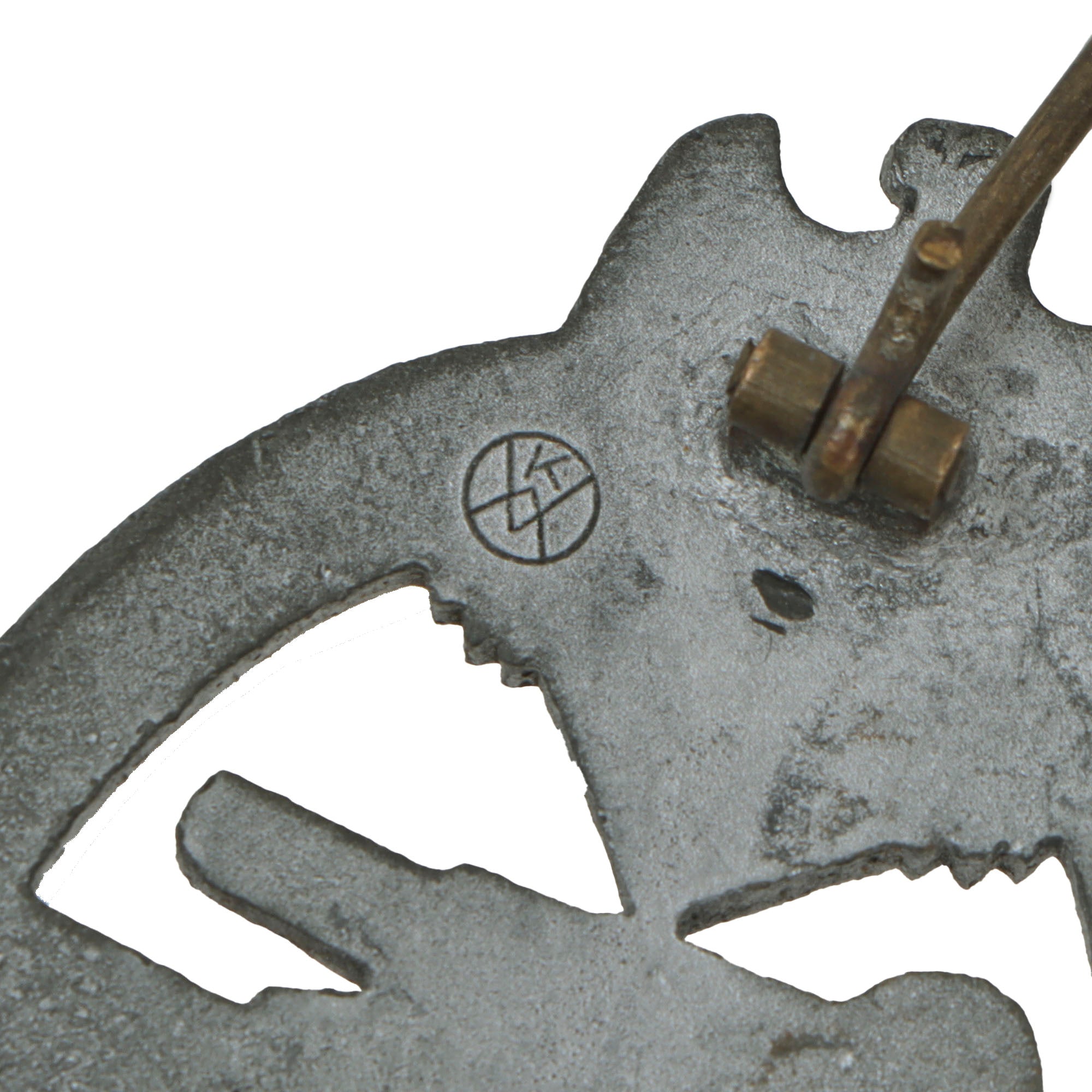 The reverse plain with a vertical non-magnetic pin, a soldered on bent "barrel" hinge, and a round wire catch. To the left of the hinge is a stylized K W in a circle, the maker mark of Karl Wurster of Markneukirchen in Saxony, Germany, a known and desirable maker of this badge. Measuring 1.64 inches (41.65 mm) W x 2.36 (60.06 mm) H. Offered in overall very good condition, with all the details still present, as well as much of the original silver wash.