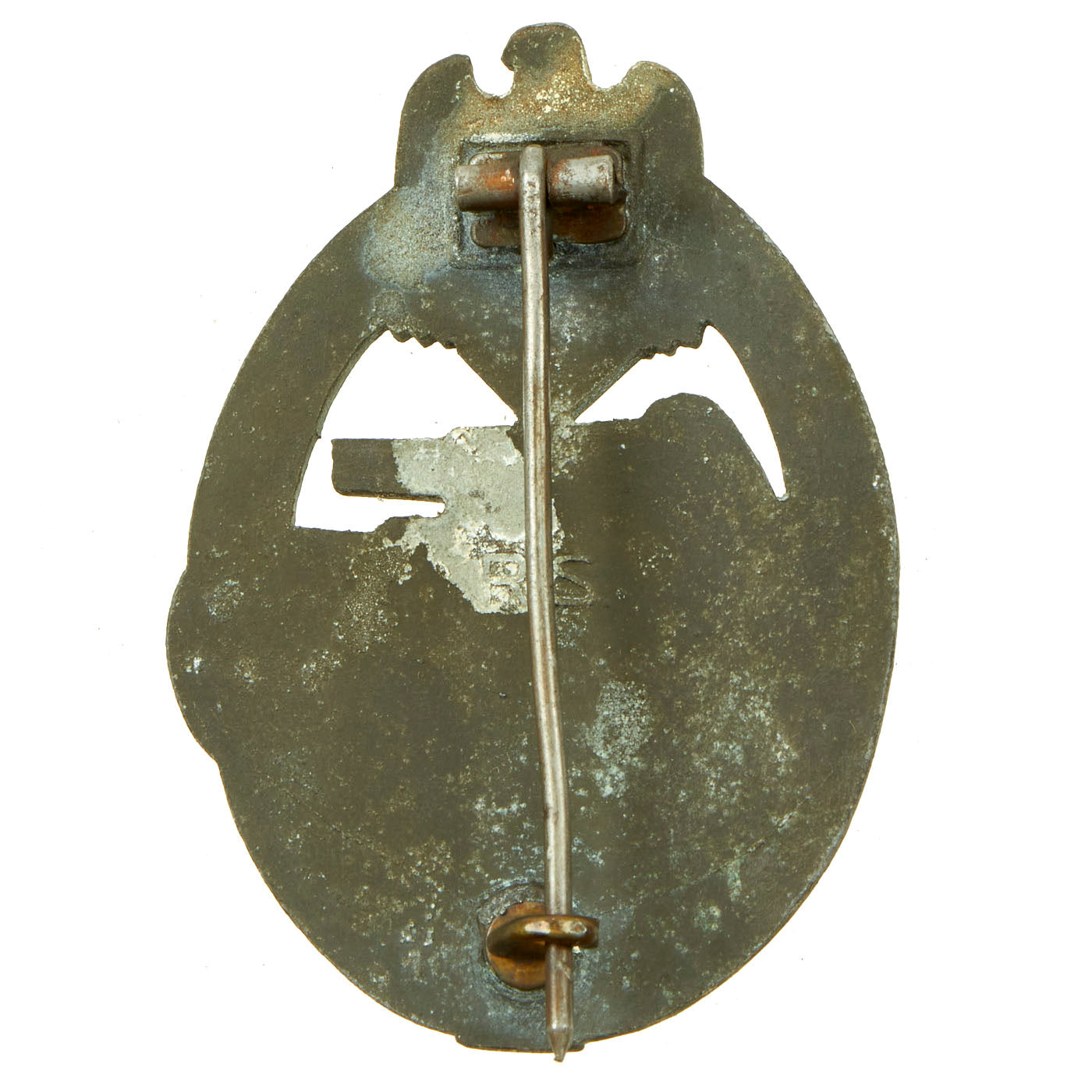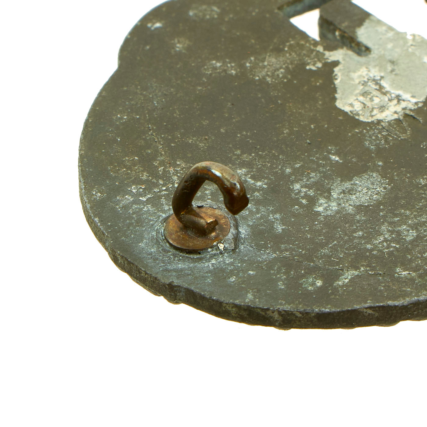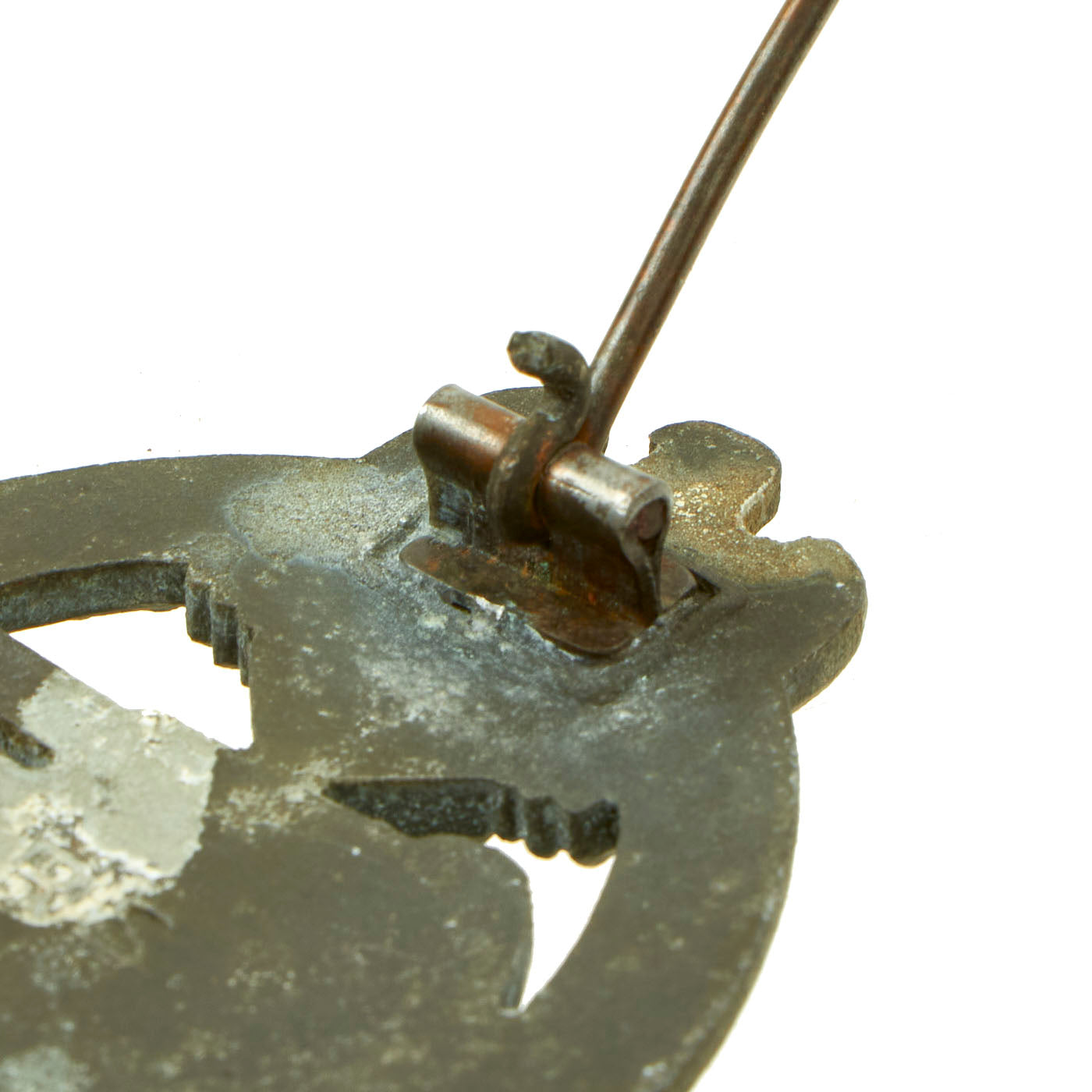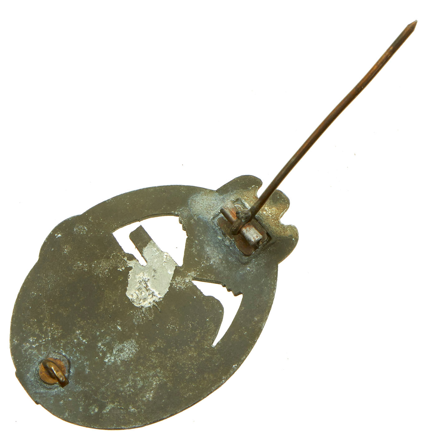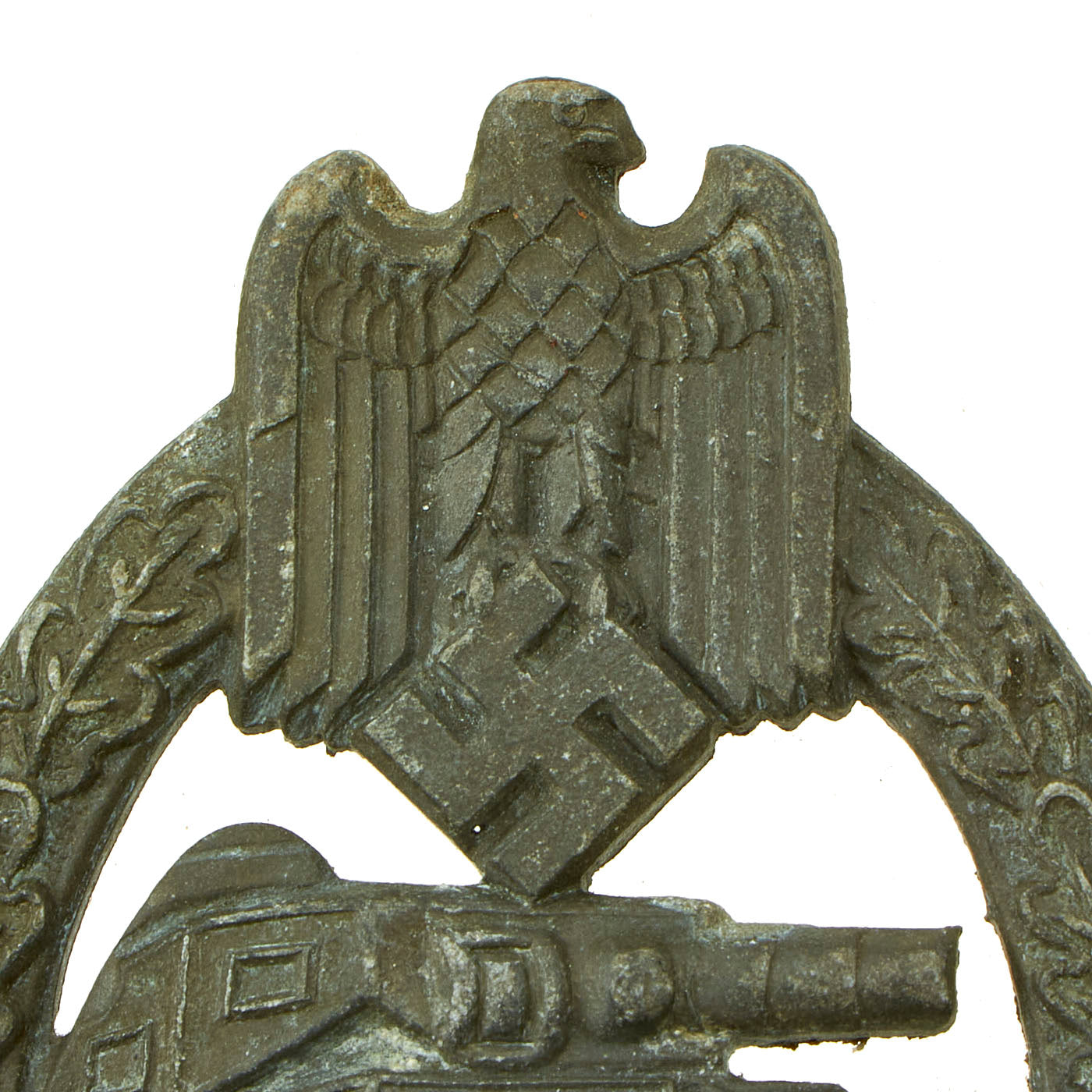 This very nice example in Silver grade is constructed of oval shaped zinc with a silver wash. Like almost all of the later issued badges, the wash is almost completely missing, however traces can be seen on the back, on and around the magnetic securing pin. The design is iconic, the front has a border of oak leaves tied at the base, a Heer-style national eagle clutching a mobile swas (hook cross) perches at the top of the wreath, a Panzerkampfwagen IV superimposed in the center on grassy ground, with its left tank track extending over the edge of the badge. The reverse is plain with a vertical needle style pin, a hinge, and a round wire catch with maker mark R. S. in the center, which represents manufacture by Rudolf Souval of Wien (Vienna), Austria. Measuring 1.64 inches (41.65 mm) W x 2.36 (60.06 mm) H. Offered in overall very good condition, with all the details still present, and a functional pinback.
