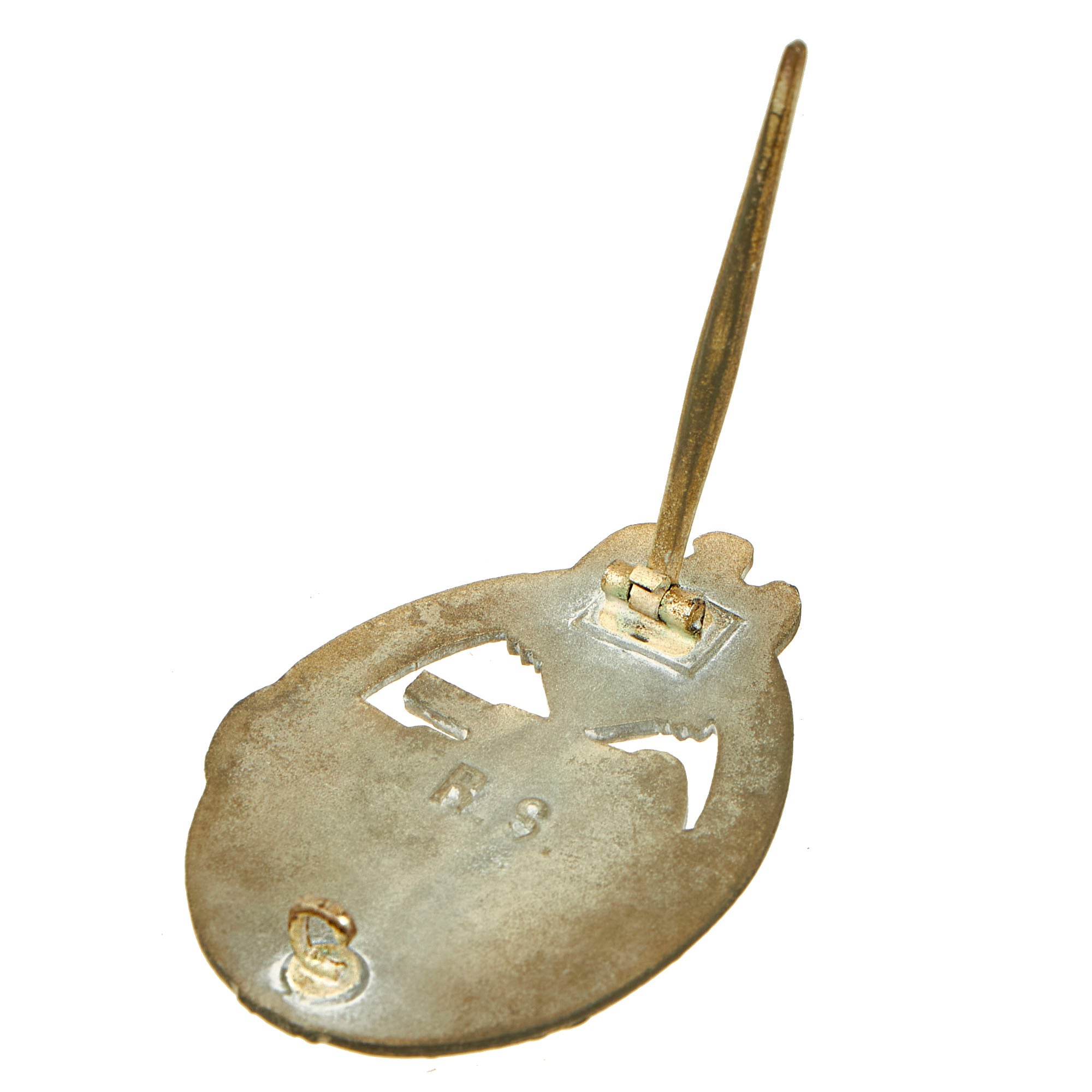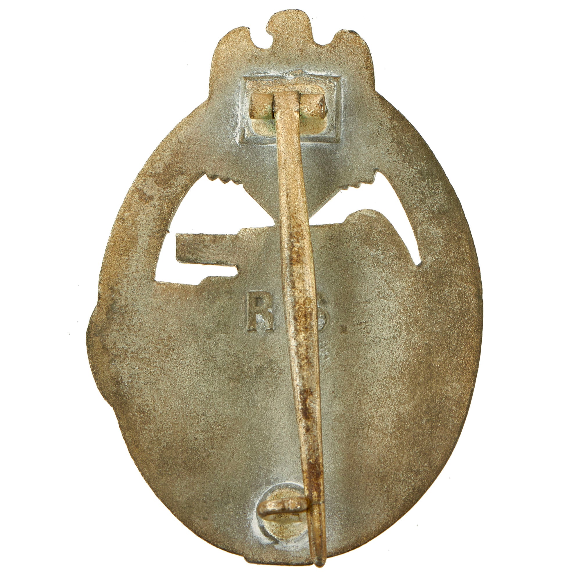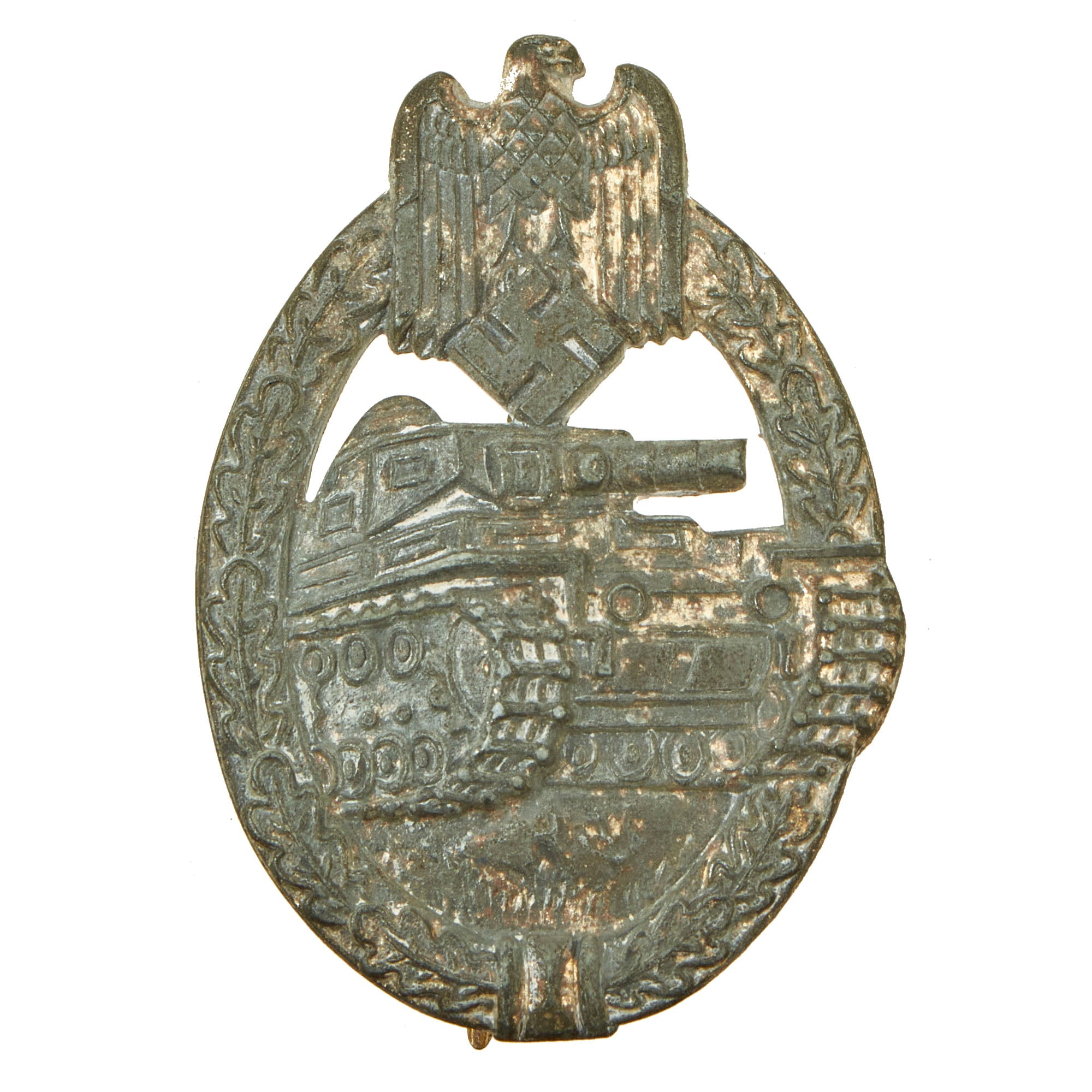 This very nice example in Silver grade is constructed of oval shaped zinc with a silver wash. Like almost all of the later issued badges, the silver wash did not adhere well to the zinc, so the front only retains traces of it in the recesses of the design. The rear shows much more present, especially on the pin and catch. The design is iconic, the front has a border of oak leaves tied at the base, a Heer-style national eagle clutching a mobile swas (hook cross) perches at the top of the wreath, a Panzerkampfwagen IV superimposed in the center on grassy ground, with its left tank track extending over the edge of the badge. The reverse is plain with a vertical needle style pin, a hinge, and a round wire catch with maker mark R. S. in the center, which represents manufacture by Rudolf Souval of Wien (Vienna), Austria. Measuring 1.64 inches (41.65 mm) W x 2.36 (60.06 mm) H.