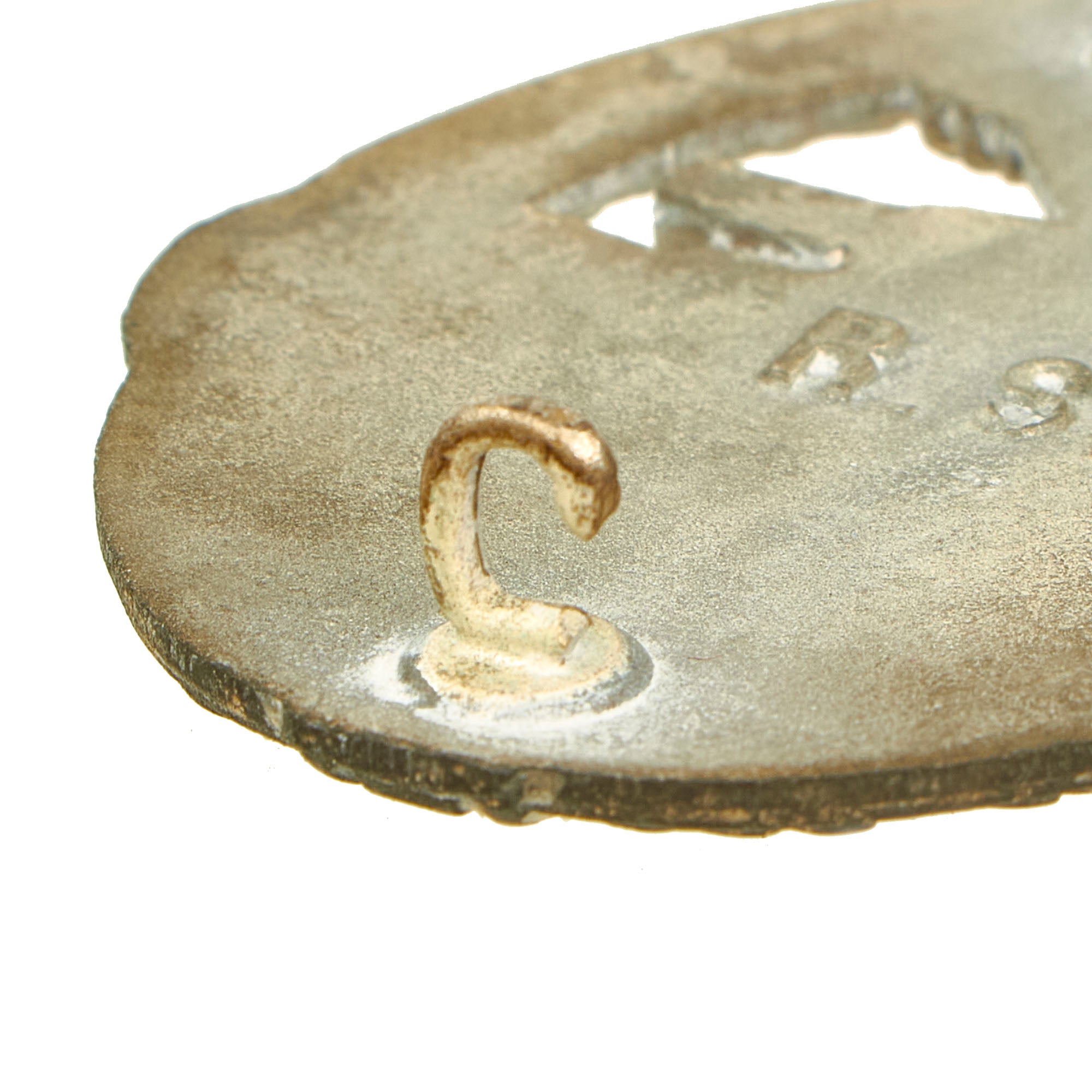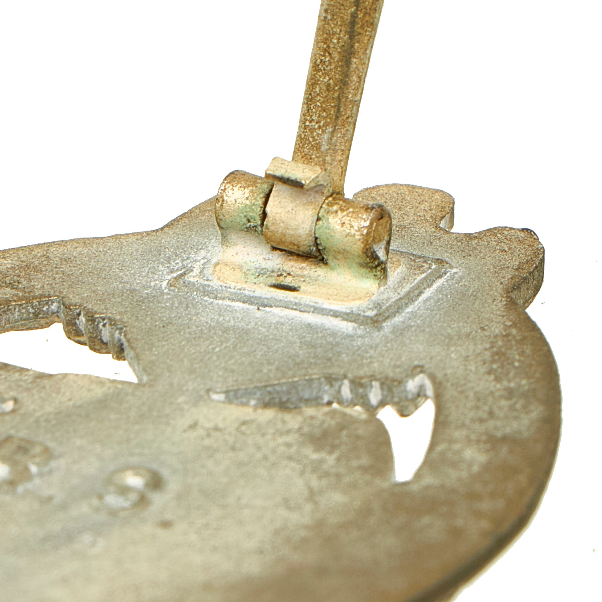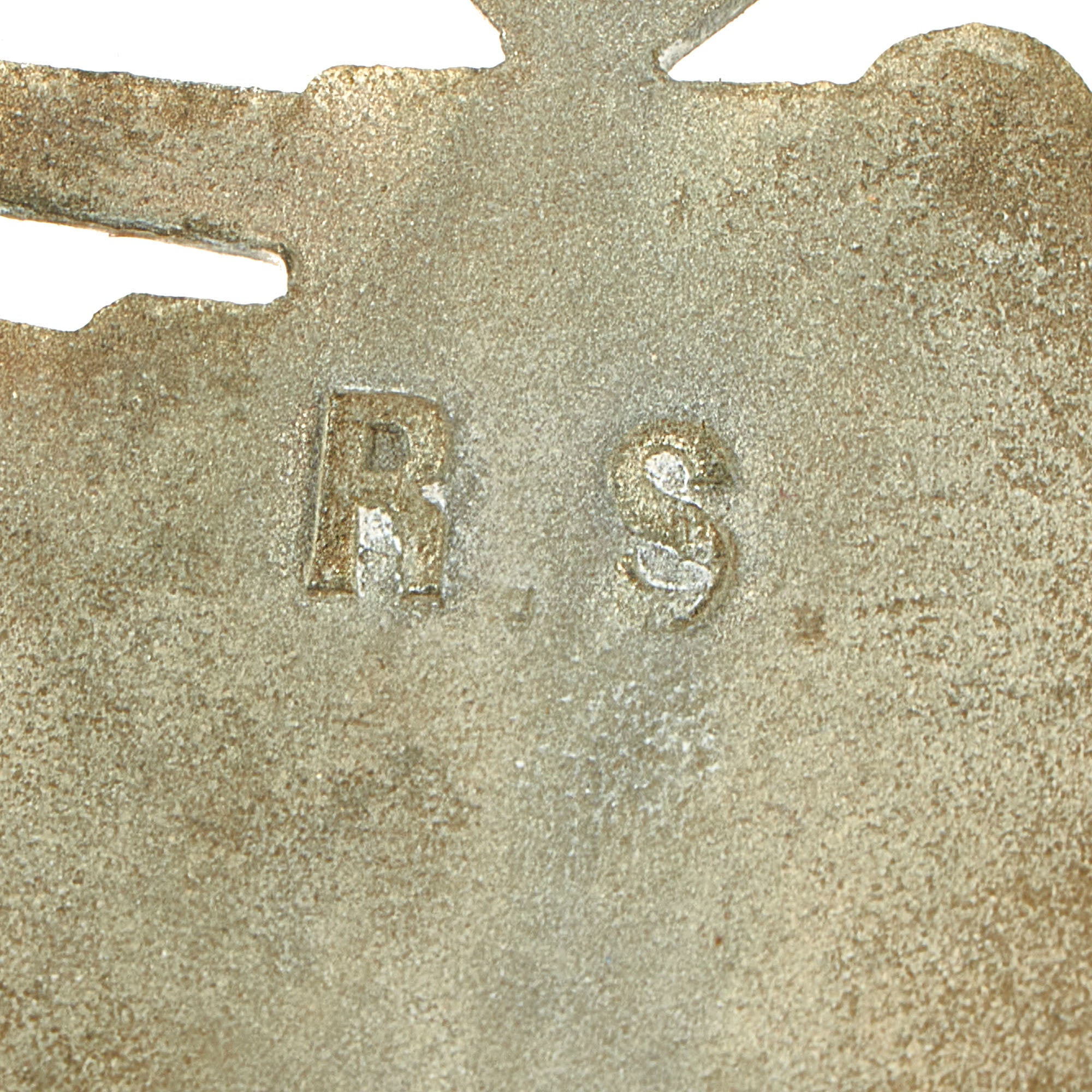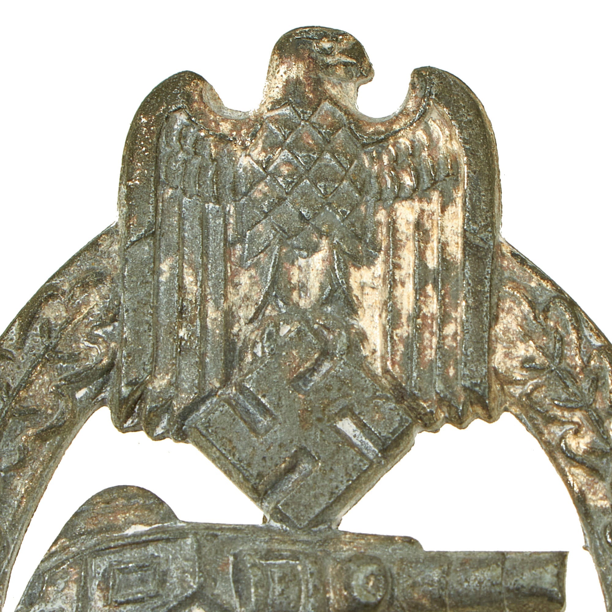 This very nice example in Silver grade is constructed of oval shaped zinc with a silver wash. Like almost all of the later issued badges, the silver wash did not adhere well to the zinc, so the front only retains traces of it in the recesses of the design. The rear shows much more present, especially on the pin and catch. The design is iconic, the front has a border of oak leaves tied at the base, a Heer-style national eagle clutching a mobile swas (hook cross) perches at the top of the wreath, a Panzerkampfwagen IV superimposed in the center on grassy ground, with its left tank track extending over the edge of the badge. The reverse is plain with a vertical needle style pin, a hinge, and a round wire catch with maker mark R. S. in the center, which represents manufacture by Rudolf Souval of Wien (Vienna), Austria. Measuring 1.64 inches (41.65 mm) W x 2.36 (60.06 mm) H.