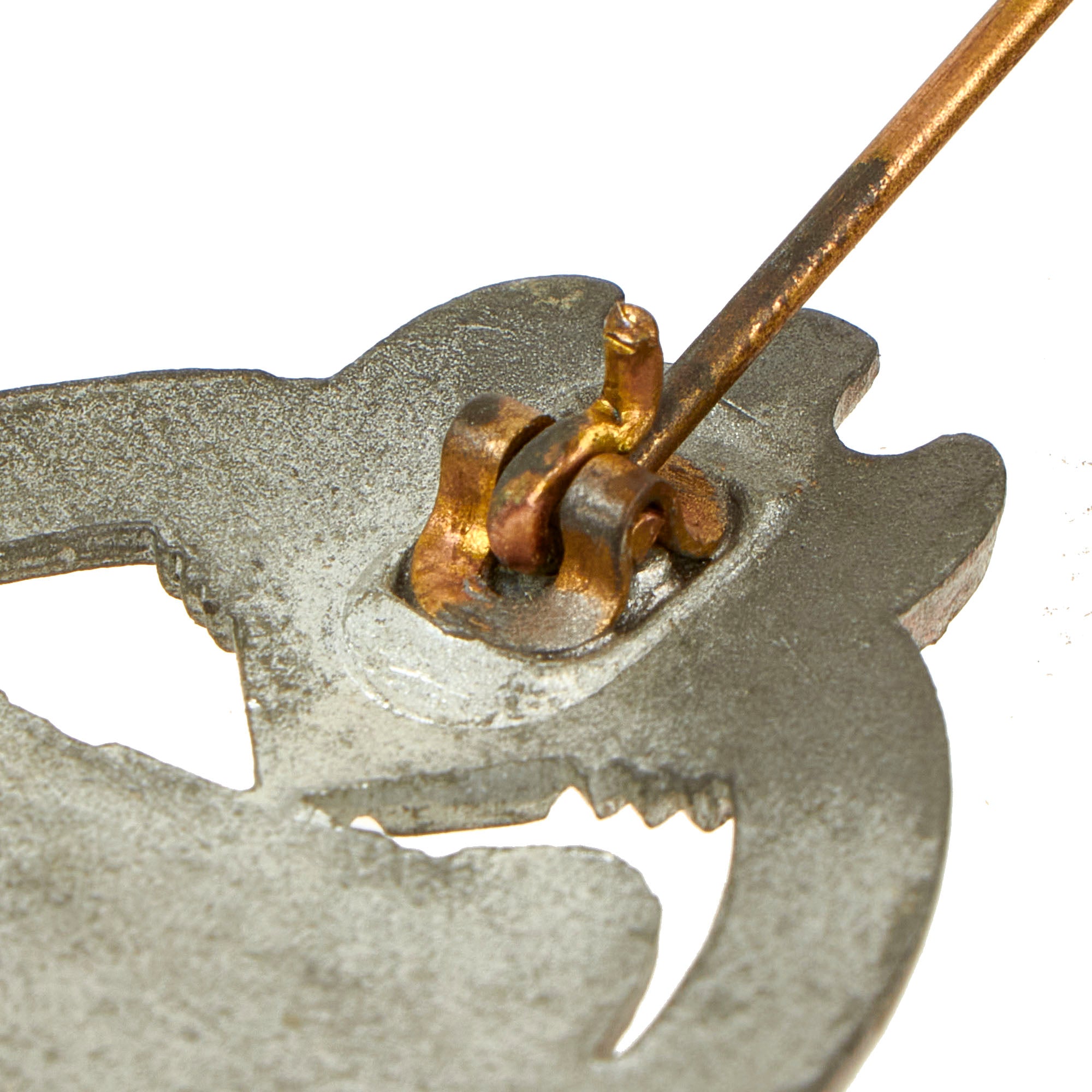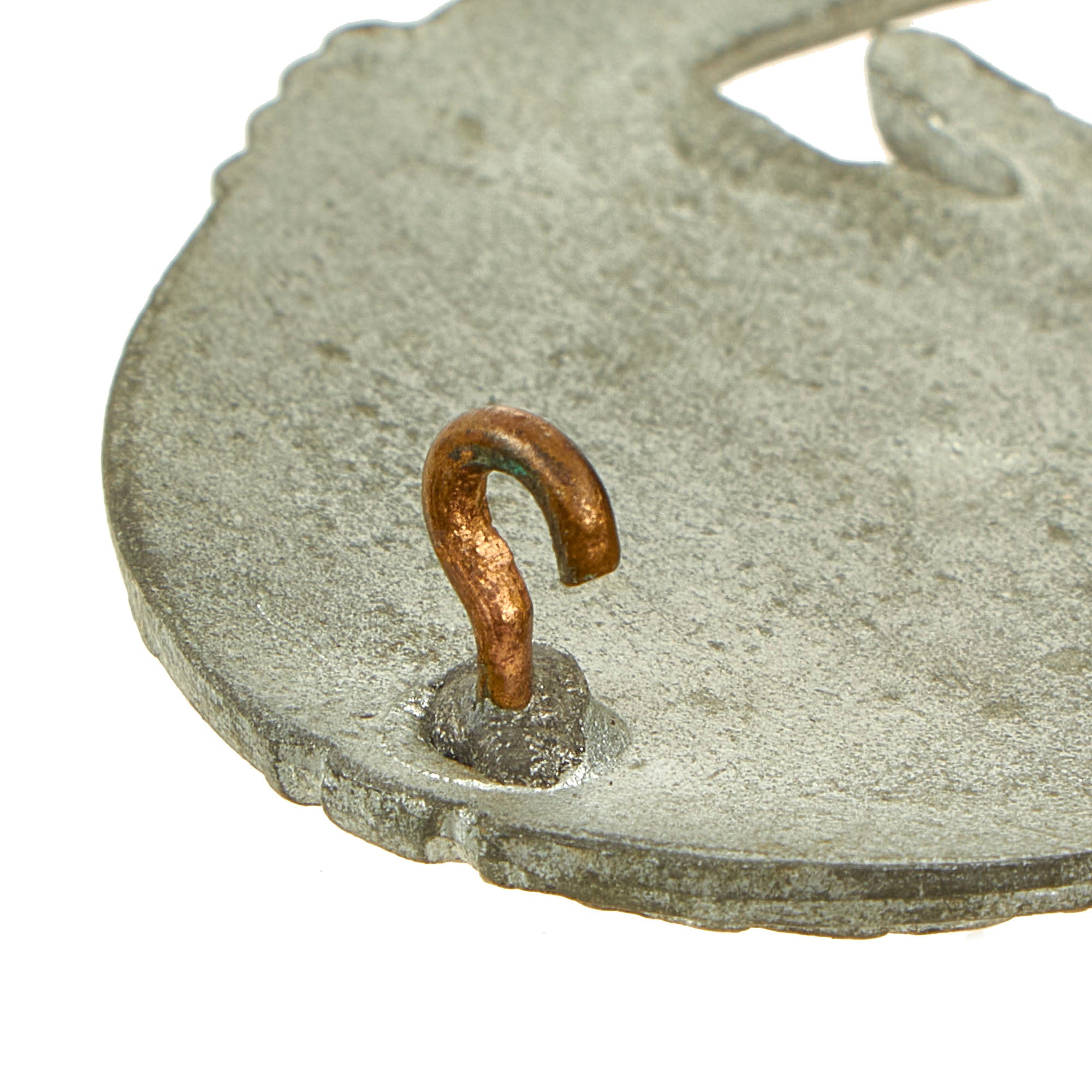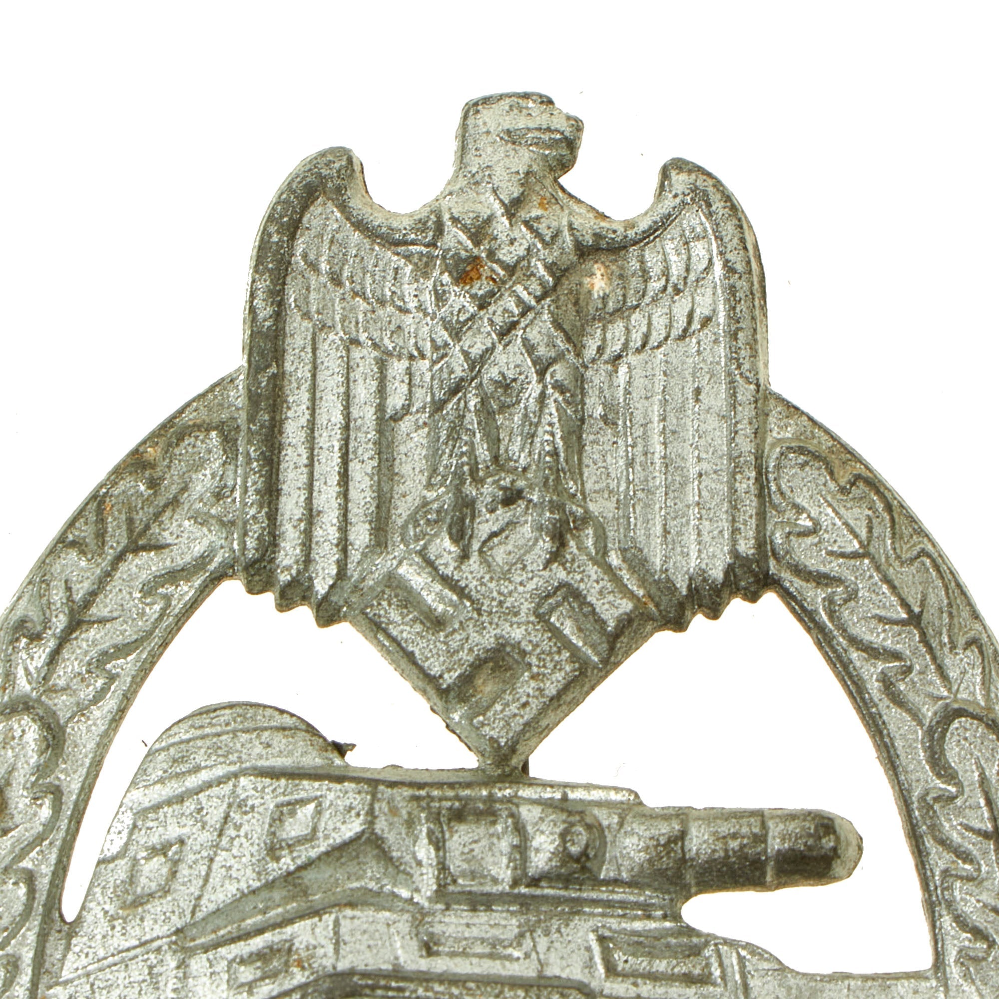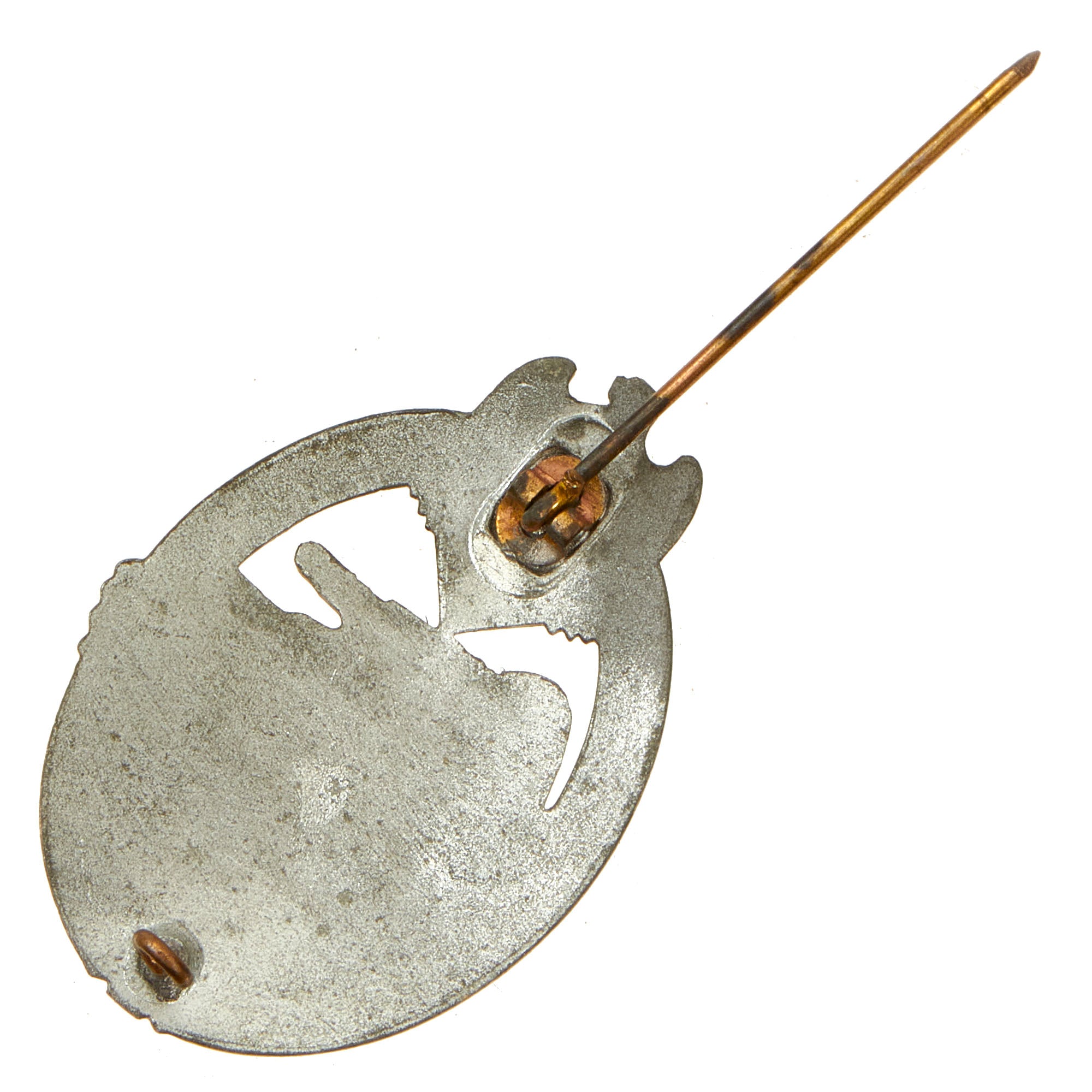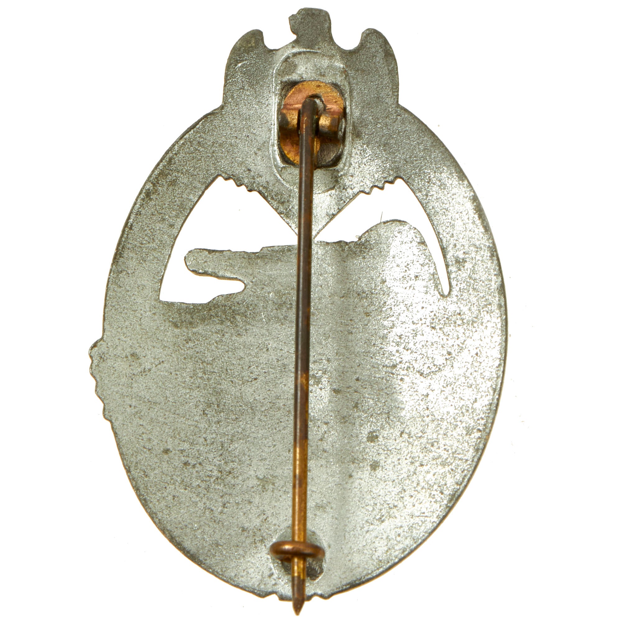 This very nice example in Silver grade is constructed of oval shaped zinc with a silver wash. Unlike almost all examples we see, this badge still has over 85% of the original wash intact and shiny! The design is iconic, the front has a border of oak leaves tied at the base, a Heer-style national eagle clutching a mobile swas (hook cross) perches at the top of the wreath, a Panzerkampfwagen IV superimposed in the center on grassy ground, with its left tank track extending over the edge of the badge. Measuring 1.64 inches (41.65 mm) W x 2.36 (60.06 mm) H. Offered in overall very good condition, with all the details still present, and a functional pinback.