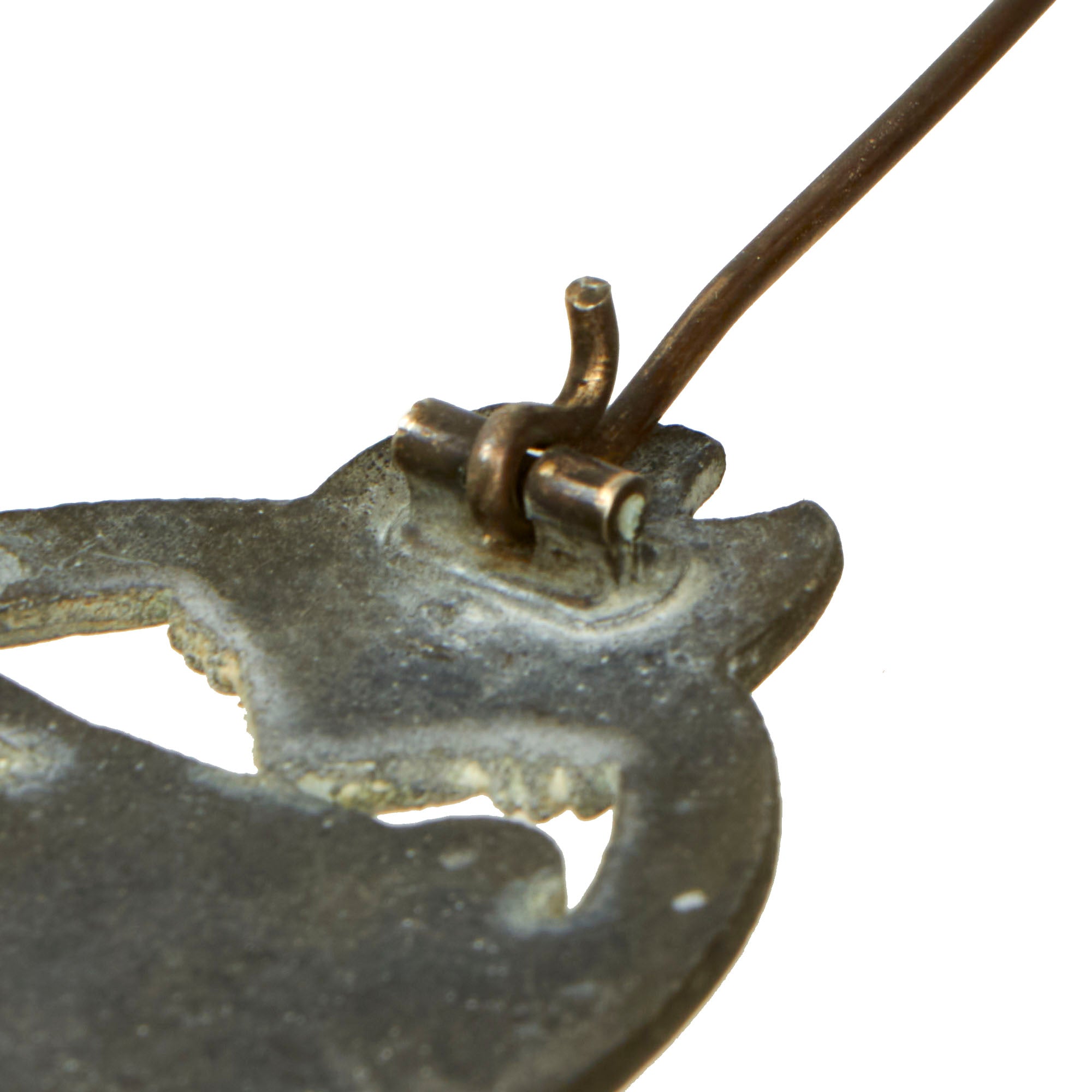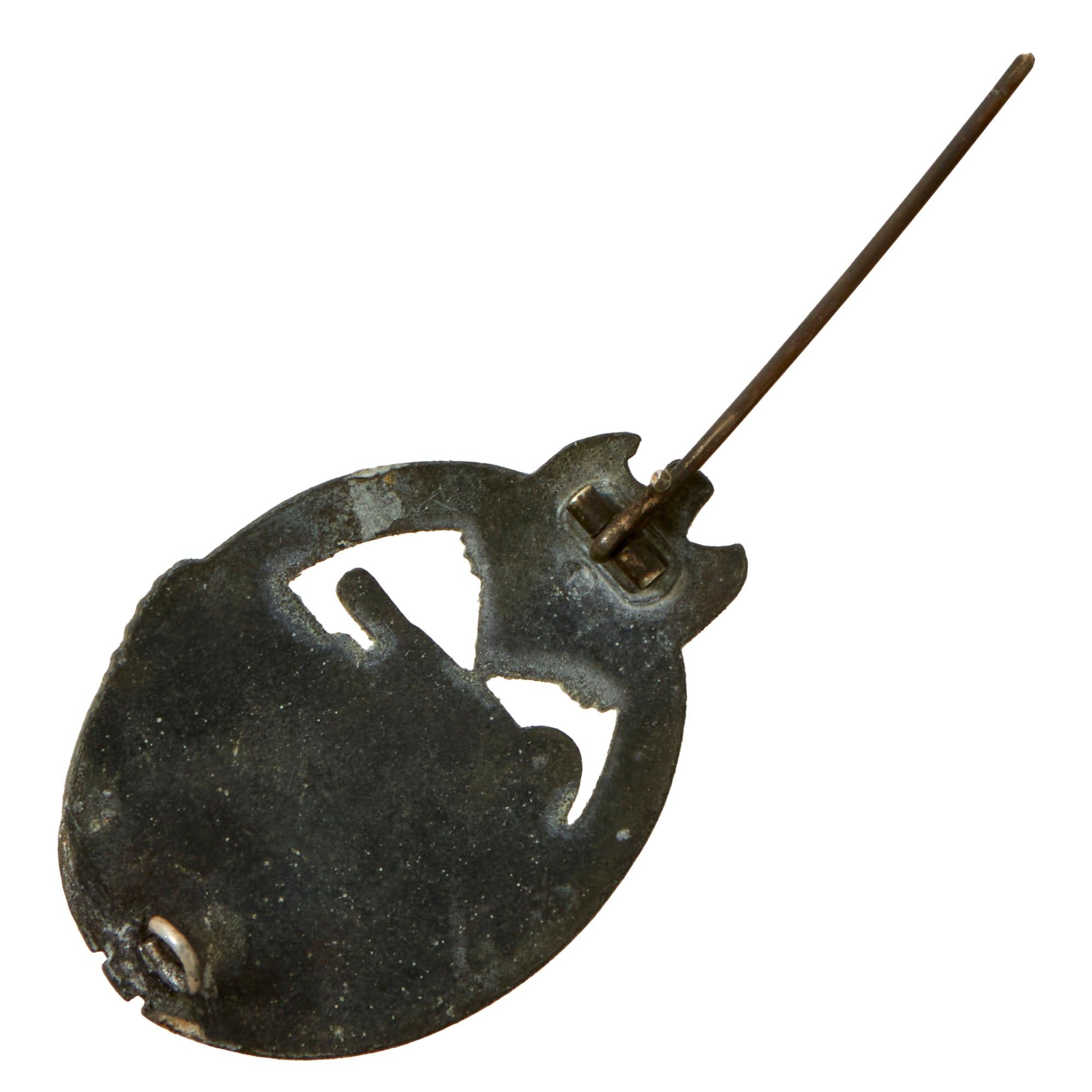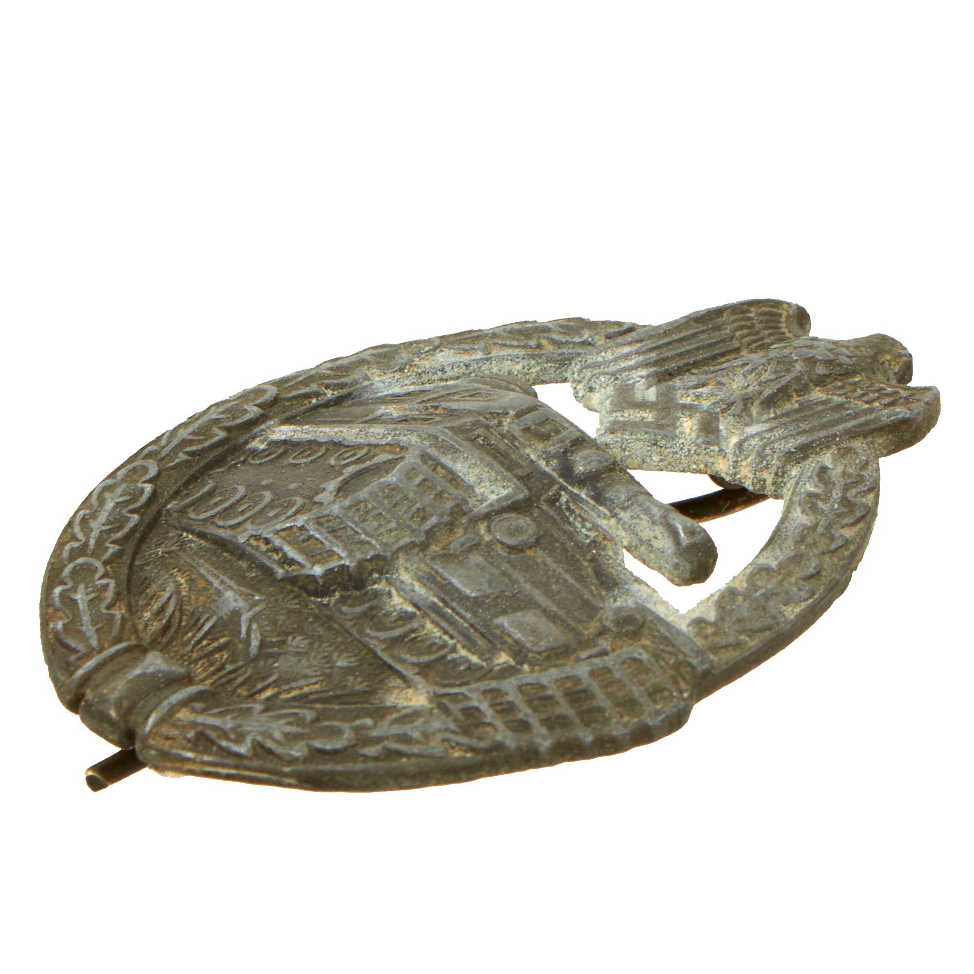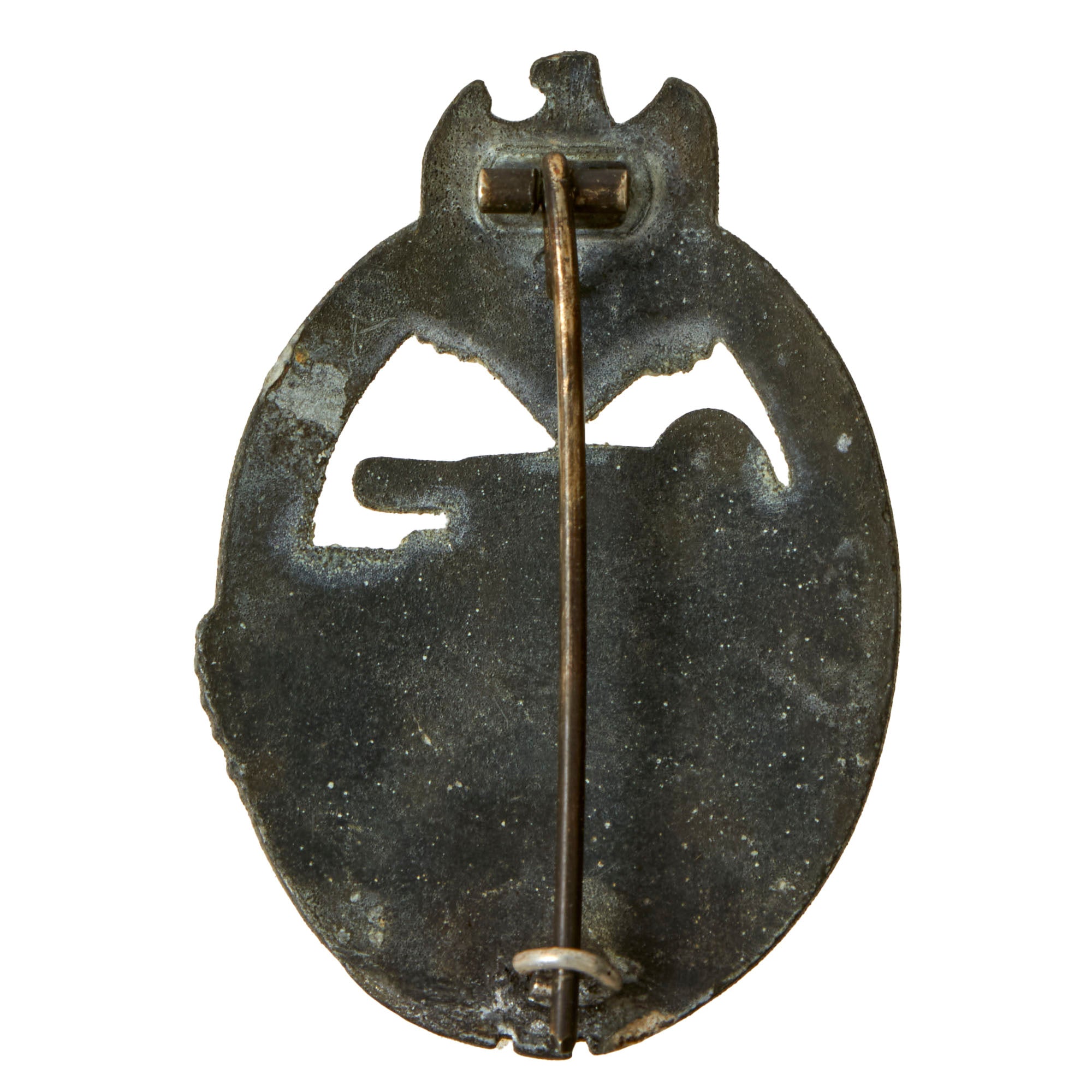 This very nice example in Silver grade is constructed of oval shaped die cast with a silver wash, which has had the original silver wash fade to a dark tarnished patina overall, with areas of wear through on the obverse of the badge. There also looks to be some oxidation of the zinc base metal on the front as well. The design is iconic, the front has a border of oak leaves tied at the base, a Heer-style national eagle clutching a mobile swas perches at the top of the wreath, a Panzerkampfwagen IV superimposed in the center on grassy ground, with its left tank track extending over the edge of the badge. The reverse plain with a vertical needle style pin, a crimped plated hinge, and a round wire catch. These still retain a good amount of the silver wash, though it is tarnished. Measures approximately 1.64 inches (41.65 mm) W x 2.36 (60.06 mm) H.