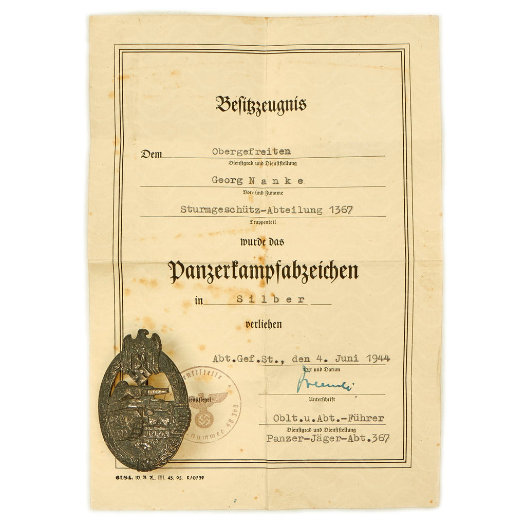 As a rare treat, this award comes complete with its original named and dated Besitzzeugnis "possession/award" certificate! The award document indicates that it was awarded to Obergefreiten George Nanke of Sturmgeschütz-Abteilung 1367 (Assault Gun Detachment 1367) on 4. Juni 1944. We have not been able to locate specific service information on Nanke, however the leader of the team who signed the document was from Panzer-Jäger-Abt. 367. We have unfortunately not been able to locate information on either of these formations.