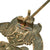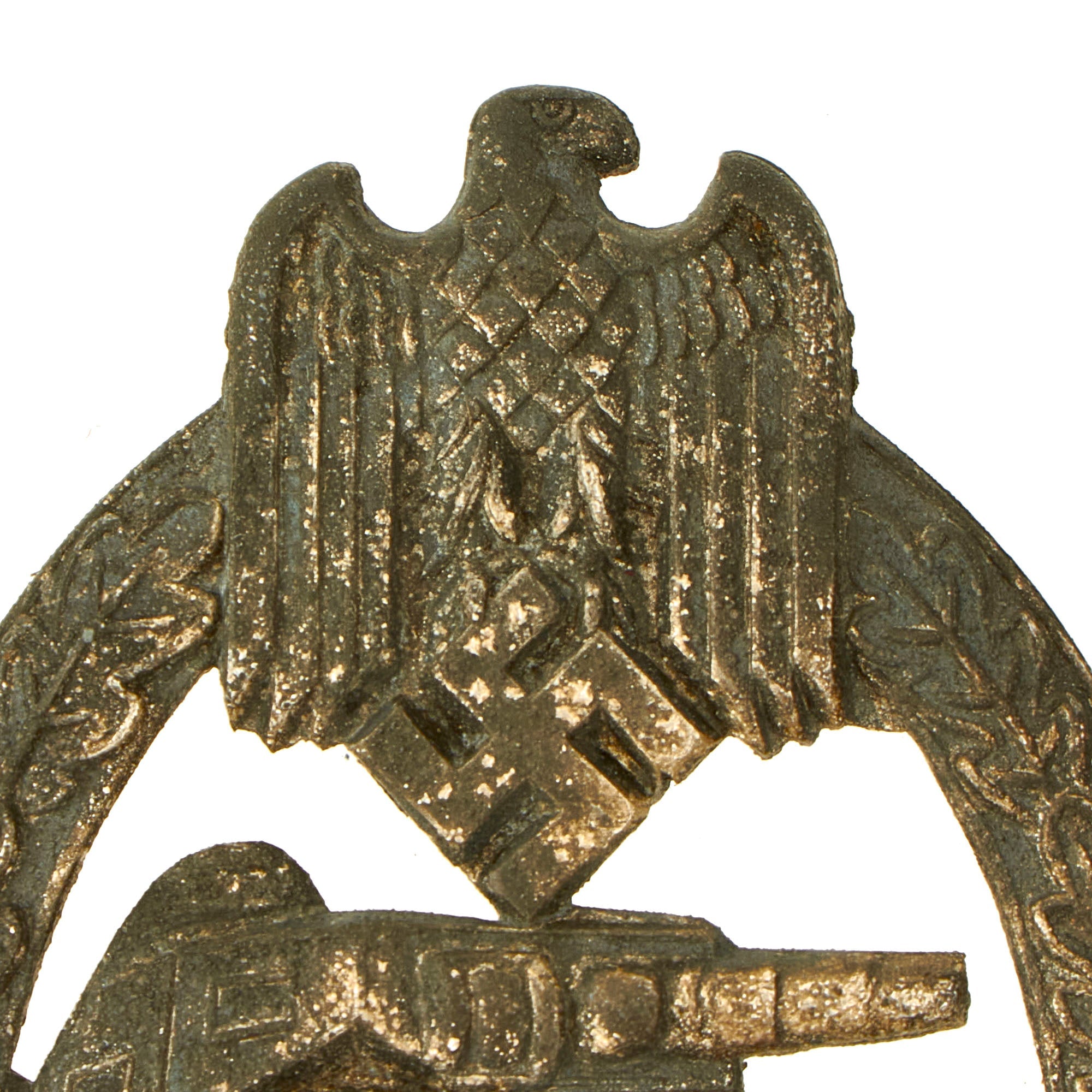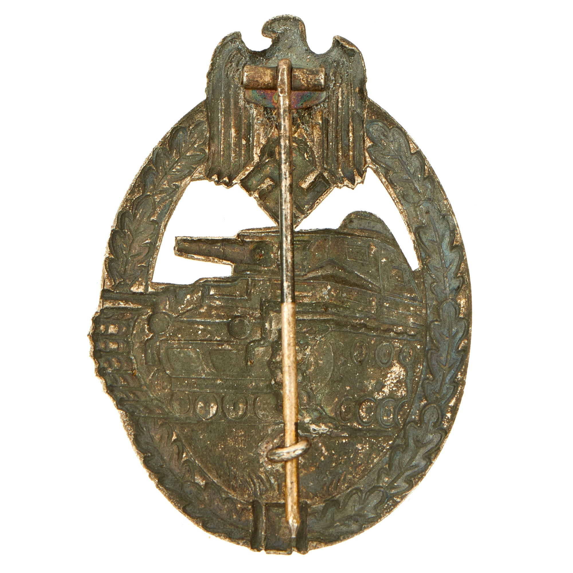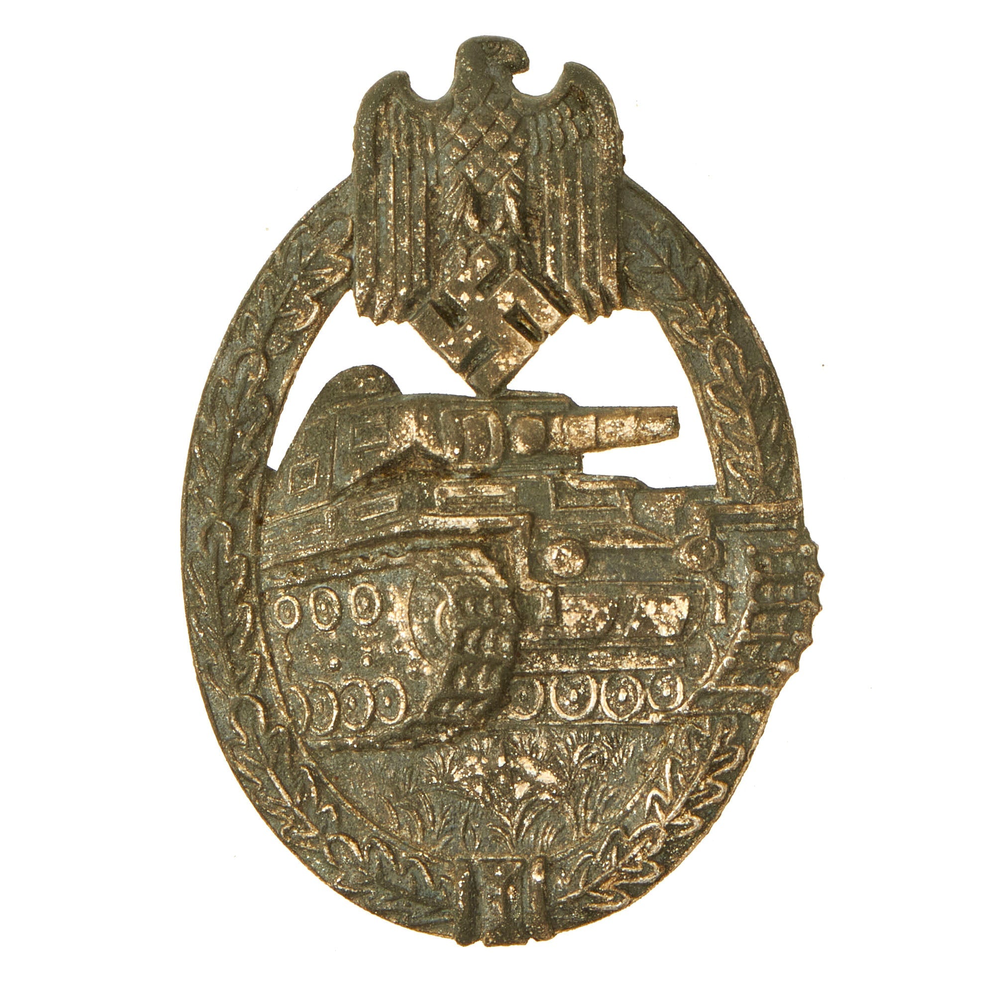 This very nice example in Silver grade is constructed of oval shaped zinc with a silver wash. It still does retain much of the silver wash on both sides, however it has oxidized to a dark tarnished patina on both the front and the back. This gives it a lovely color, almost a dark blue. The design is iconic, the front has a border of oak leaves tied at the base, a Heer-style national eagle clutching a mobile swas (hook cross) perches at the top of the wreath, a Panzerkampfwagen IV superimposed in the center on grassy ground, with its left tank track extending over the edge of the badge. Measuring 1.64 inches (41.65 mm) W x 2.36 (60.06 mm) H. Offered in overall very good condition, with all the details still present, and a functional pinback.