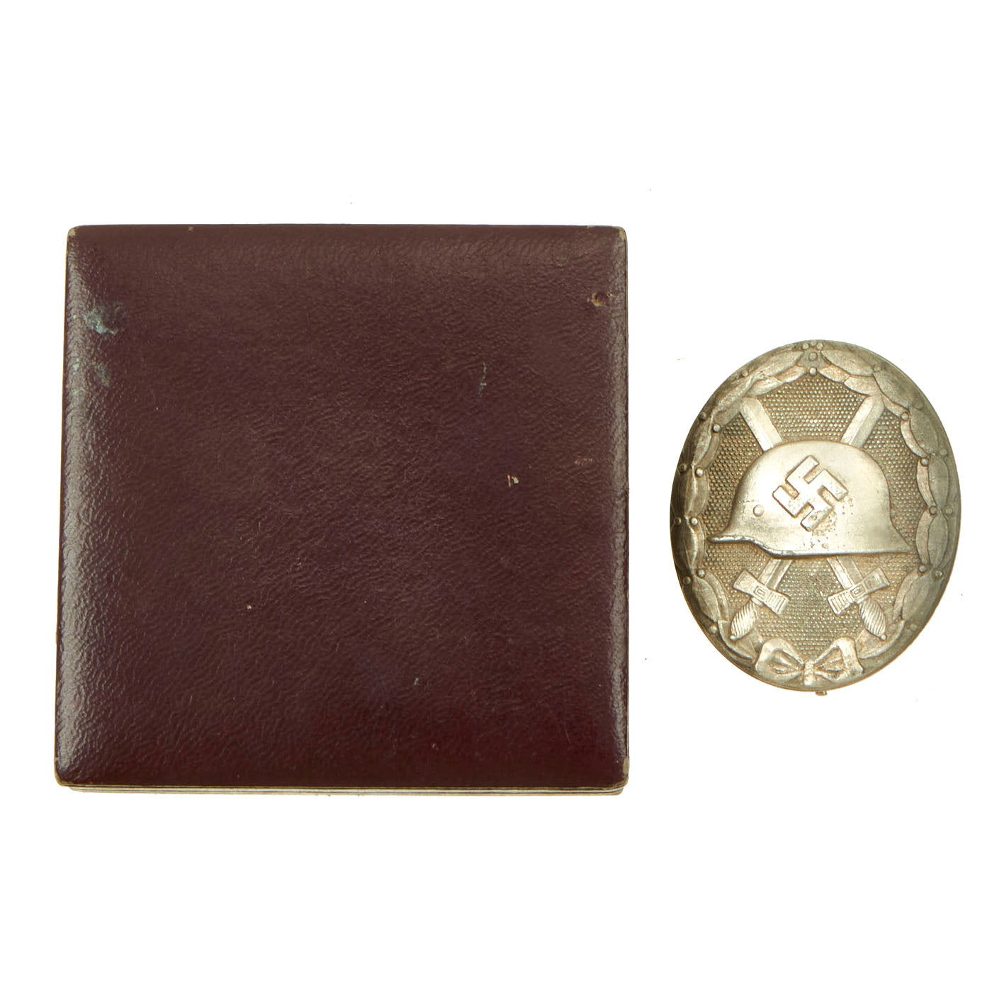 Original Item: Only One Available. A fine maker marked silver wound badge by the Main Mint in Vienna with LDO-marked case box by Wilhelm Deumer in Lüdenscheid. No collection is complete without the rare LDO box. The badge itself is constructed out of a die struck, zinc-alloy base that has been silver washed. The oval badge depicts an embossed profile of a mobile swas, above an M35 pattern helmet, which is above two crossed broadswords. This then lies on a pebbled field and is surrounded by a laurel leaf and berry wreath which is tied together at the bottom with a bow tie.