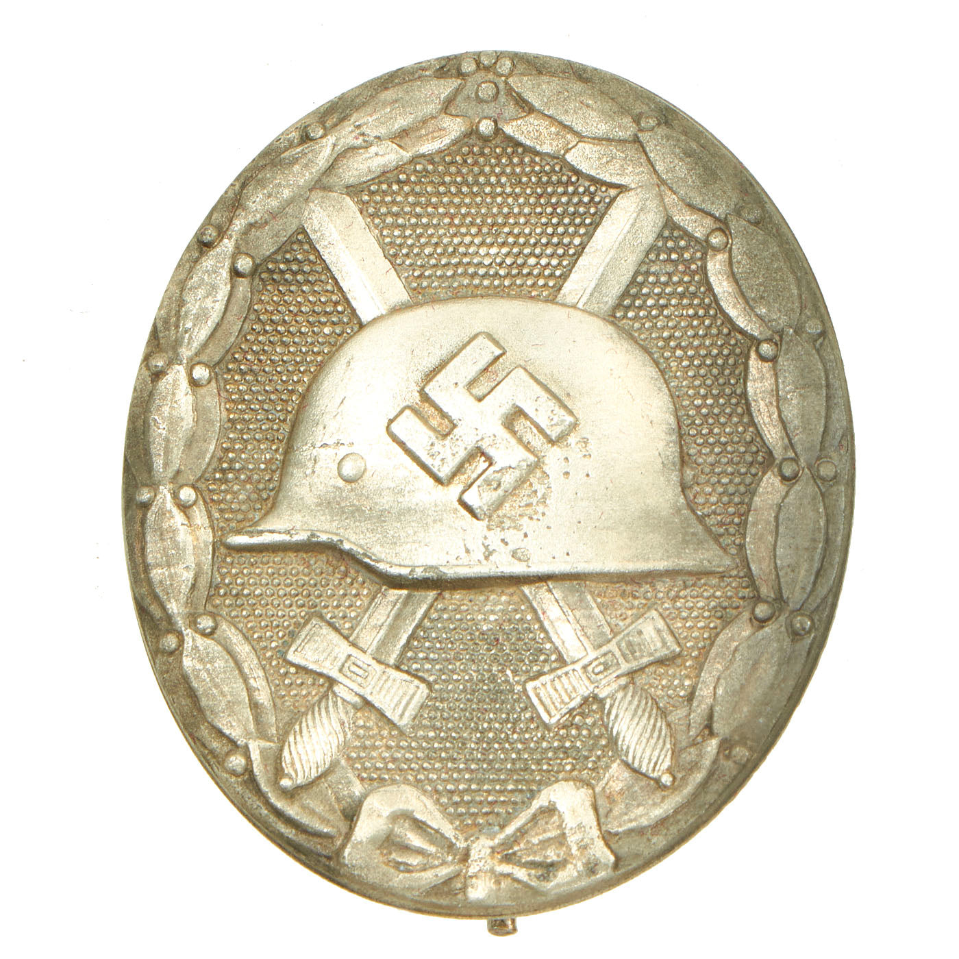 Unlike the Wound Badge in Black, the 20 July Wound Badge in Black was not all black. Only the helmet and wreath were black; the background was in silver so that the date and facsimile signature could be seen. The 20 July Wound Badge in silver has black highlights on the helmet swas, the date, and the facsimile signature. The 20 July Wound Badge in gold had a silver background with the helmet and wreath colored gold. Unlike the standard Wound Badges, these were of two-piece construction.