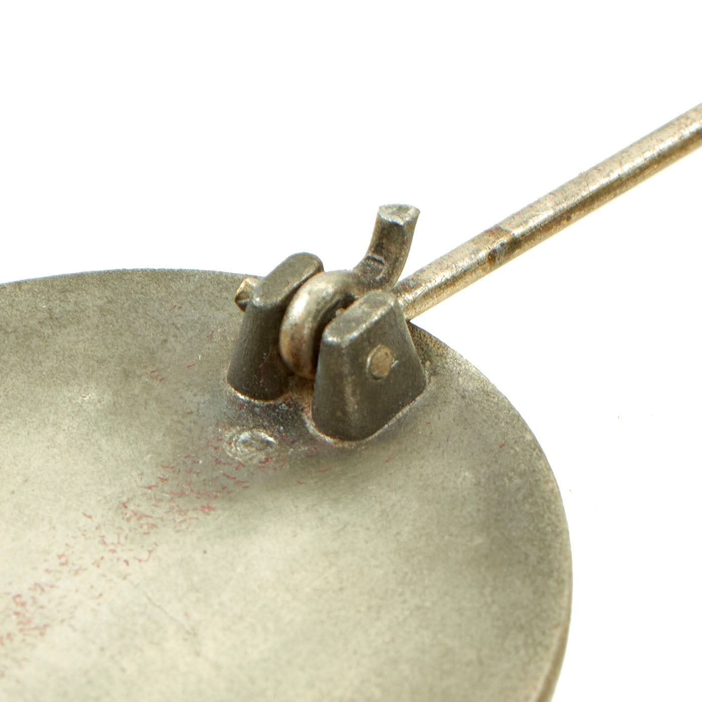 The brass pin, cast hinge and cast catch are all intact and in well-working condition. The silver wash on this example is VERY good, with just some wear on the border and on the Swas in the middle. The badge measures 1.75 inches high by 1.5 inches wide. Overall this is a very good example.