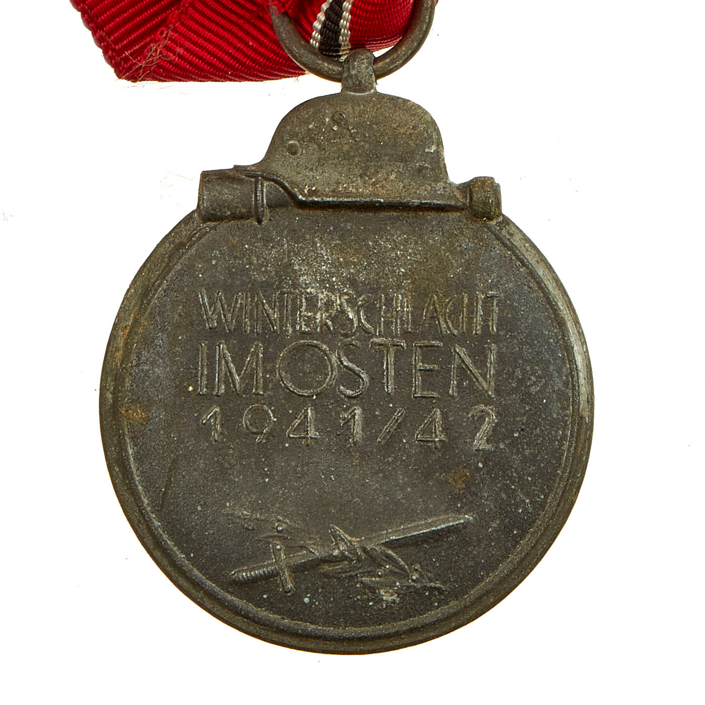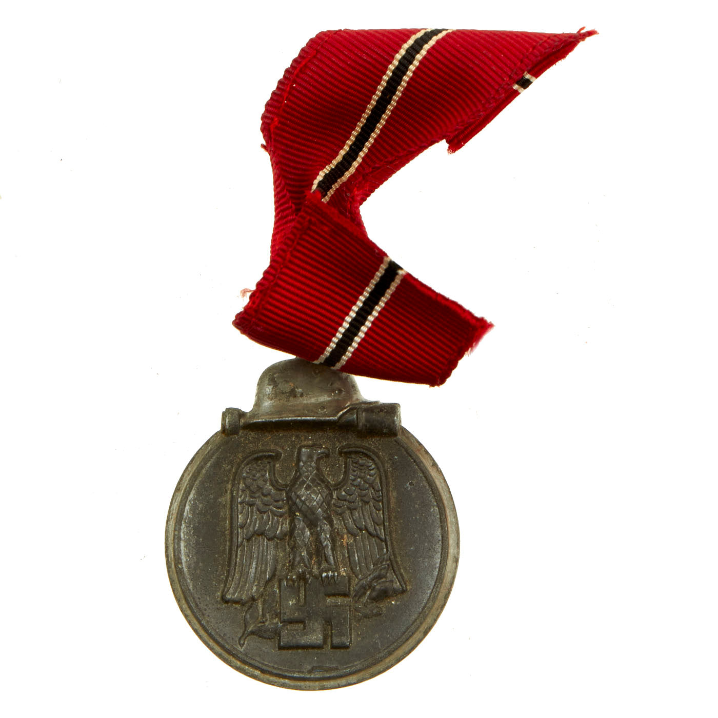 - Eastern Front Medal (Ostmedaille): The medal shows signs of minor wear and has minor surface oxidation and build-up. The ribbon is slightly stained and fraying but overall condition is nice.