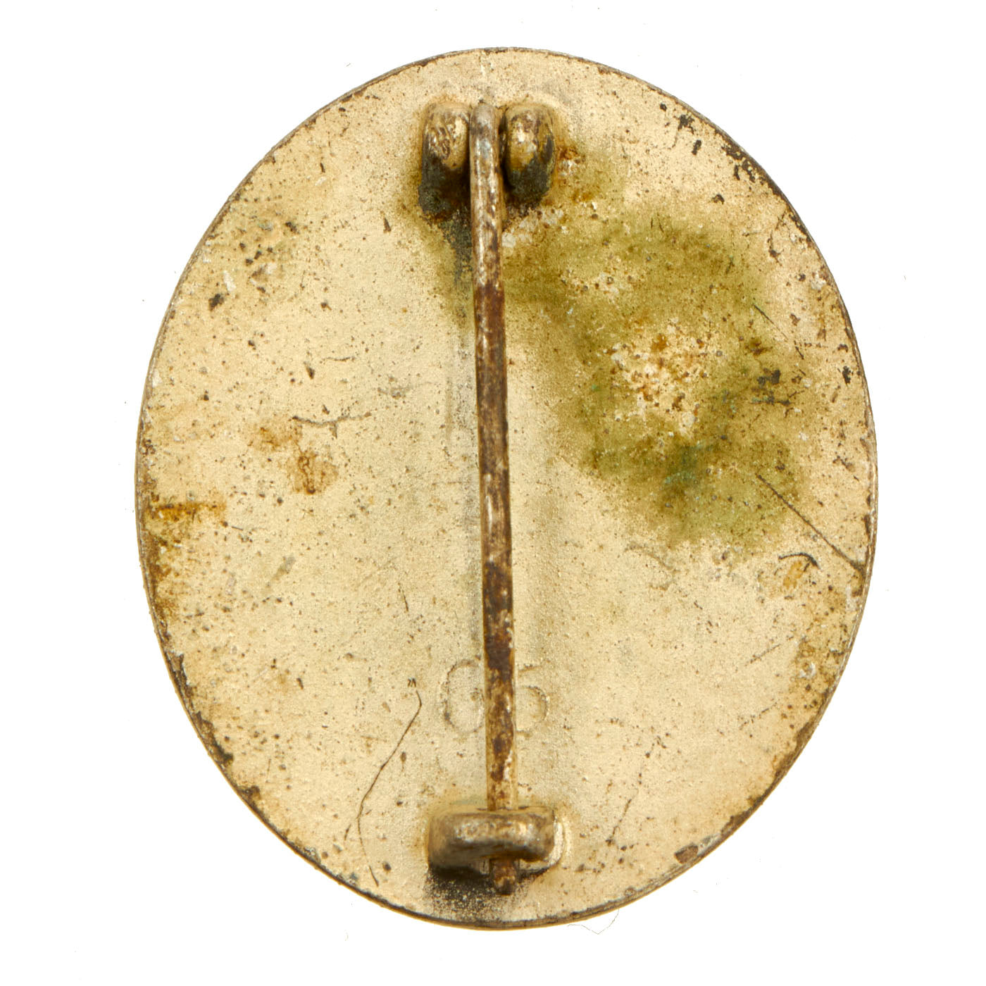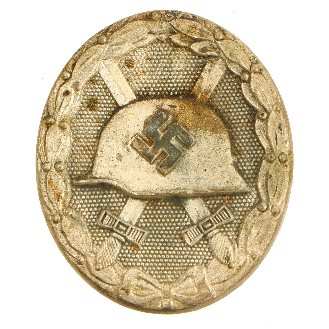 - Silver Wound Badge by Klein & Quenzer A.G of Idar-Oberstein: A fine maker marked silver wound badge by Klein & Quenzer A.G of Idar-Oberstein. The badge itself is constructed out of a die struck, zinc-alloy base that has been silver washed. The oval badge depicts an embossed profile of a mobile swas, above an M35 pattern helmet, which is above two crossed broadswords. This then lies on a pebbled field and is surrounded by a laurel leaf and berry wreath which is tied together at the bottom with a bow tie. The reverse features a solid back and is maker marked with LDO-number 65 (Klein & Quenzer A.G of Idar-Oberstein) under the pin catch. The steel pin, cast hinge and cast catch are all intact and in well-working condition. The silver wash on this example is quite good, with about 50% of the front intact. Most of these badges over time completely lose the wash and turn gray. The badge measures 1.75 inches high by 1.5 inches wide. Overall this is a very good example.