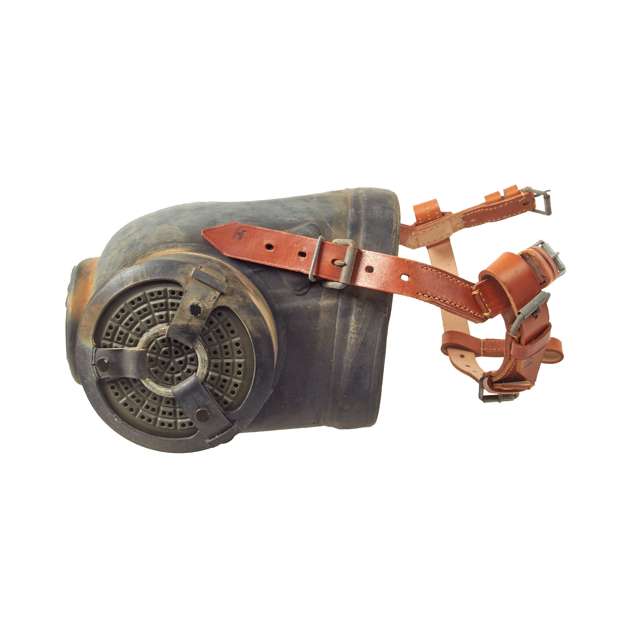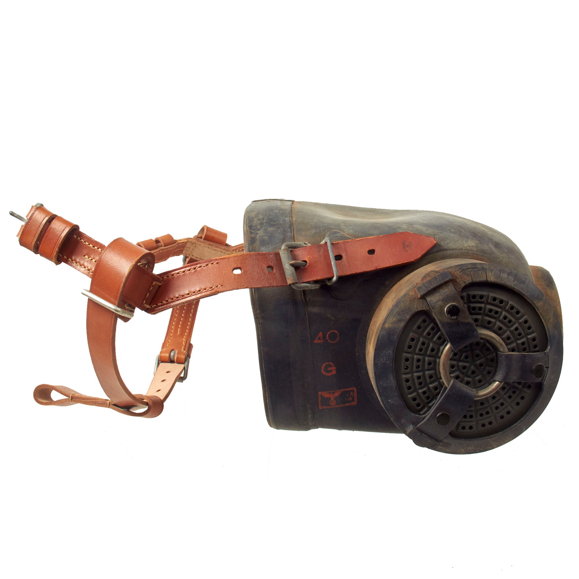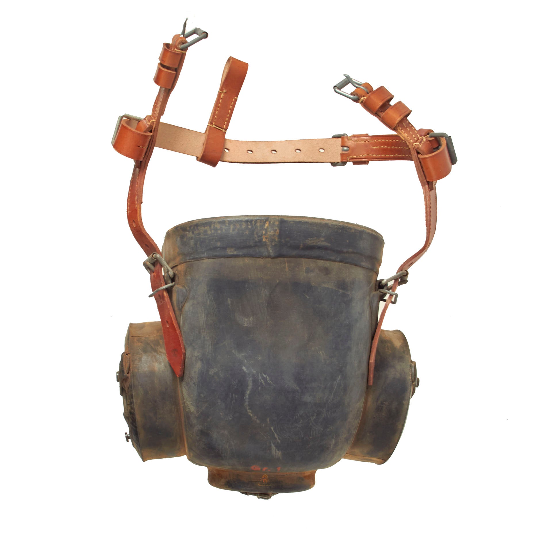 Original Item: Only One Available. This is a wonderful example of an extremely difficult to find German gas mask from WWII. This gas mask was used on the various types of horses and mules that were “employed” by the German military during WWII. Horse gas masks were first used during World War I to protect horses from harmful chemical agents. Horses were the primary mode of transporting men and material to war zones and needed protection from irritating chemicals like chlorine and phosgene, used during that time. Like most horse respirators, this mask was probably used in conjunction with a gas proof cape and leggings.