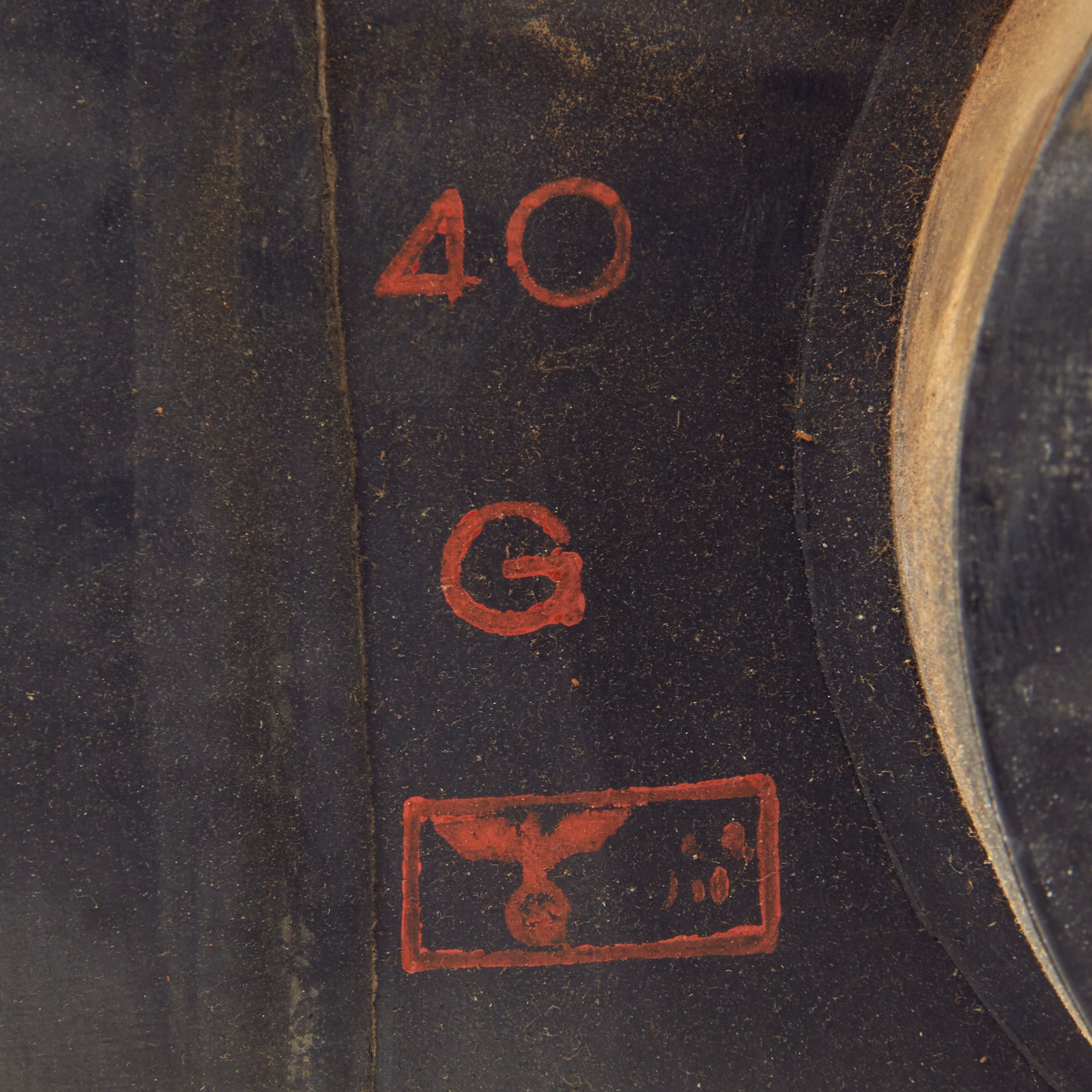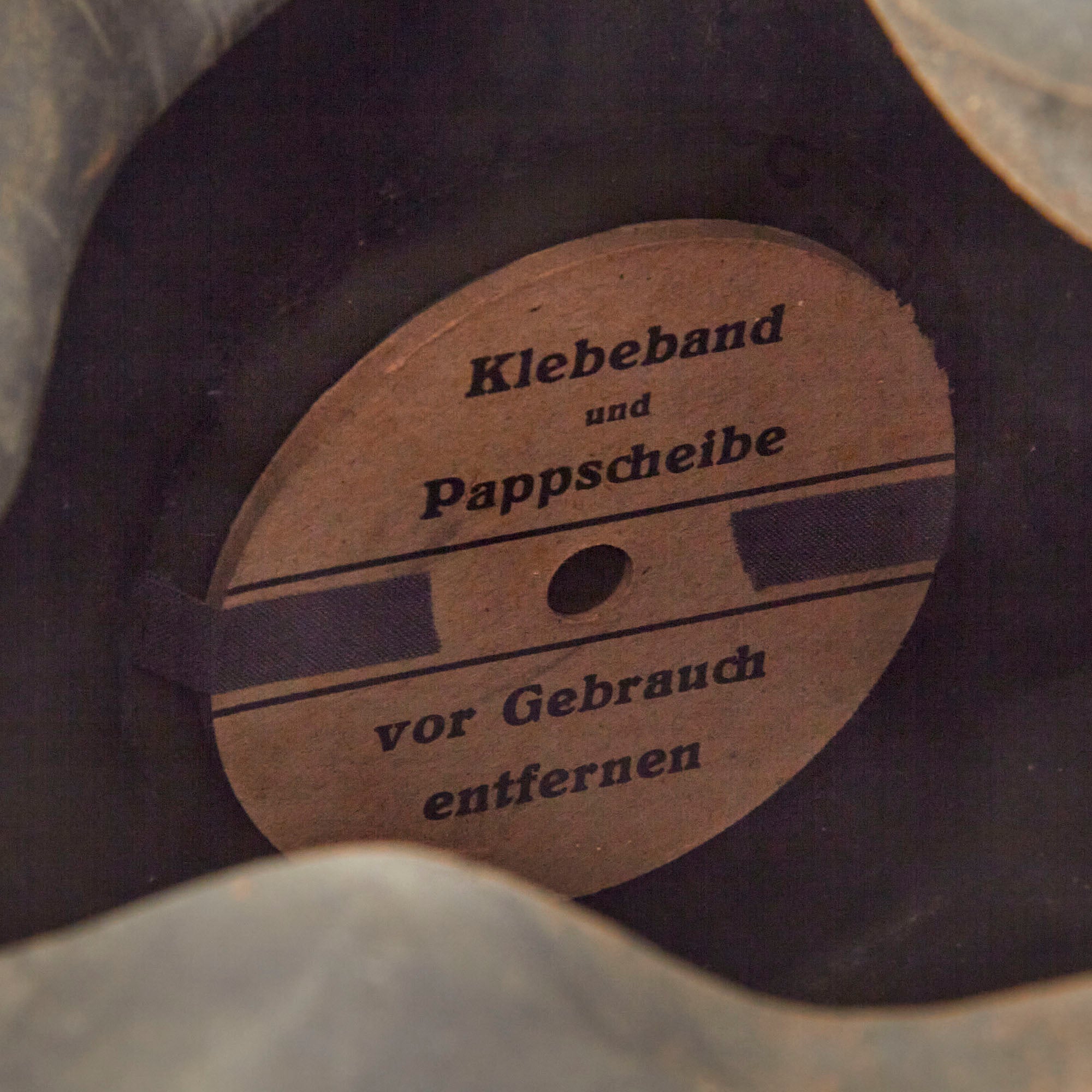 The rubber gas mask itself is dated 40 on the side, over G and a Waffenamt inspection marking. There are also various arsenal stamps and visible Waffenamt stamps on all of the leather pieces and a few spots of the rubber. The front top of the mask is marked Gr.1, for Grosse (size) 1, which following the same pattern of sizes for human gas masks, would be the largest size. The inside of the mask still has covers on the filters, which read Klebeband und Pappscheibe vor Gebrauch entfernen (Remove tape and cardboard disc before use), so these mask has most likely never been used, as with most we see.