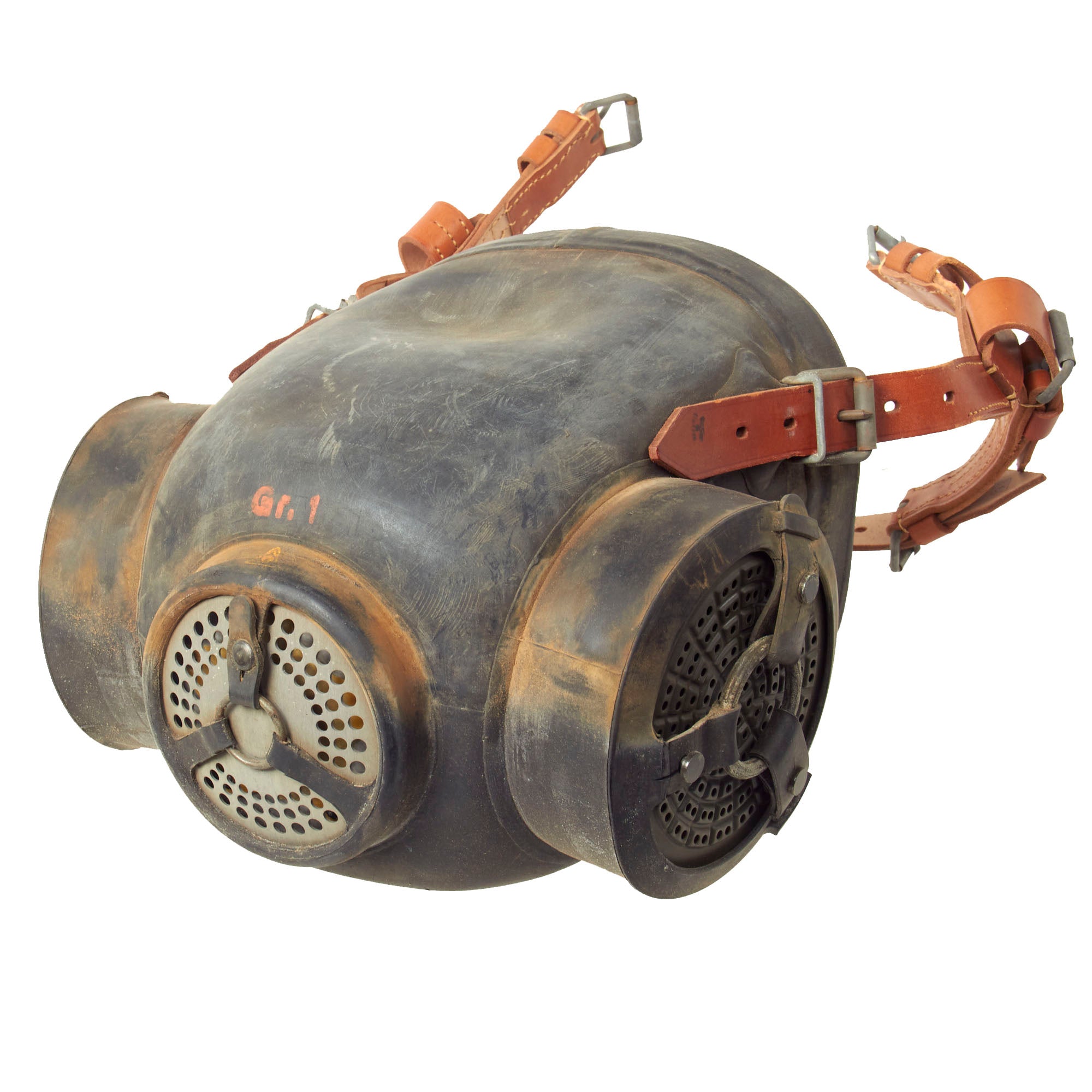 This is a wonderful example of a hard to find gas mask. Ready for further research and display.