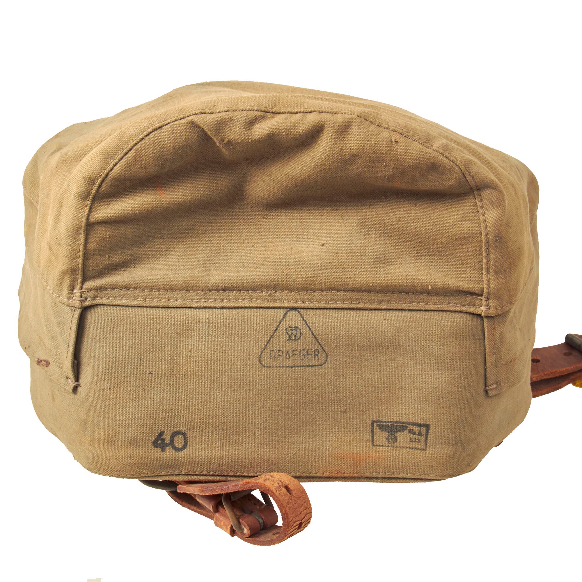 The canvas carry case is still in very good condition with working leather straps and snaps. There is a DRAEGER stamp visible on the exterior of the case, along with a 40 date and a Waffenamt WaA533 stamp. It does have fading to the fabric on the exterior, and the leather straps do have cracking and age-related degradation.