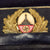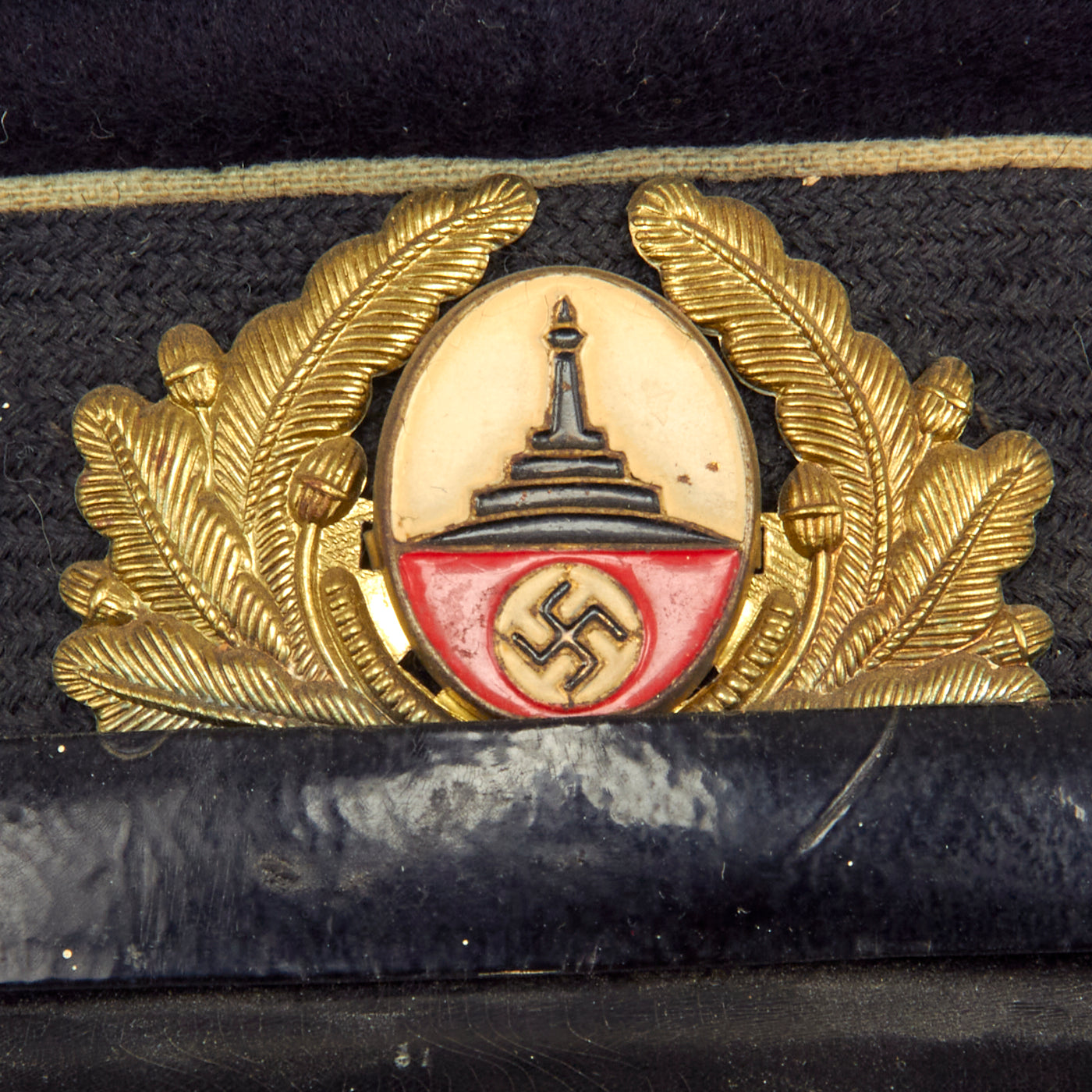 It is decorated with a Silvered aluminum Soldatenbund cap eagle on the peak, which features the Reichsadler National Eagle surmounted by crossed swords and an Iron Cross. The cap band however has had the original silver wreath and cockade insignia replaced by an open gold washed metal oak leaf wreath, with the NS-RKB insignia in the center. This shows the Kyffhäuser monument on a white field, over an NSDAP swas.