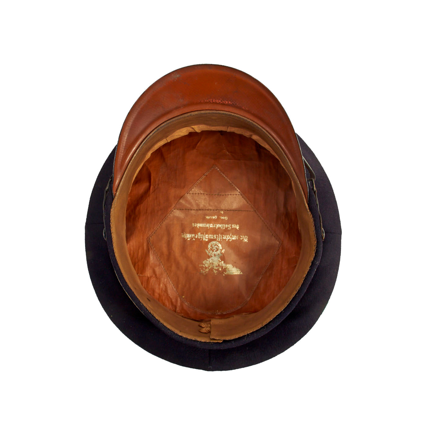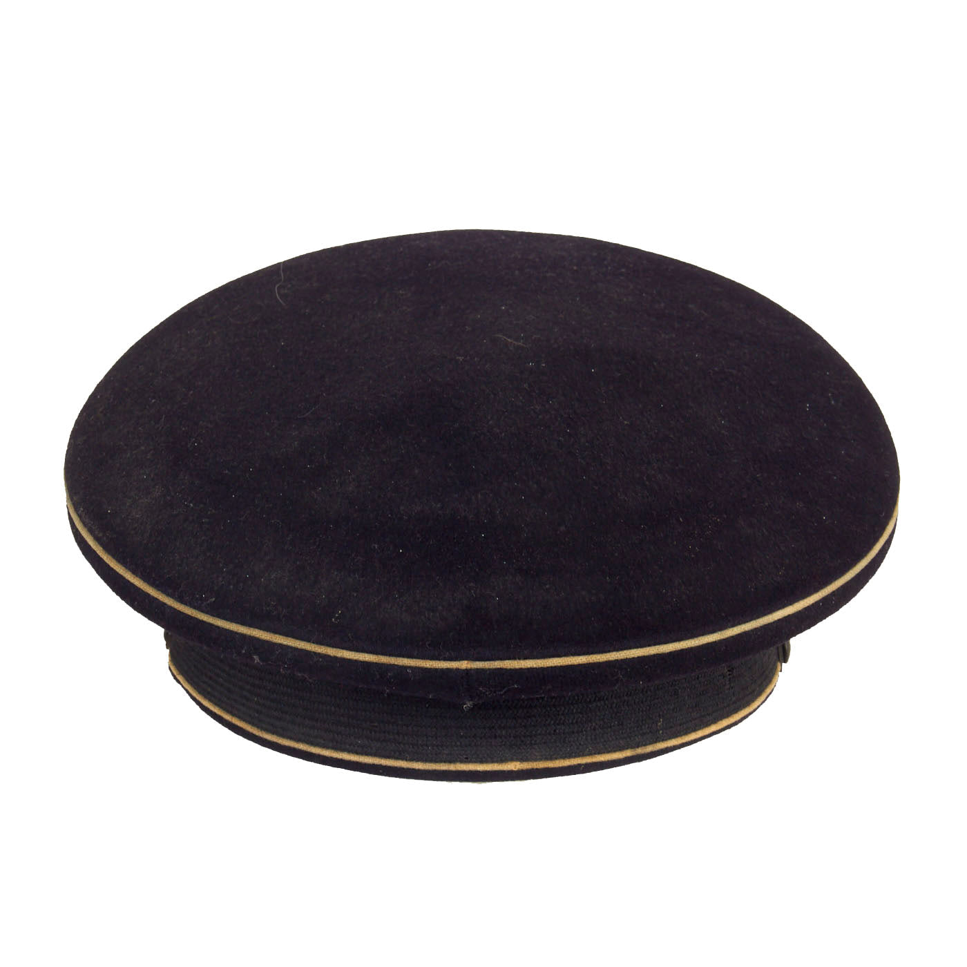 This cap is a very nice example of an early pattern German Pre-WWII Soldatenbund Members Schirmmütze (visor cap), which was later updated with an NS-RKB band insignia after the groups were merged. This example is in very good condition, showing light use during service. It features very dark navy blue (or possibly black) construction with a black ribbed band and a traditional high forward crown. The cap also has matching Weiß (white) piping along the top edge and flanking either side of the band, the Corps Color (Waffenfarbe) for infantry and motorized infantry. It was traditional for members of the Soldatenbund to have caps bearing the corps color of their service branch, so this cap was owned by an Infantry veteran.