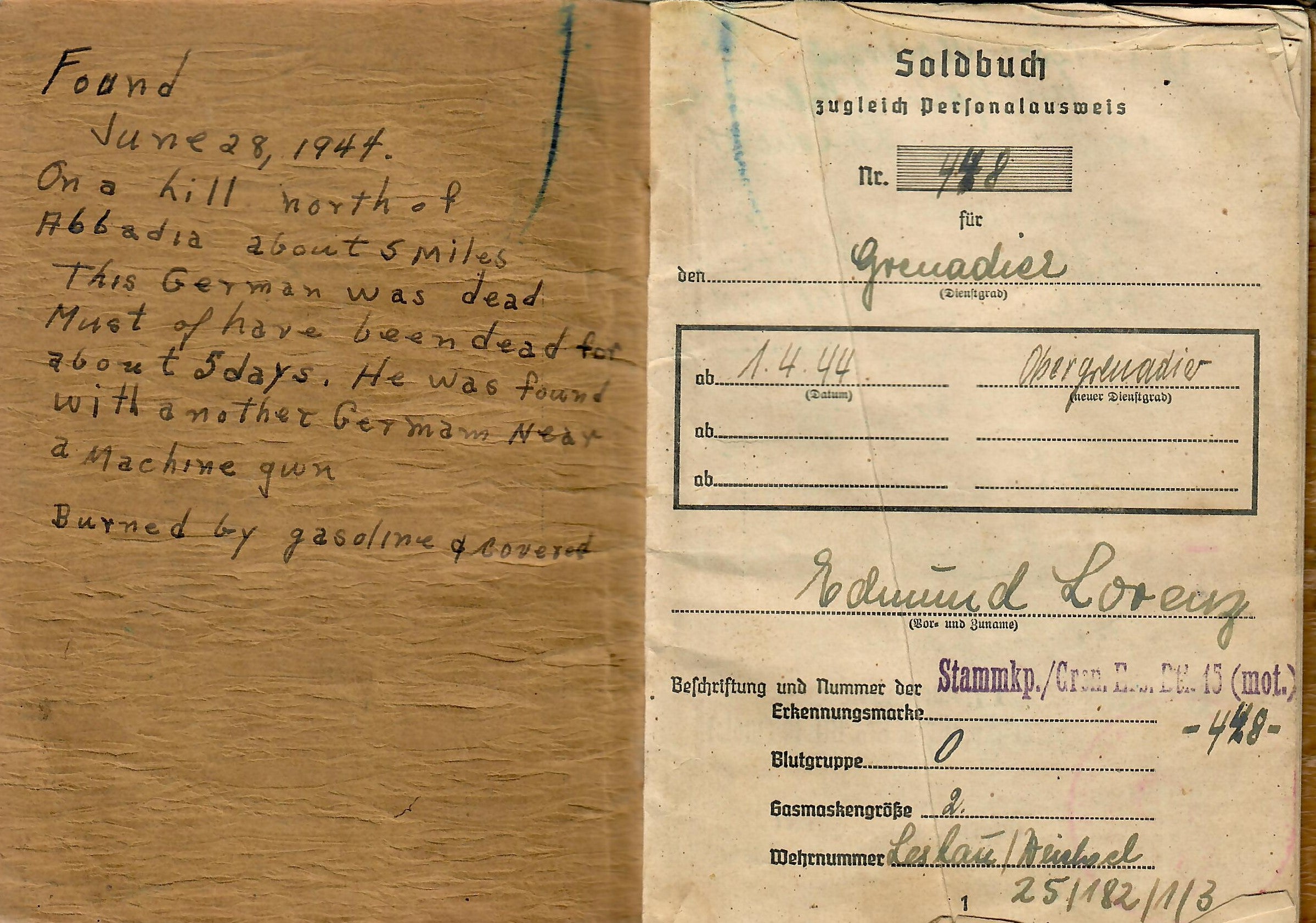 The inside of the front cover gives information on how the soldbuch was acquired, though it unfortunately does not give any information regarding the soldier that found it. It reads: