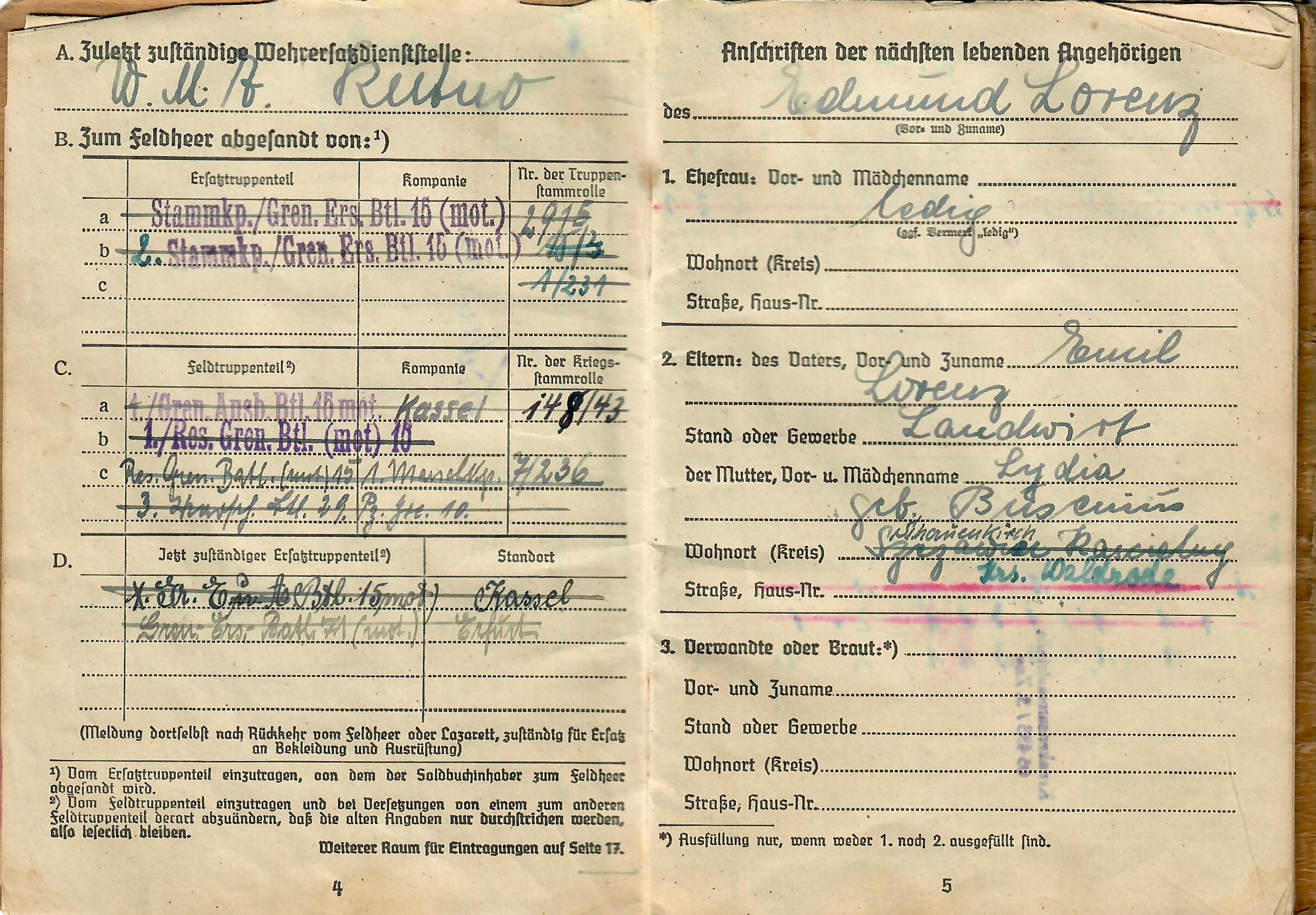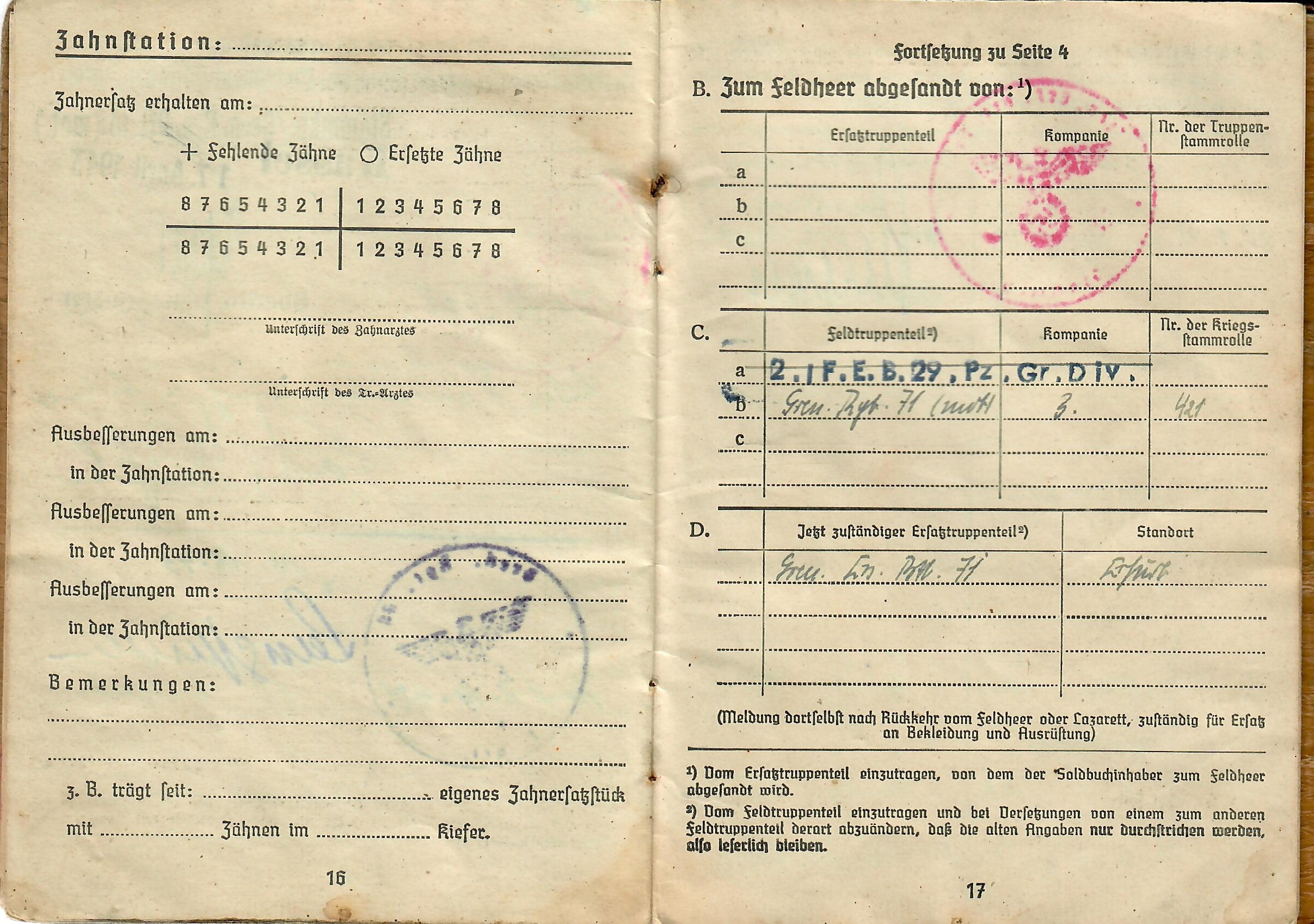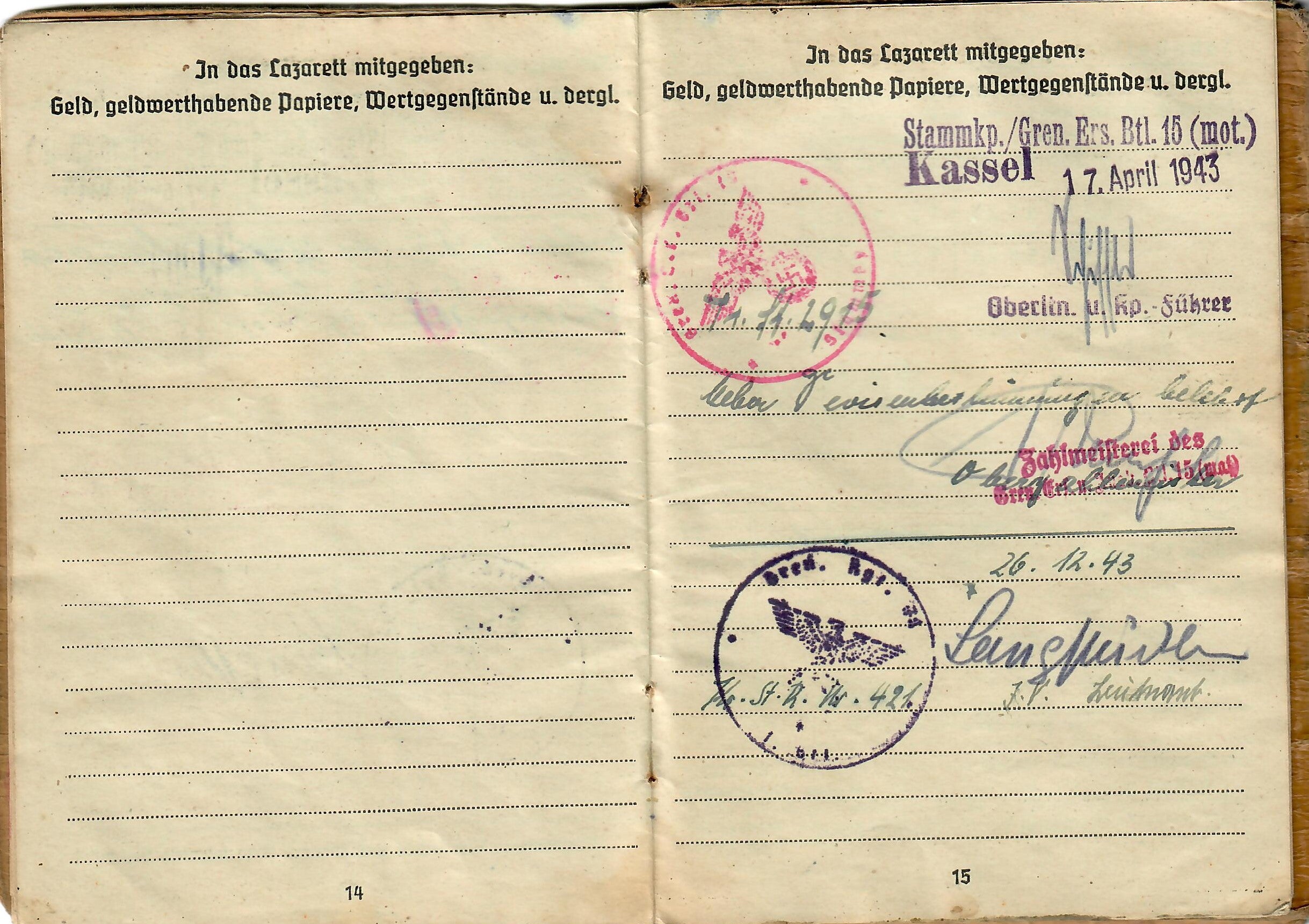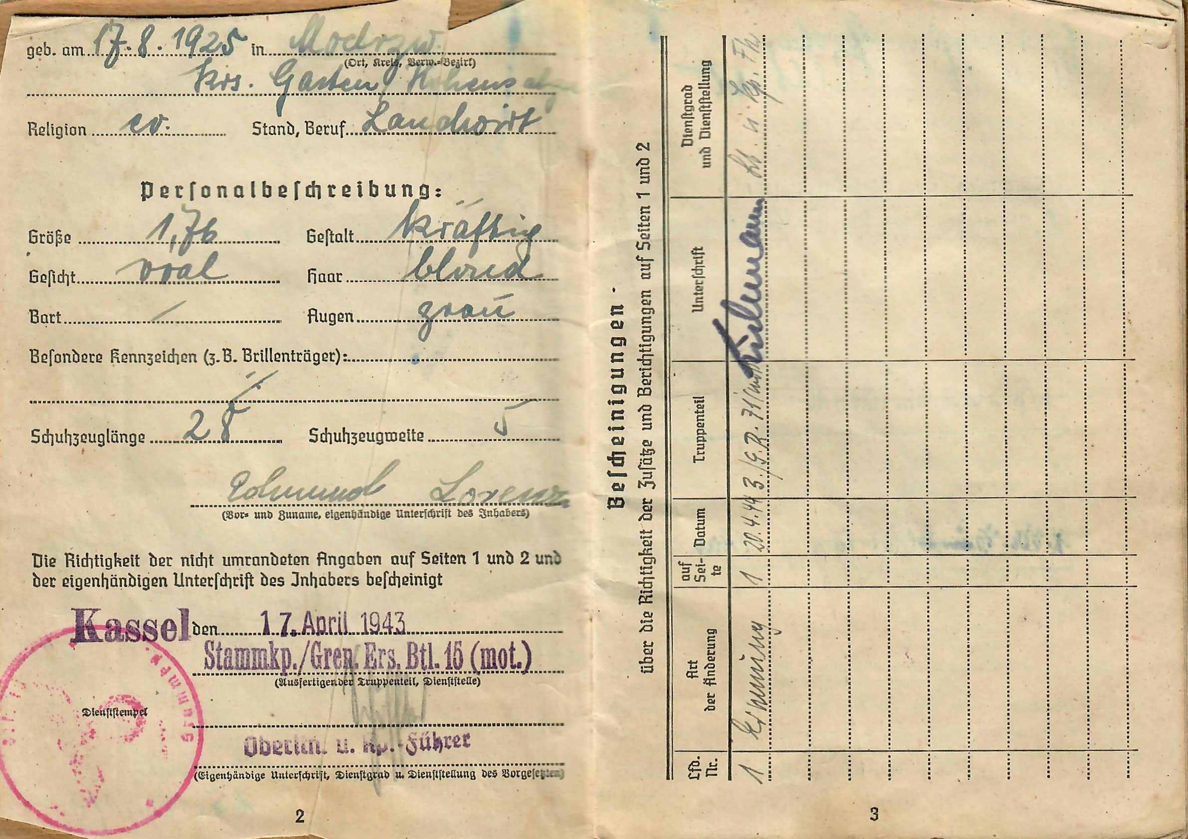 Lorenz was born 17. 8. 1925, and the book indicates he was issued the soldbuch 17. April 1943 in Kassel, Germany, when he was made part of Stammkp. / Gren. Ers. Btl. 15 (mot.), or the Staff Company of Grenadier Ersatz (Replacement) Battalion 15 (motorized). He was initially the lowest enlisted rank of Grenadier, but on 1.4.44 promoted to Obergrenadier. Later in the book there is a stamp that indicates he was made part of 2. / F. E. B. 29. Pz. Gr. Div., which looks to be a replacement unit of a Panzergrenadier Division, and then part of Gren. Reg. 71 (mot.). The pages of the book have all the proper stamps and signatures.