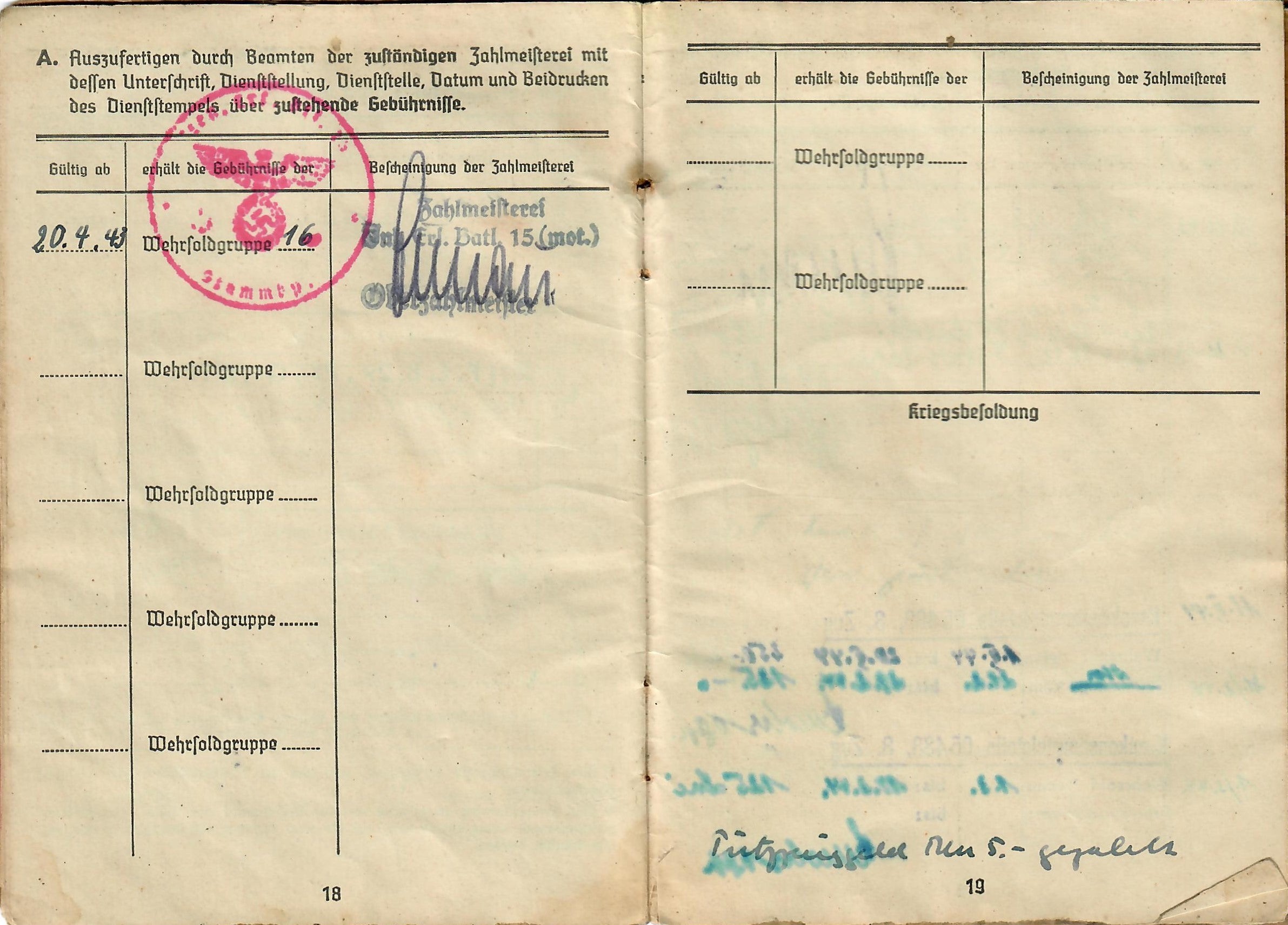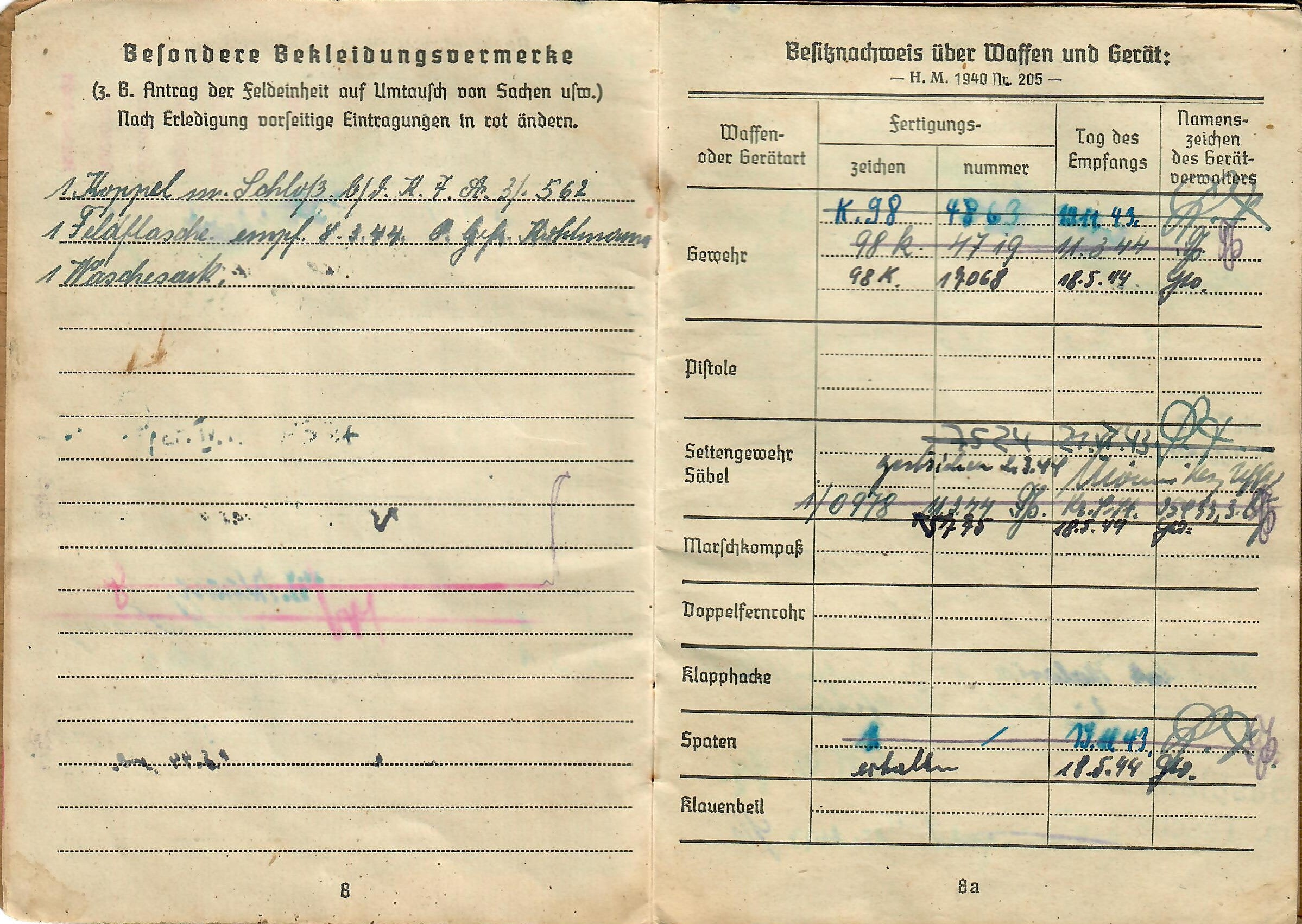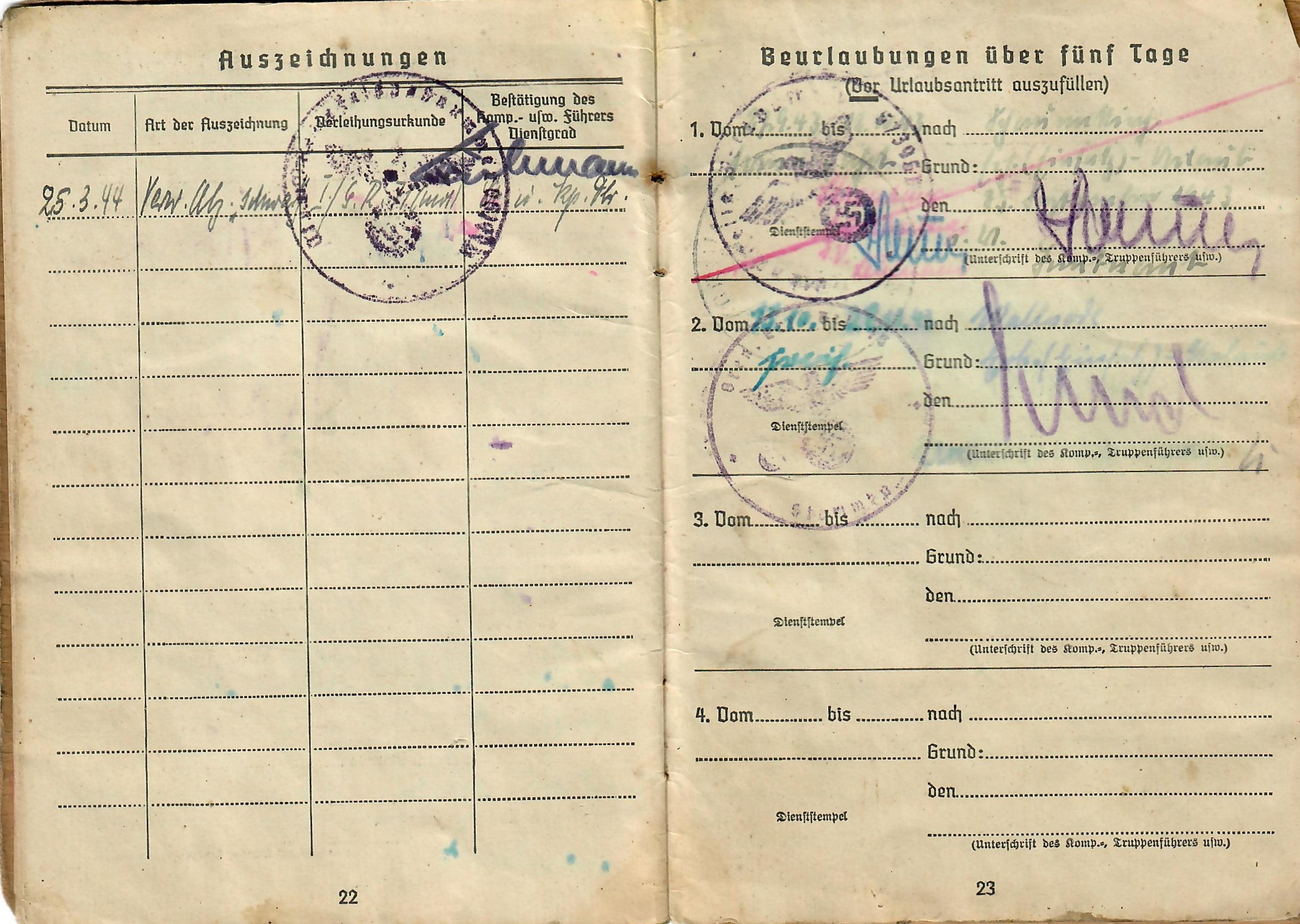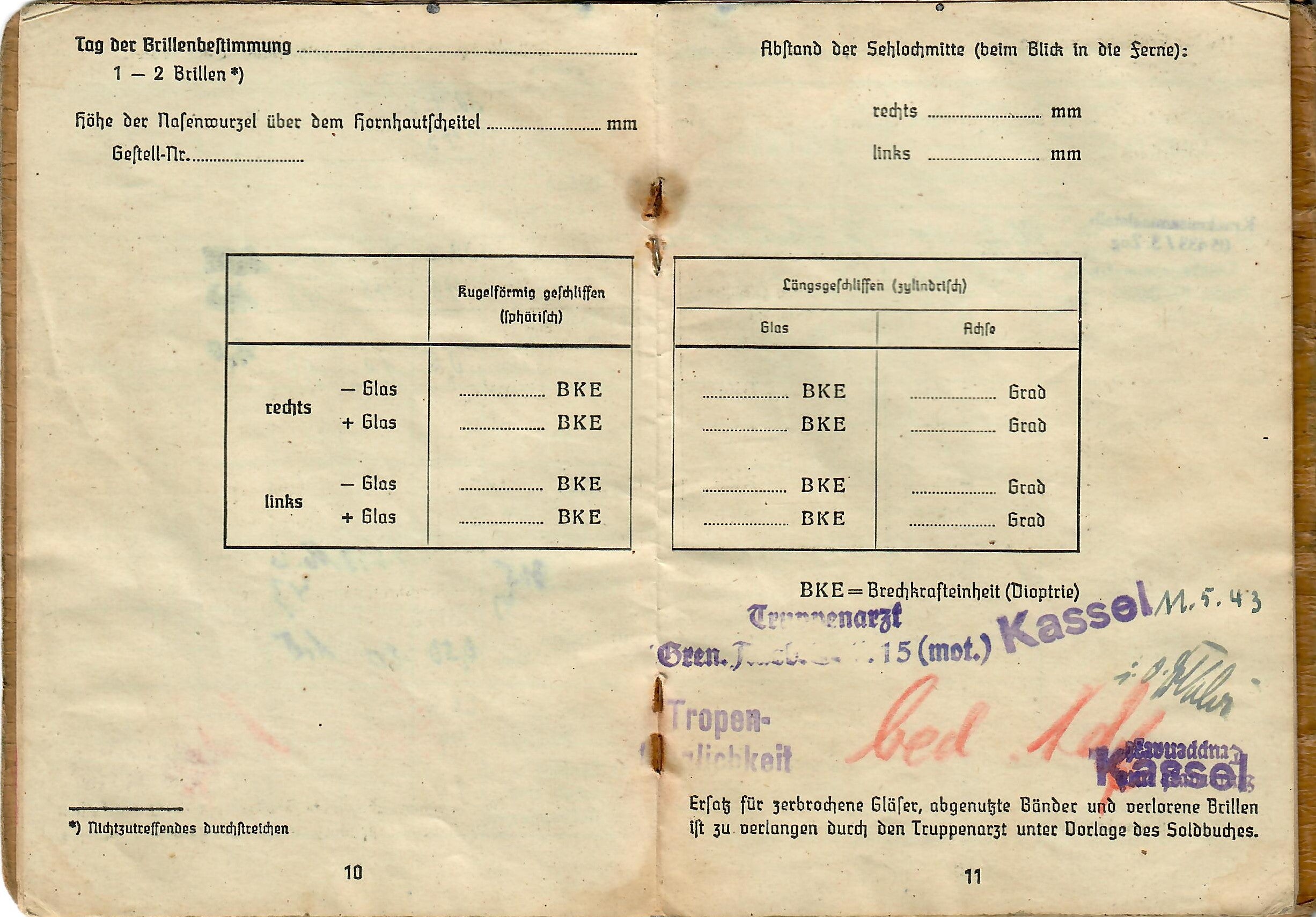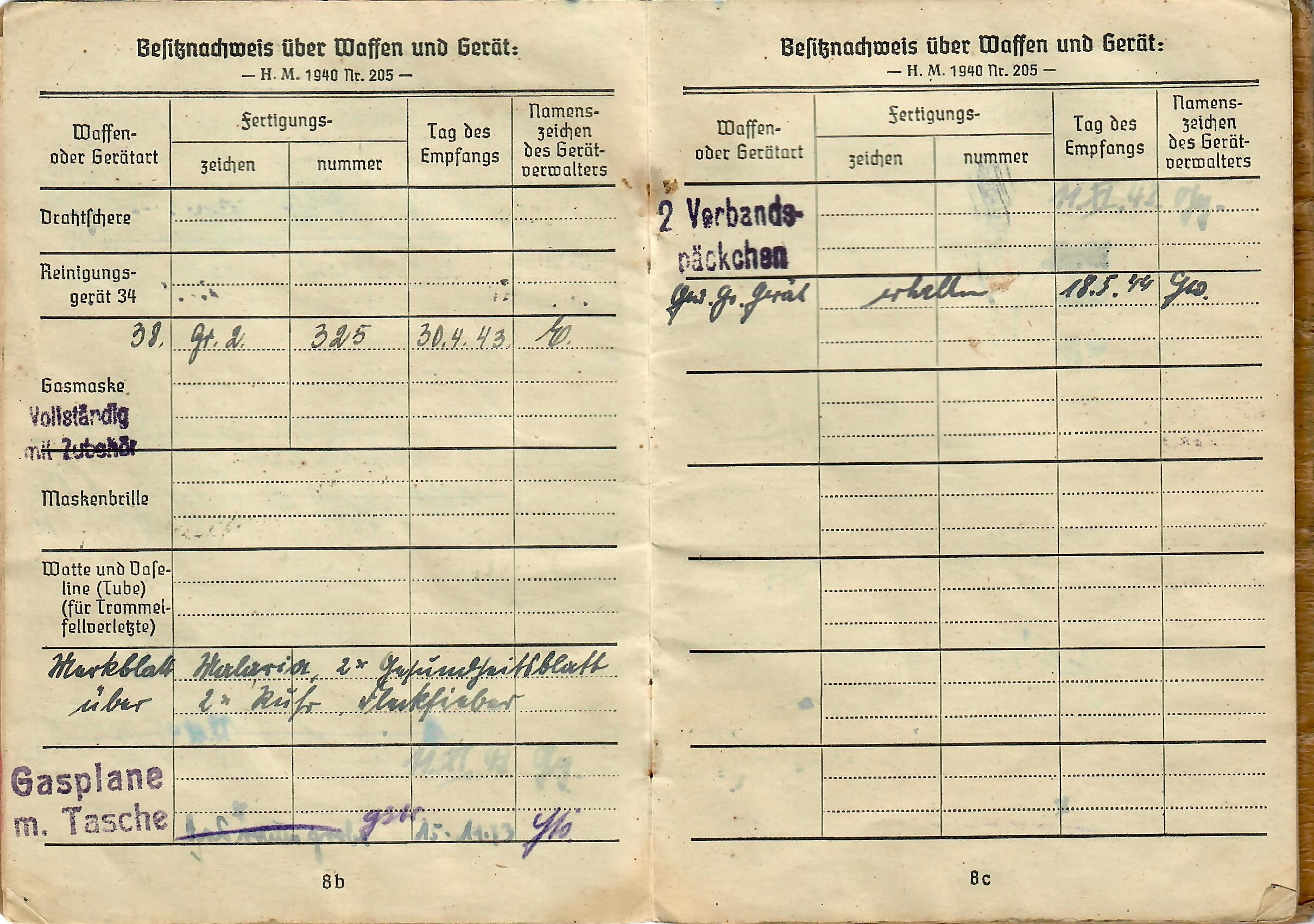 Lorenz was born 17. 8. 1925, and the book indicates he was issued the soldbuch 17. April 1943 in Kassel, Germany, when he was made part of Stammkp. / Gren. Ers. Btl. 15 (mot.), or the Staff Company of Grenadier Ersatz (Replacement) Battalion 15 (motorized). He was initially the lowest enlisted rank of Grenadier, but on 1.4.44 promoted to Obergrenadier. Later in the book there is a stamp that indicates he was made part of 2. / F. E. B. 29. Pz. Gr. Div., which looks to be a replacement unit of a Panzergrenadier Division, and then part of Gren. Reg. 71 (mot.). The pages of the book have all the proper stamps and signatures.