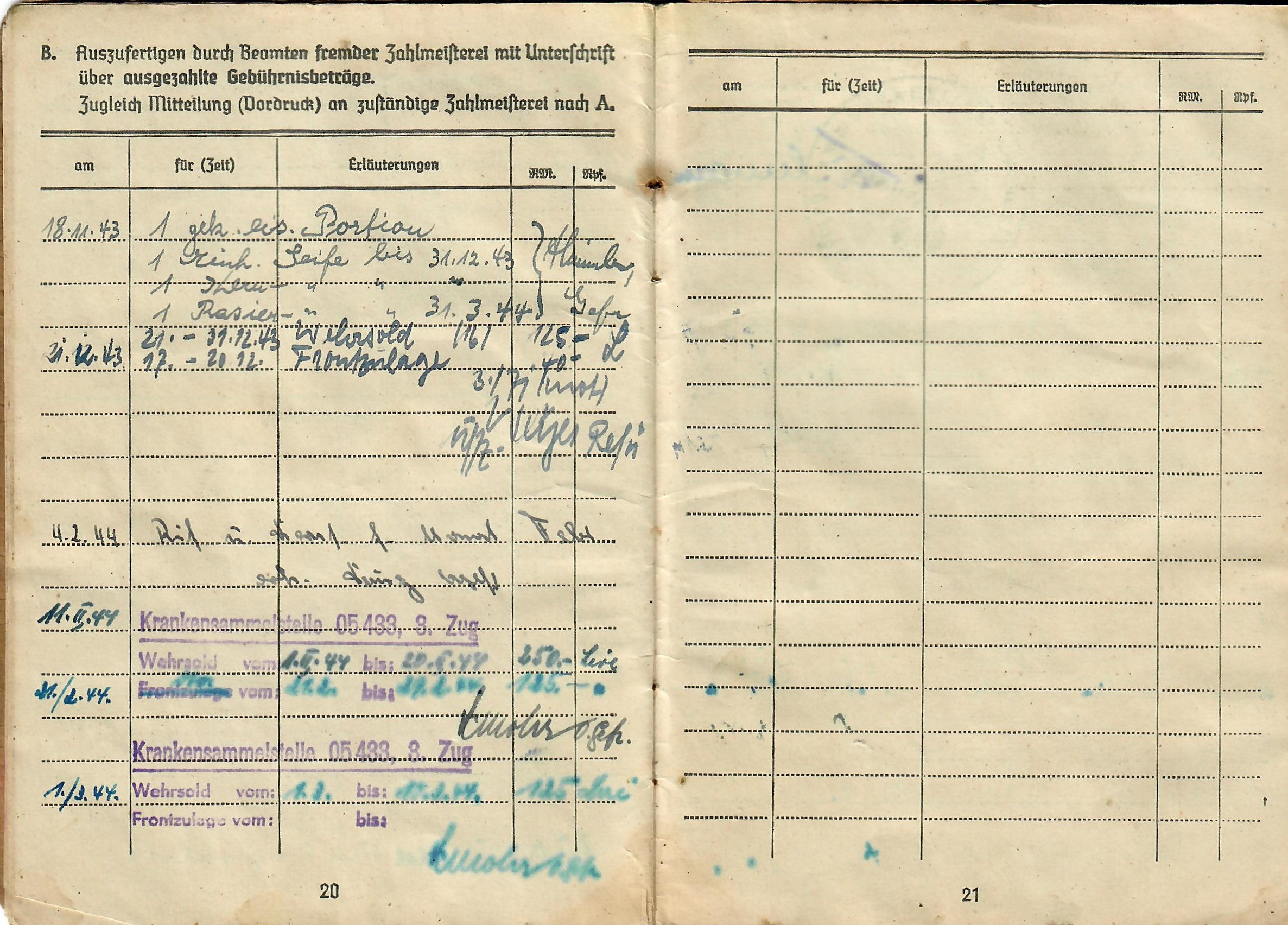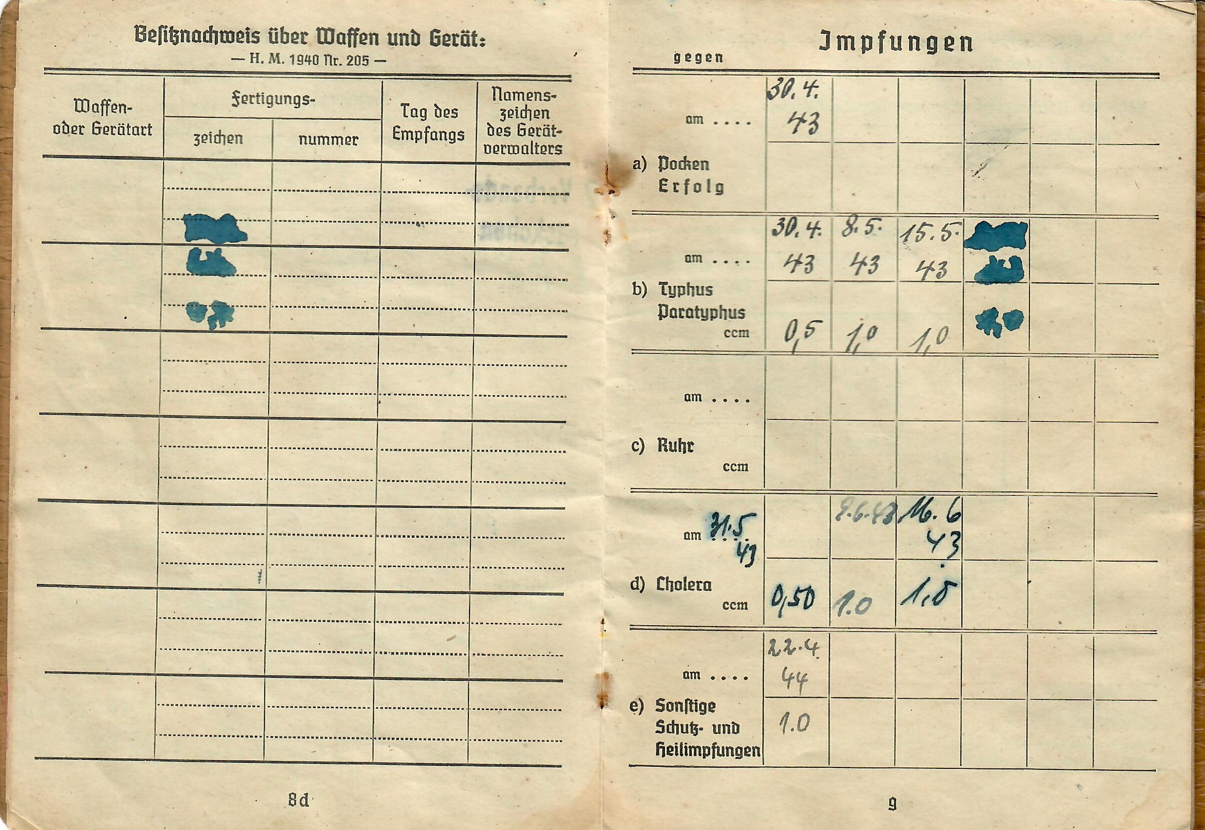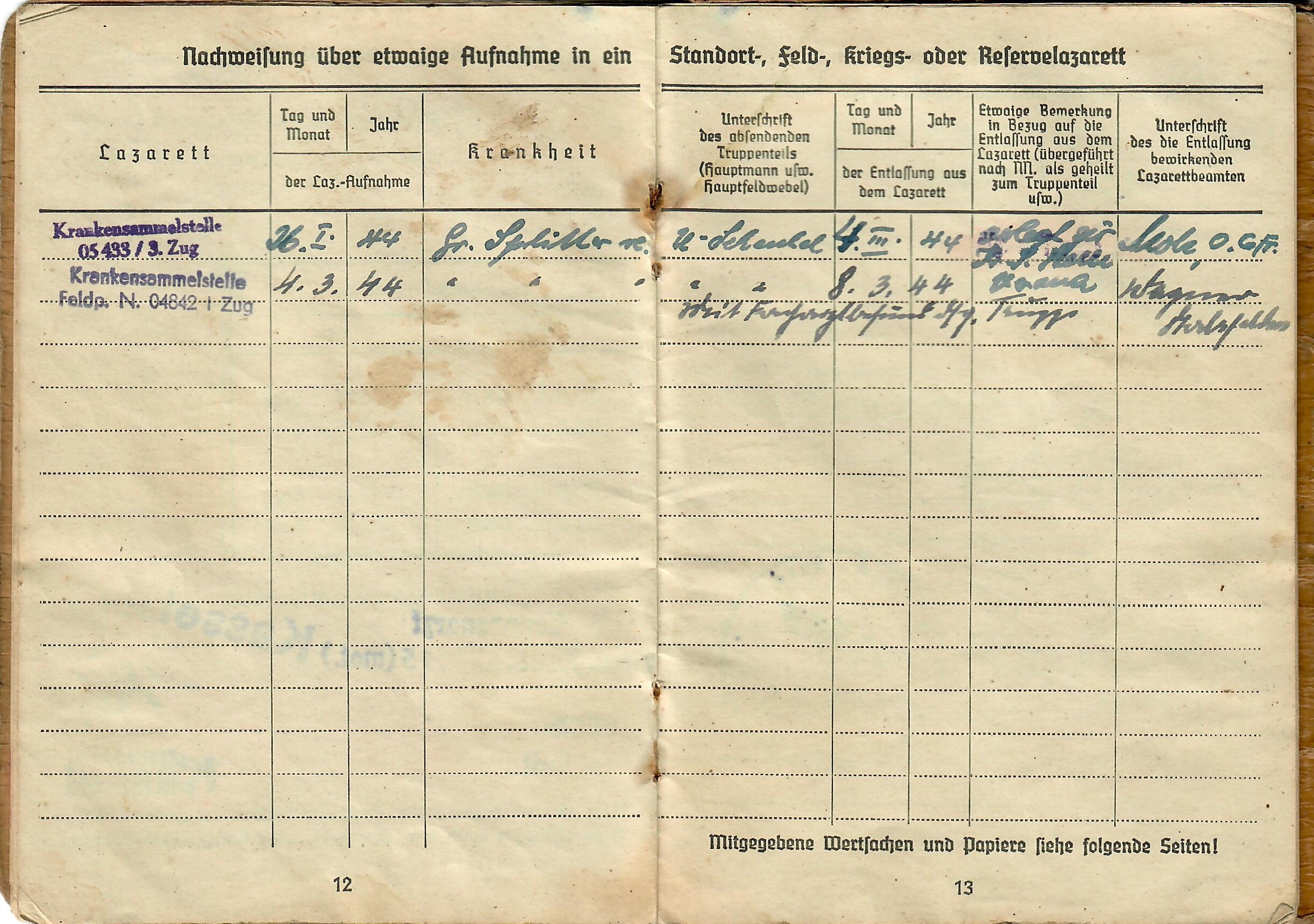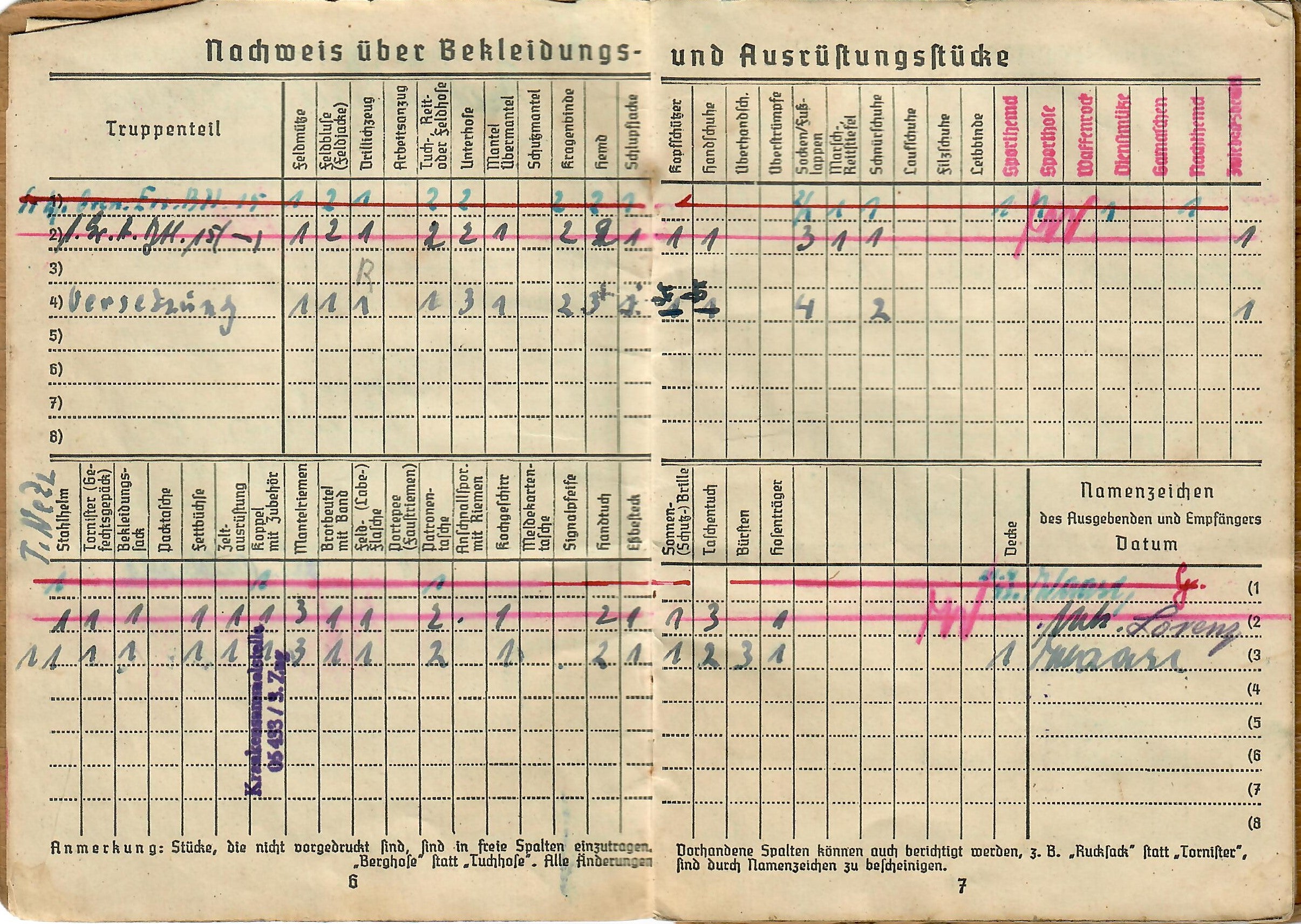 Lorenz was born 17. 8. 1925, and the book indicates he was issued the soldbuch 17. April 1943 in Kassel, Germany, when he was made part of Stammkp. / Gren. Ers. Btl. 15 (mot.), or the Staff Company of Grenadier Ersatz (Replacement) Battalion 15 (motorized). He was initially the lowest enlisted rank of Grenadier, but on 1.4.44 promoted to Obergrenadier. Later in the book there is a stamp that indicates he was made part of 2. / F. E. B. 29. Pz. Gr. Div., which looks to be a replacement unit of a Panzergrenadier Division, and then part of Gren. Reg. 71 (mot.). The pages of the book have all the proper stamps and signatures.