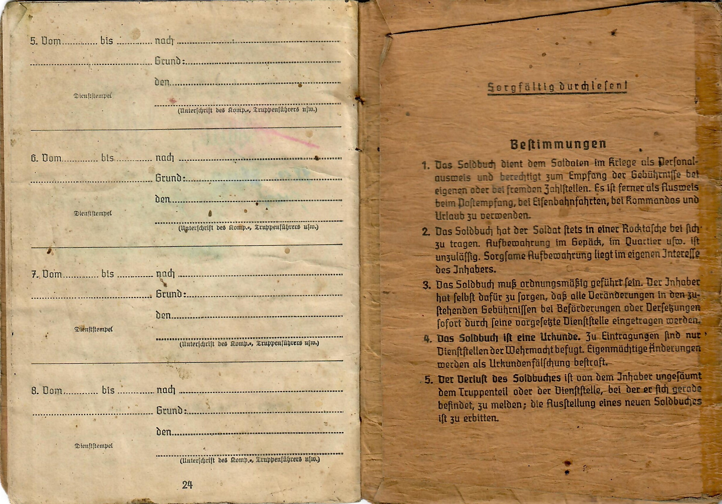 Original Item: One-of-a-kind. This is a fantastic genuine WWII German Soldbuch, issued to Grenadier and later Obergrenadier Eduard Lorenz, a soldier in the Motorized infantry. A H had decided in 1942 to change the lower ranks of infantry from Schütze (Rifleman) to Grenadier in memory of the legendary 19th century units. We are not entirely clear on the first name, as it looks to be written in Kurrentschrift, which can be somewhat hard to read.
