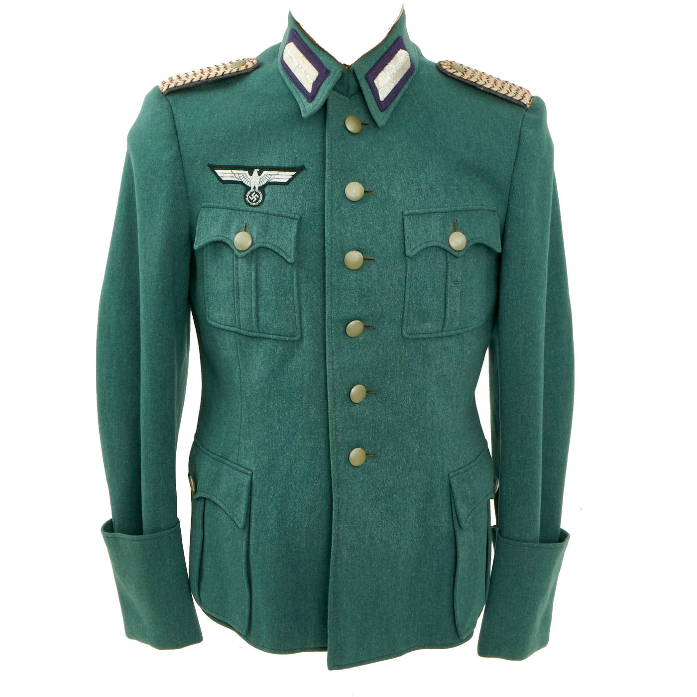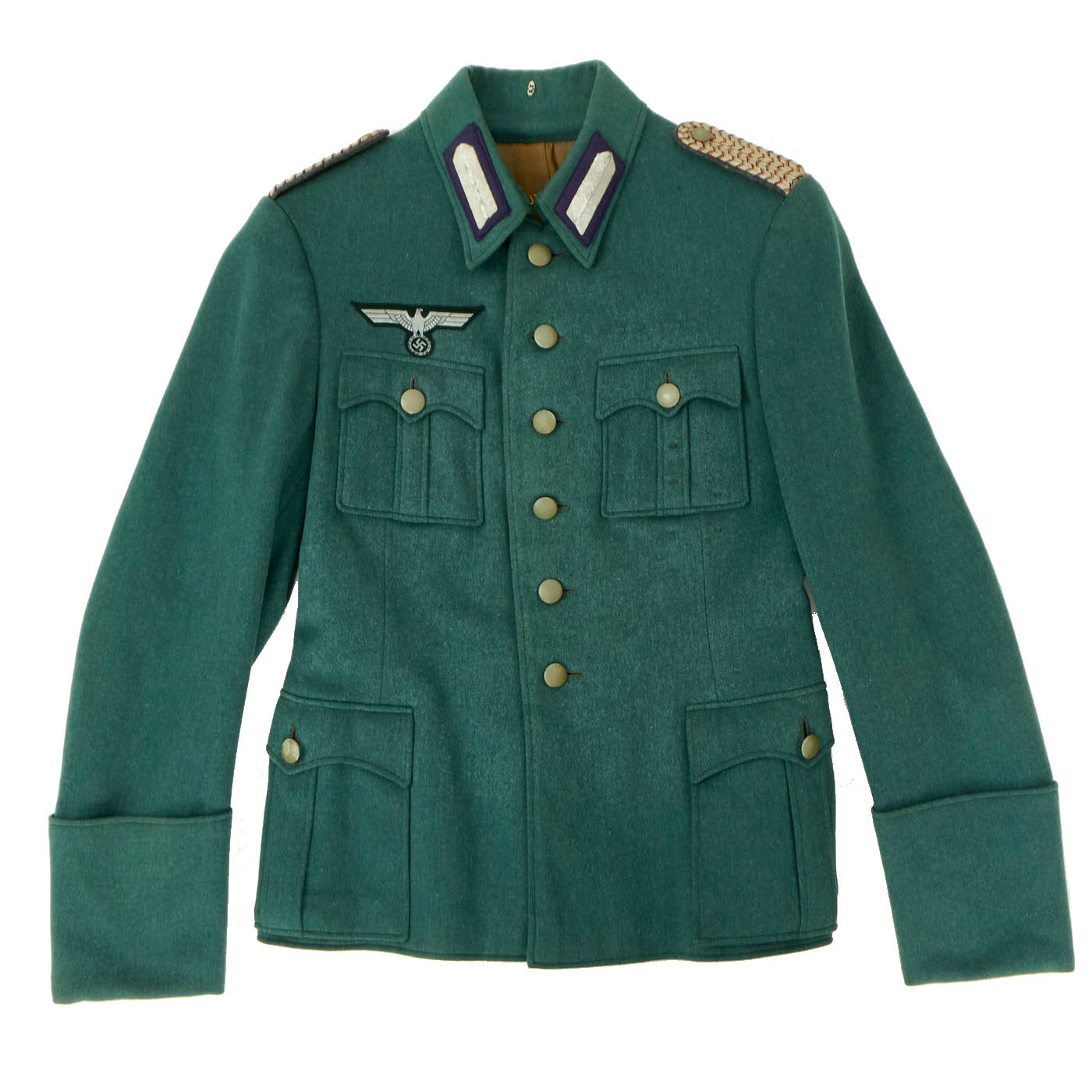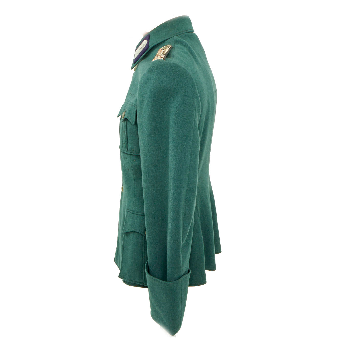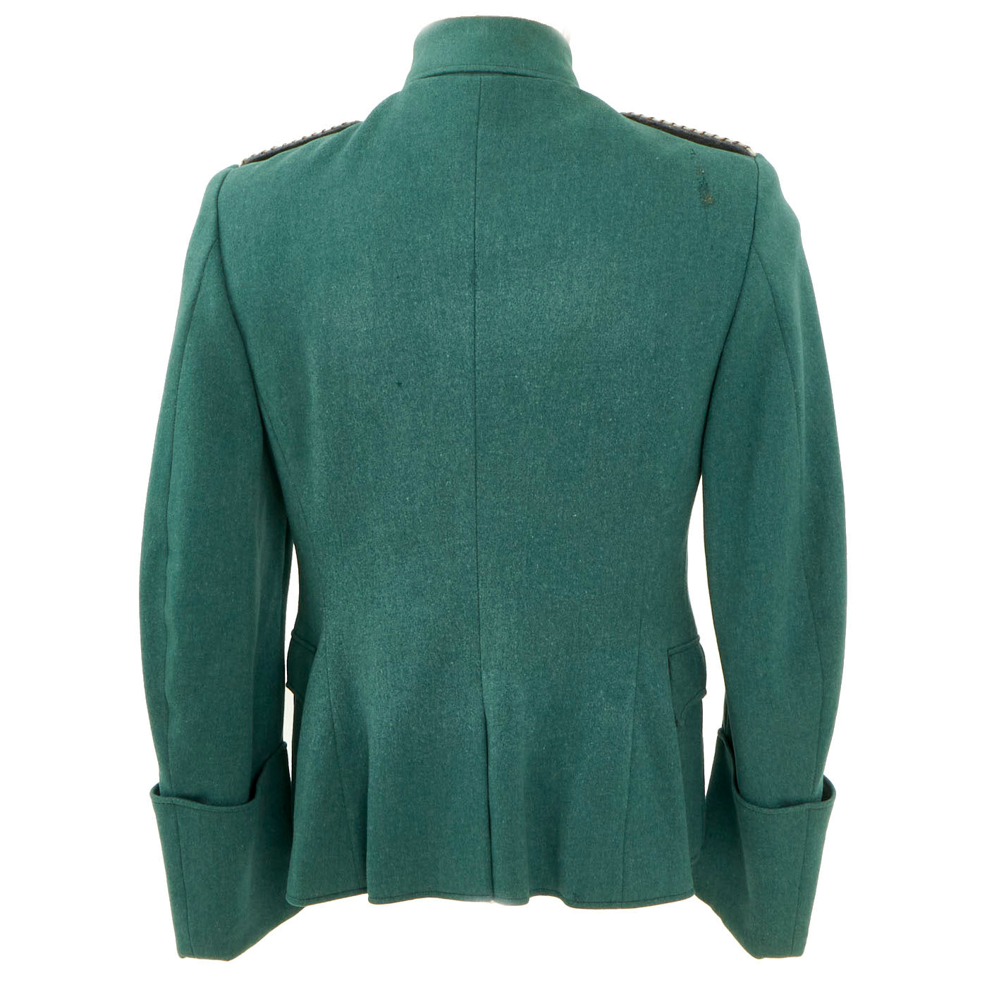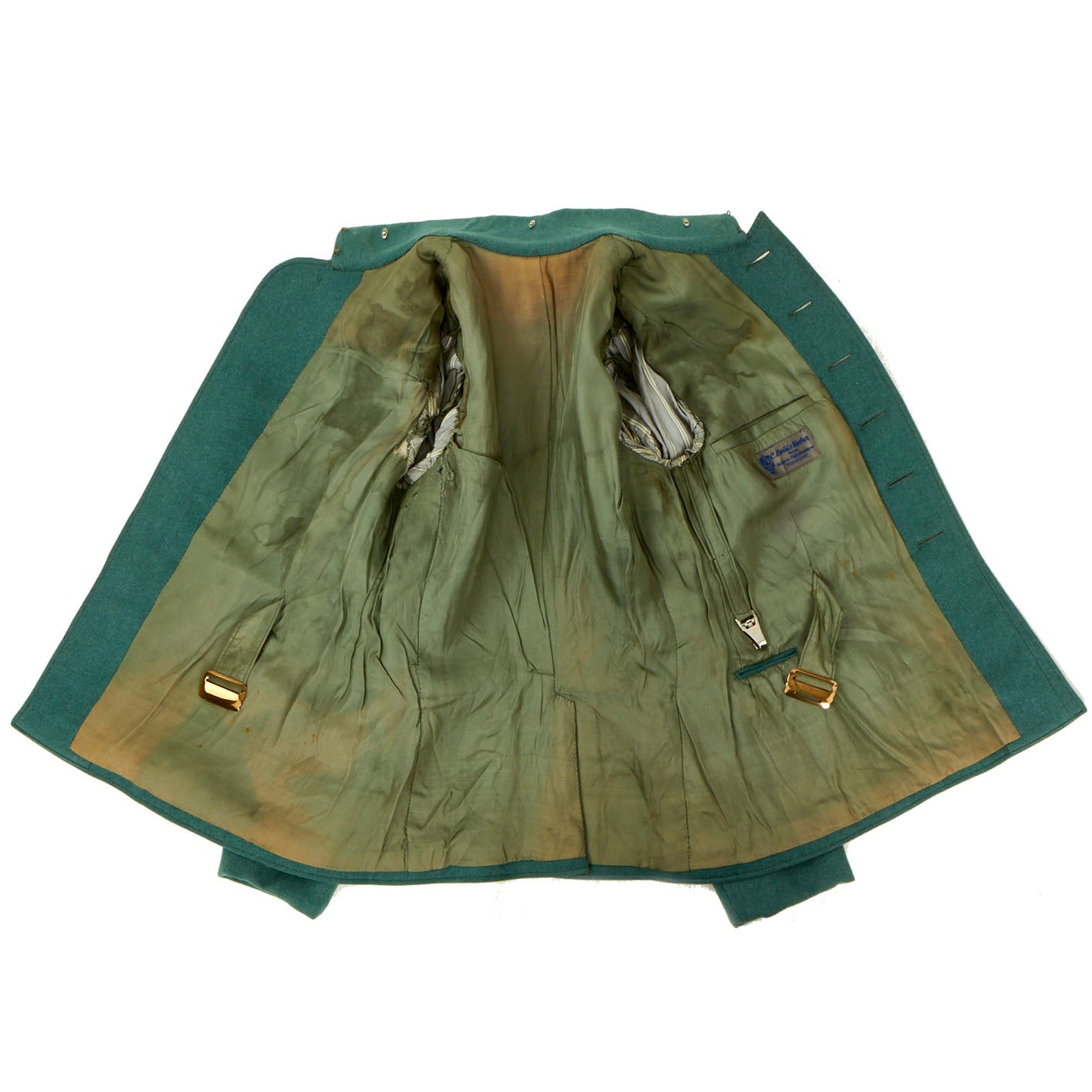 This is a very nice early pattern German WWII Sonderführer M-36 Tunic, showing some light wear and damage from age and service. The design is for the most part identical to the Heer Army version, except that the color is the same Blue Green used for Polizei uniforms during the NSDAP Period. The tunic is of very high quality, and has a maker label on the left front interior under the pocket: