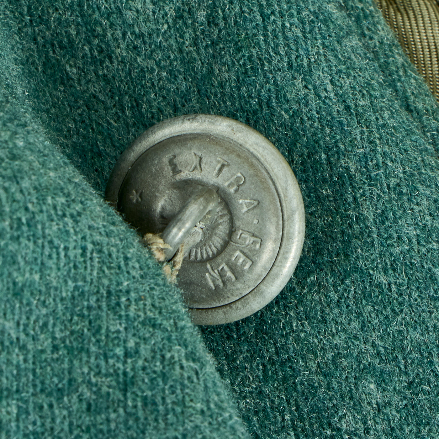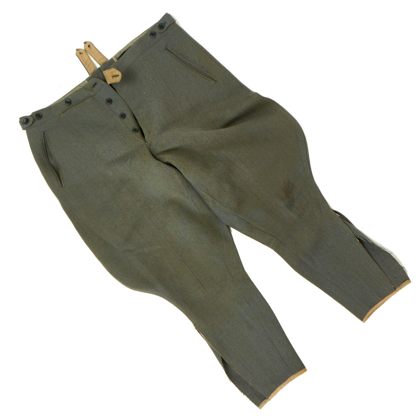 The included breeches are in the Stonegrey “Steingrau” color in a satinet wool, and are in very good condition. The inside bears a maker label reading Georg Kübrick / BAMBERG on the rear, with no other markings we can see. They show light wear, and there are some repairs on the interior around the waist band area where the buttons are. There also looks to have been an area of wear or possibly a tear on the left knee area, which has been reinforced by multiple rows of stitches.