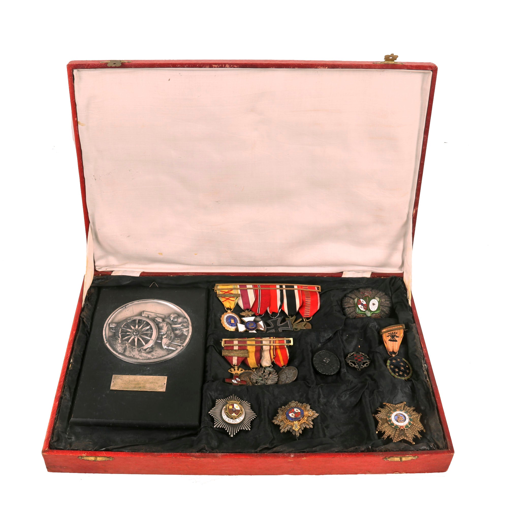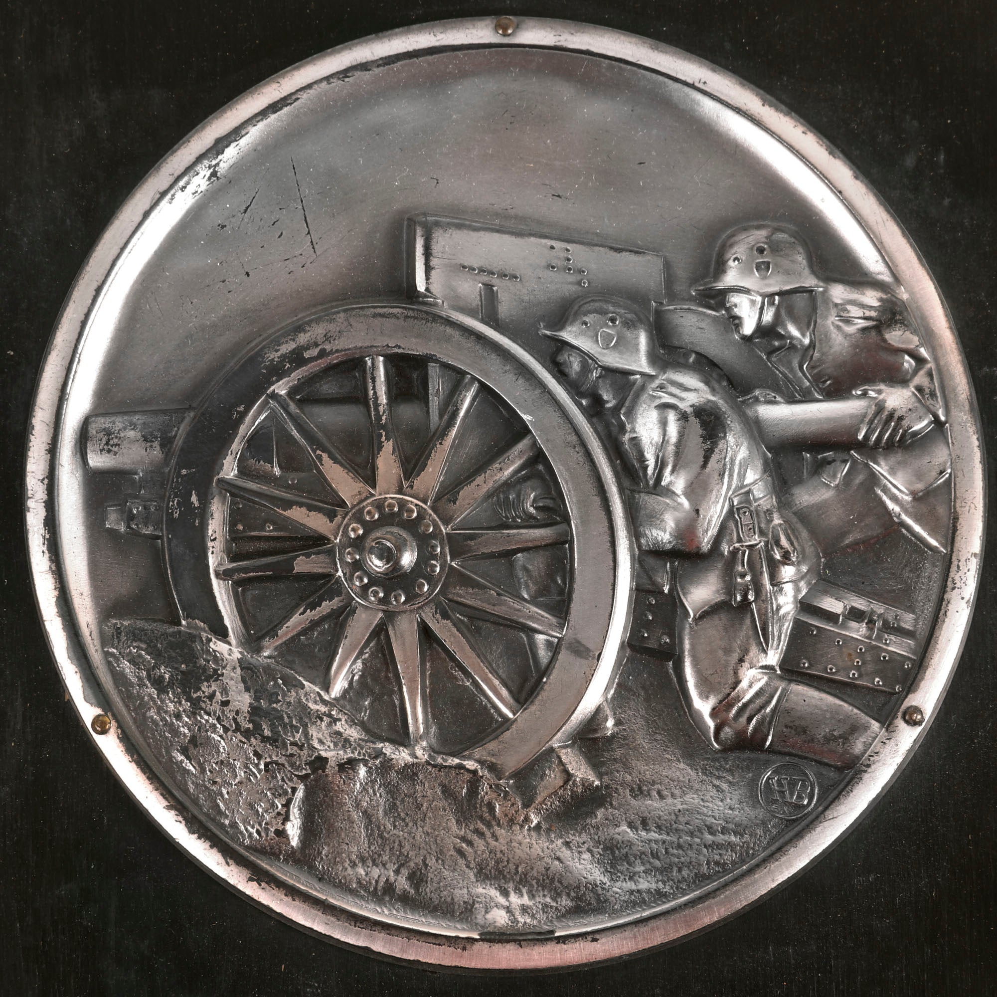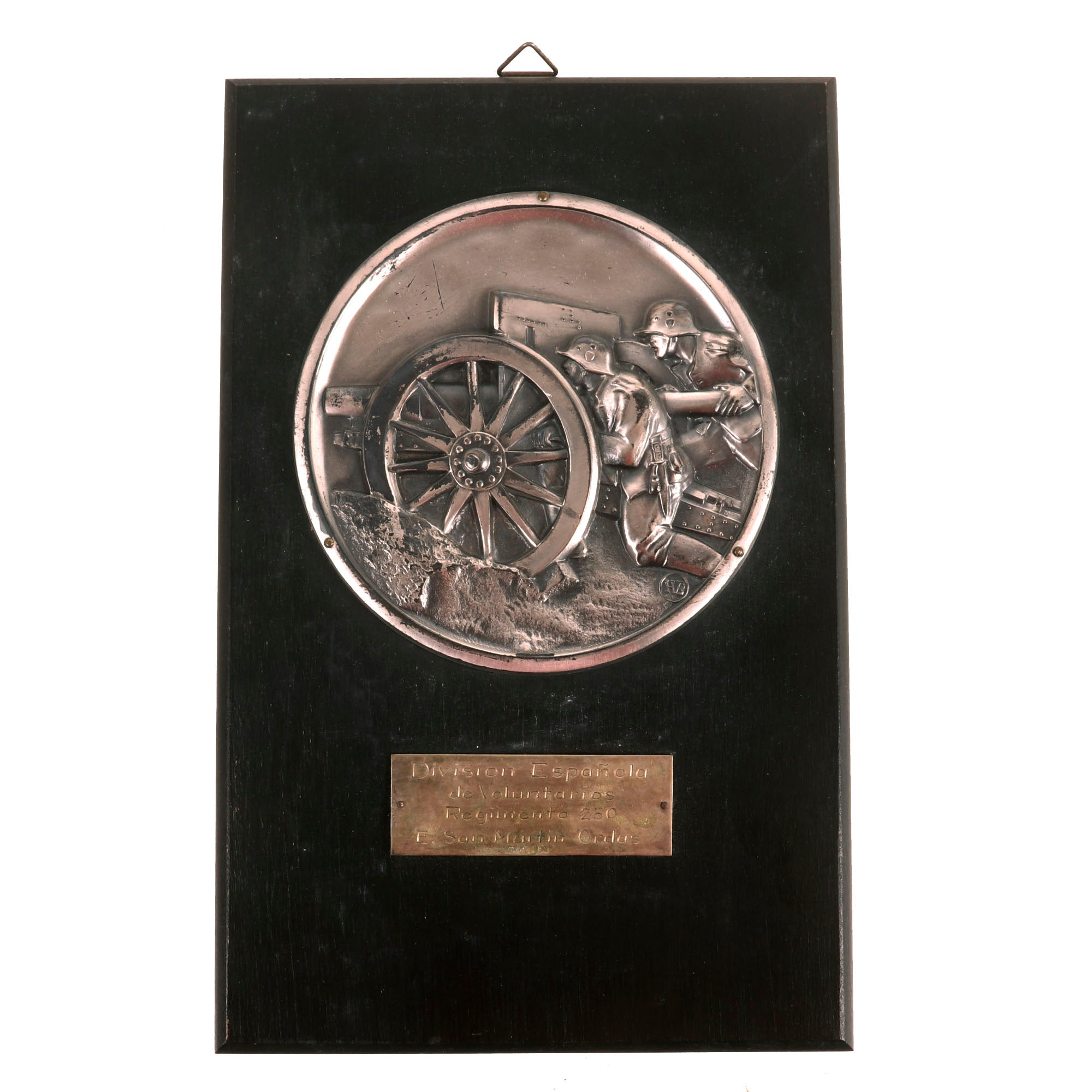 The medal grouping includes a wooden 6 ¼" x 9 ⅞” plaque with a medal depicting two men of the Blue Division firing a field cannon, with a small engraved plaque underneath reading: