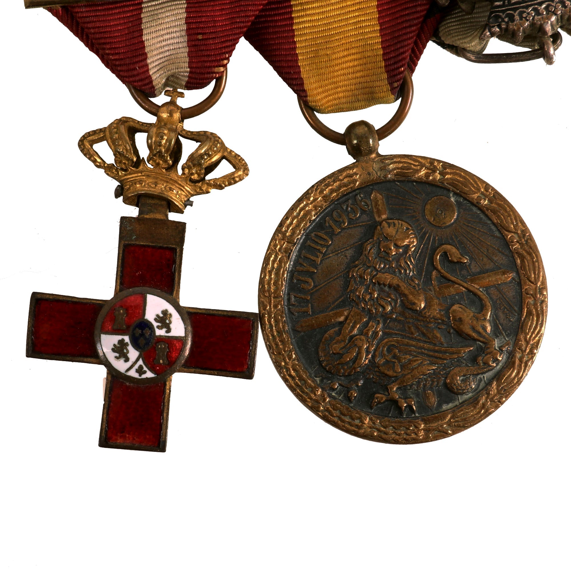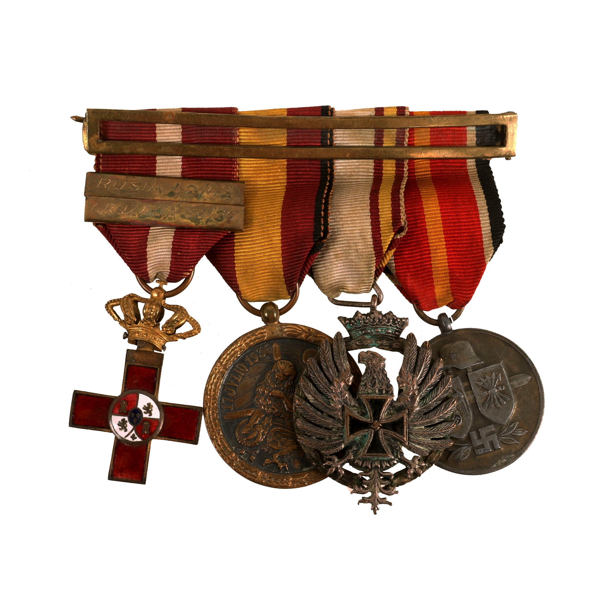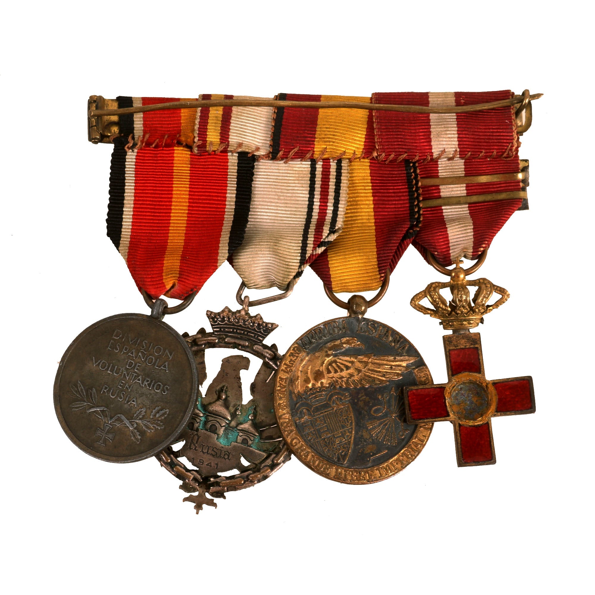 ● One 4-place medal bar with the Spanish Military Merit Cross with clasps for Rusia 42/43 and Cruzada 36/39, the Spanish Civil War Campaign Medal, the Medalla de la Campaña de Rusia ("Medal of the Russian Campaign") in a high-end intricate design, and the Spanish Volunteer Medal (Blue Division Medal).
