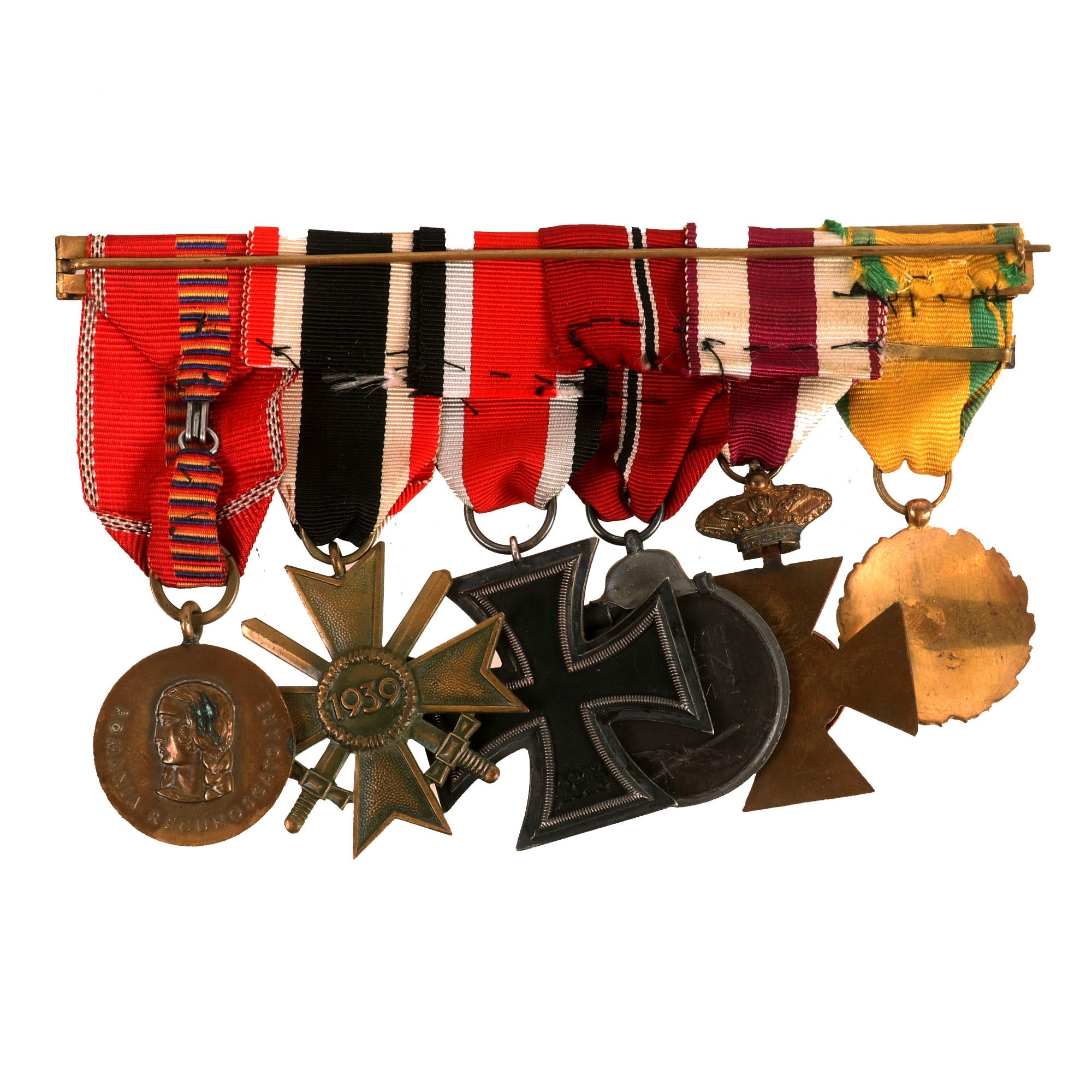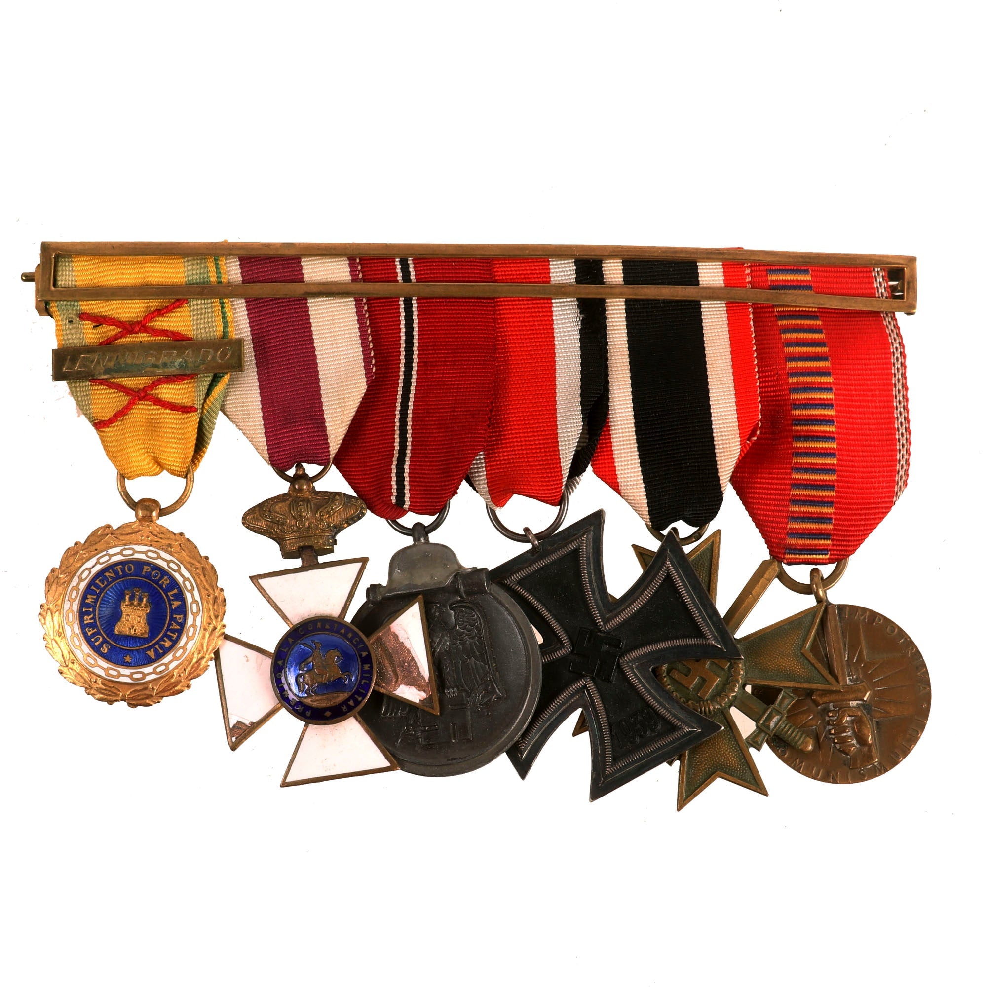 ● One 6-place medal bar with the Medal of Suffering for the Fatherland with one clasp for LENINGRADO (Leningrad) and two red Xs stitched on denoting wounds, the Officers Constancy Medal, the German Winterschlacht Medal, the German Iron Cross 2nd Class, the German War Merit Cross with Swords, and the Romanian Crusade Against Communism Medal.