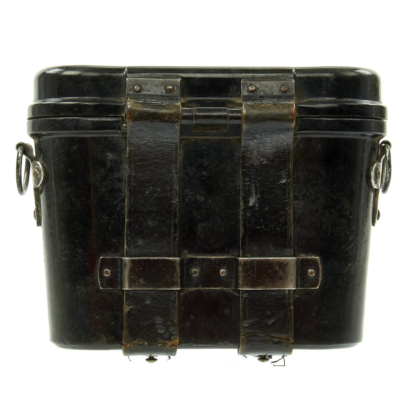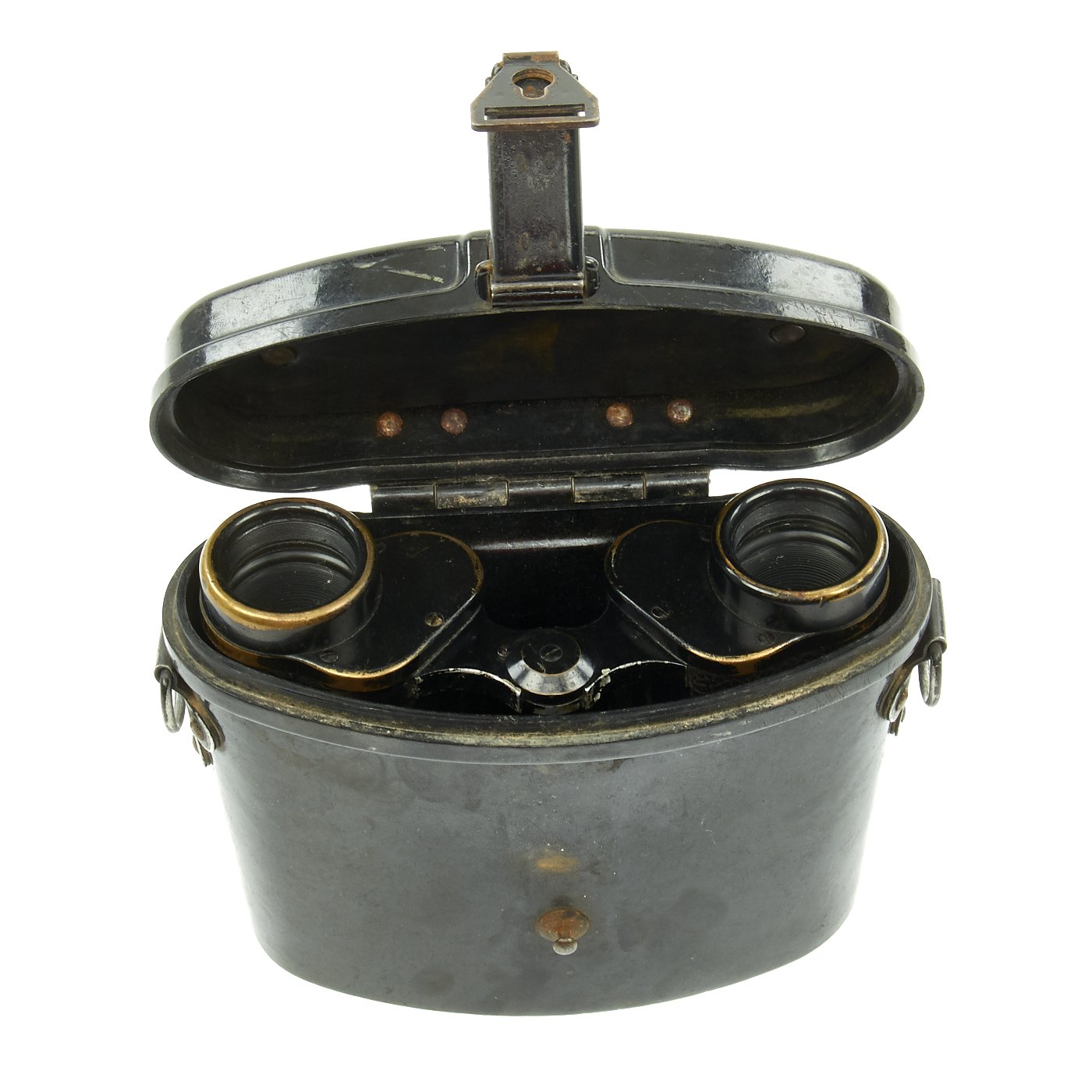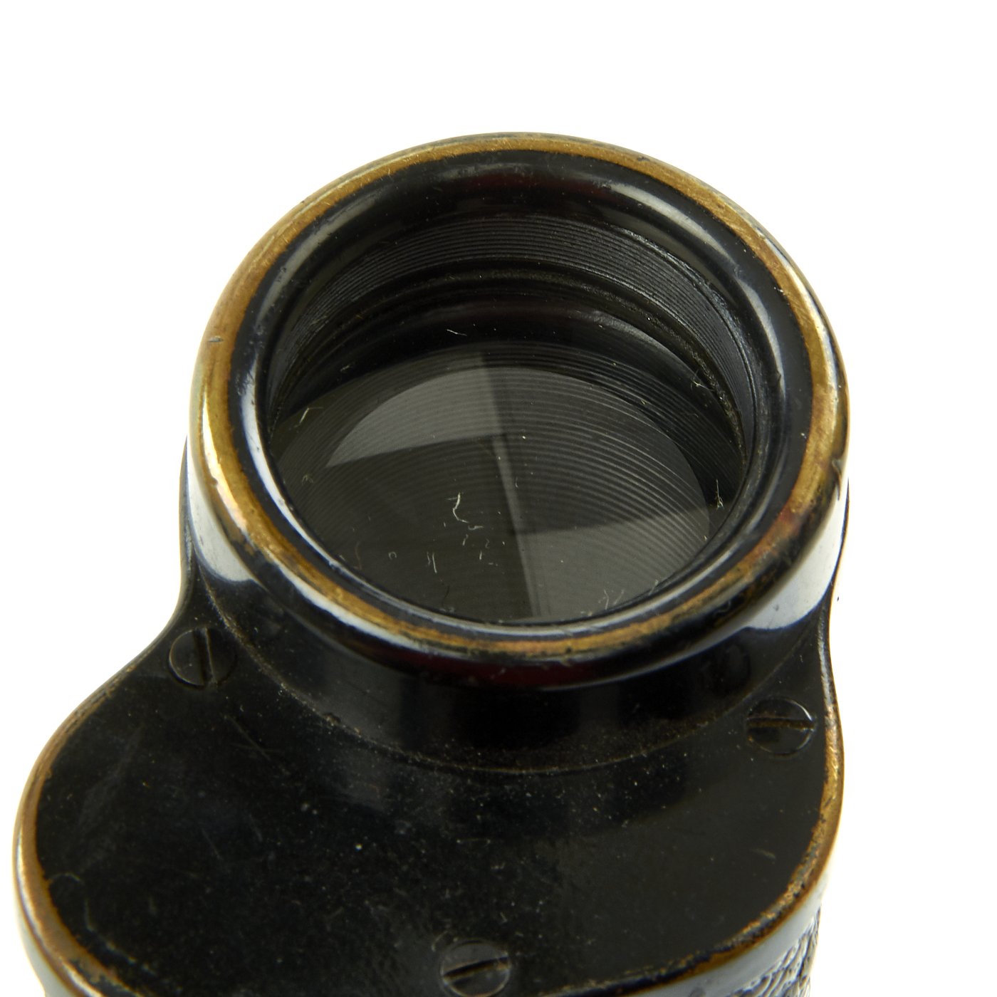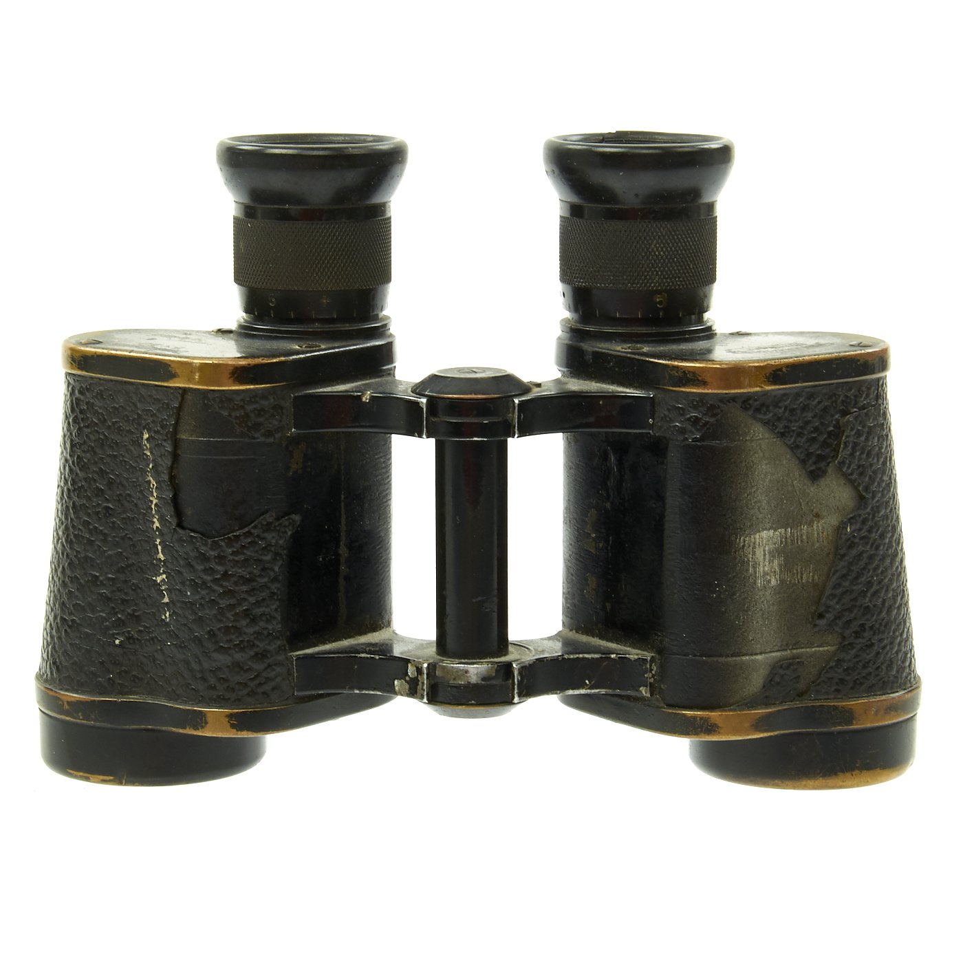 The use of the company name, and not a three letter code, indicates that these were made prior to 1940. Spindler & Hoyer is a rare and desirable maker of these binoculars. Both diopter adjustments work correctly, though the optics and mirrors could use some cleaning. The leather chin strap is unfortunately missing, and the black plastic covering on the barrels is about 50% missing, and the rest is somewhat delicate.