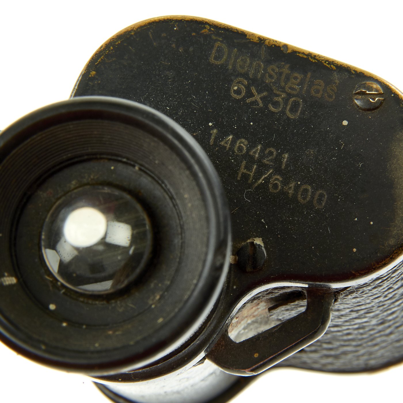 Original Item: Only One Available. The 6x30 Dienstglas was one of the most used German issued binoculars of WWII. This example is fully functional, with mostly clear optics, complete with a range reticle in the right eye piece. It is nicely marked as follows on the base of the barrels: