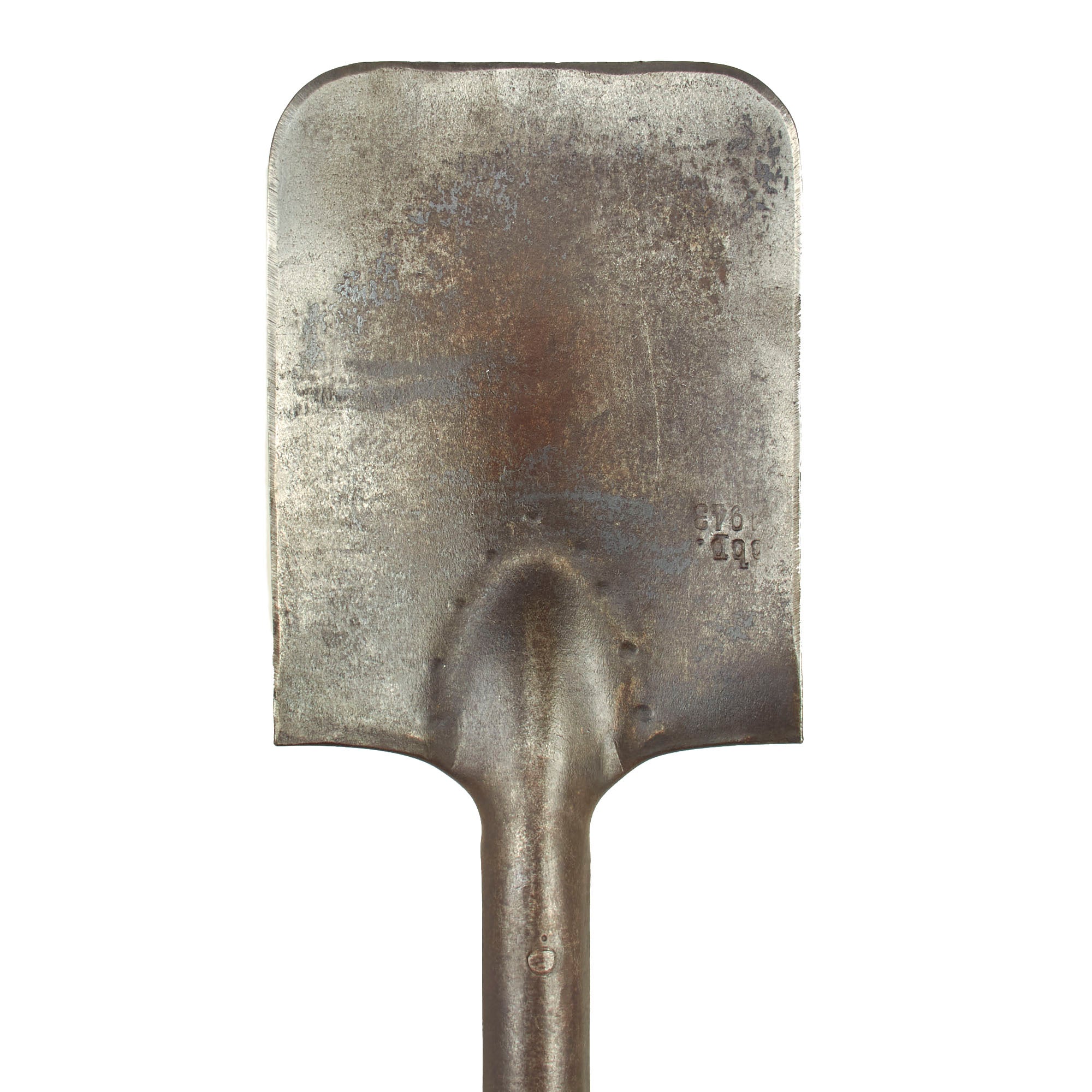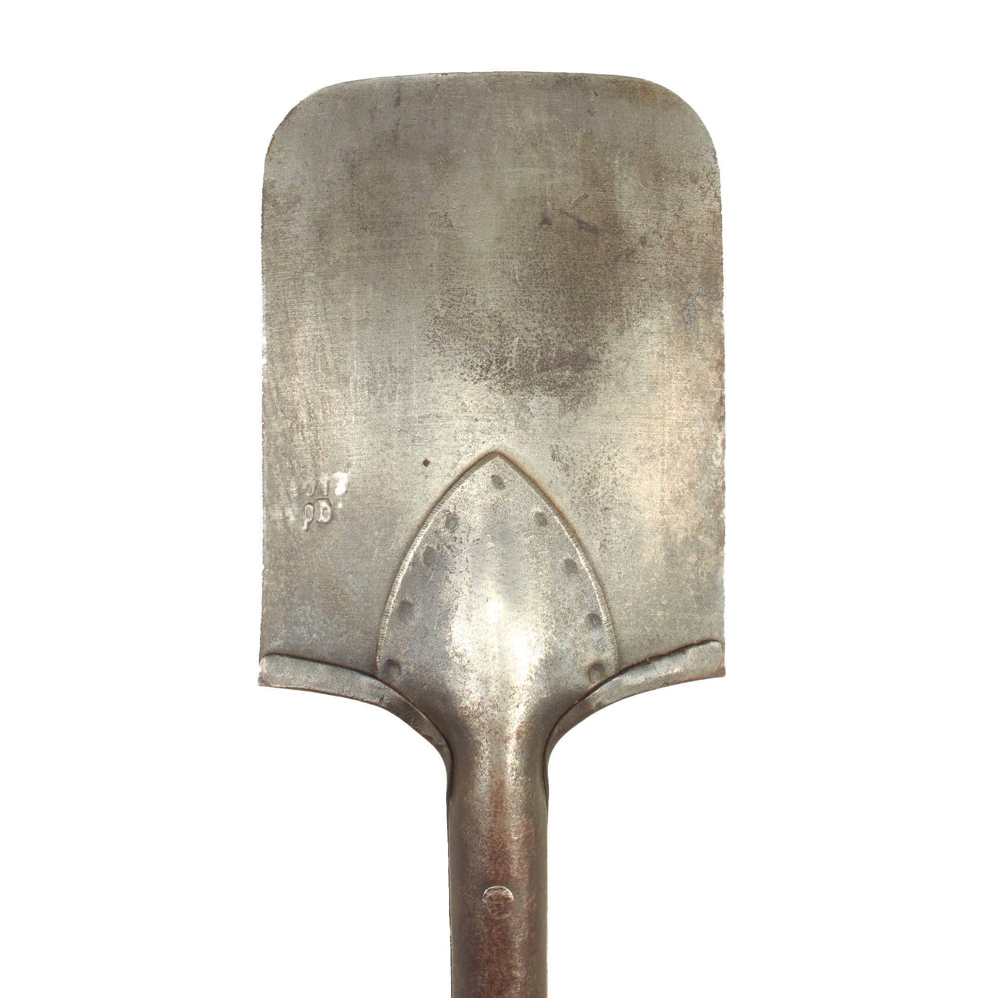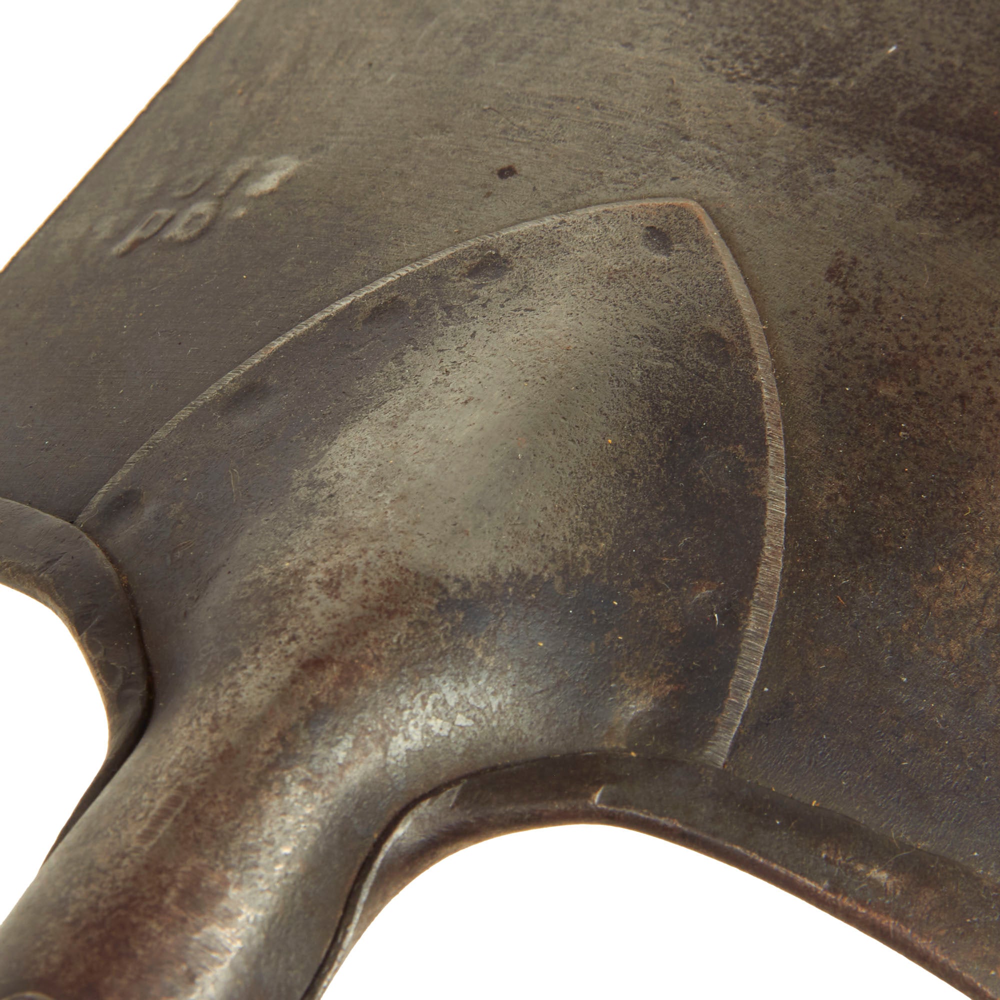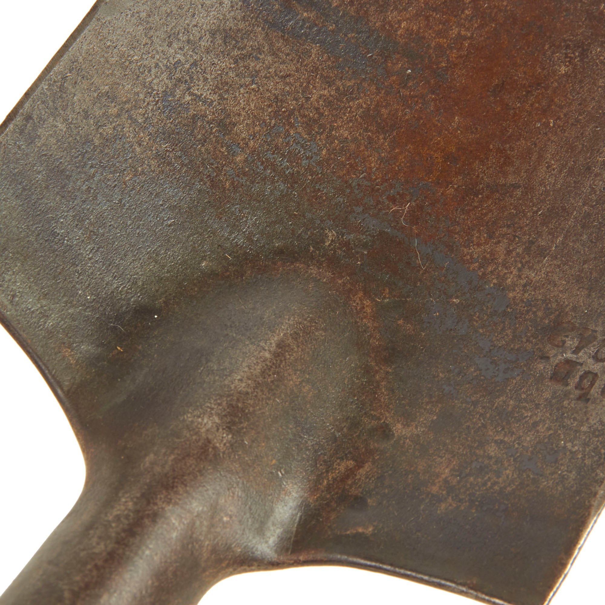The entrenching tool consists of a roughly, 13” long turned hardwood handle with an enlarged ball head for ease of handling and a roughly, 7” x 5 ¾” slightly curved, tooled steel construction shovel head. The handle is secured to the shovel head by dual extended steel sleeves with two flush, flat head retaining rivets. The obverse extended sleeve is integral to the shovel head while the reverse sleeve is a separate triangular plate that is secured to the shovel head. Nicely maker marked obp with a 1943 date, for maker Carl Krampe Wwe, in Rummenohl, Westfalen.