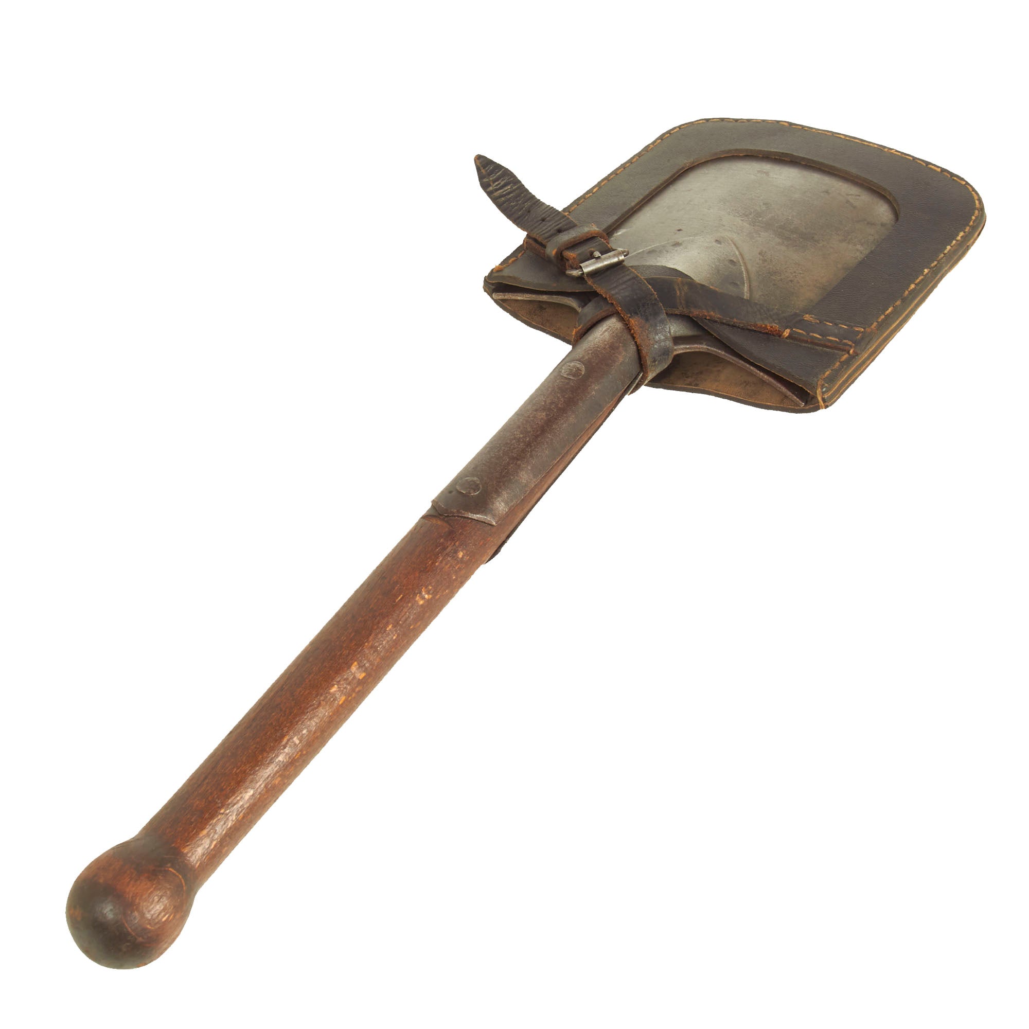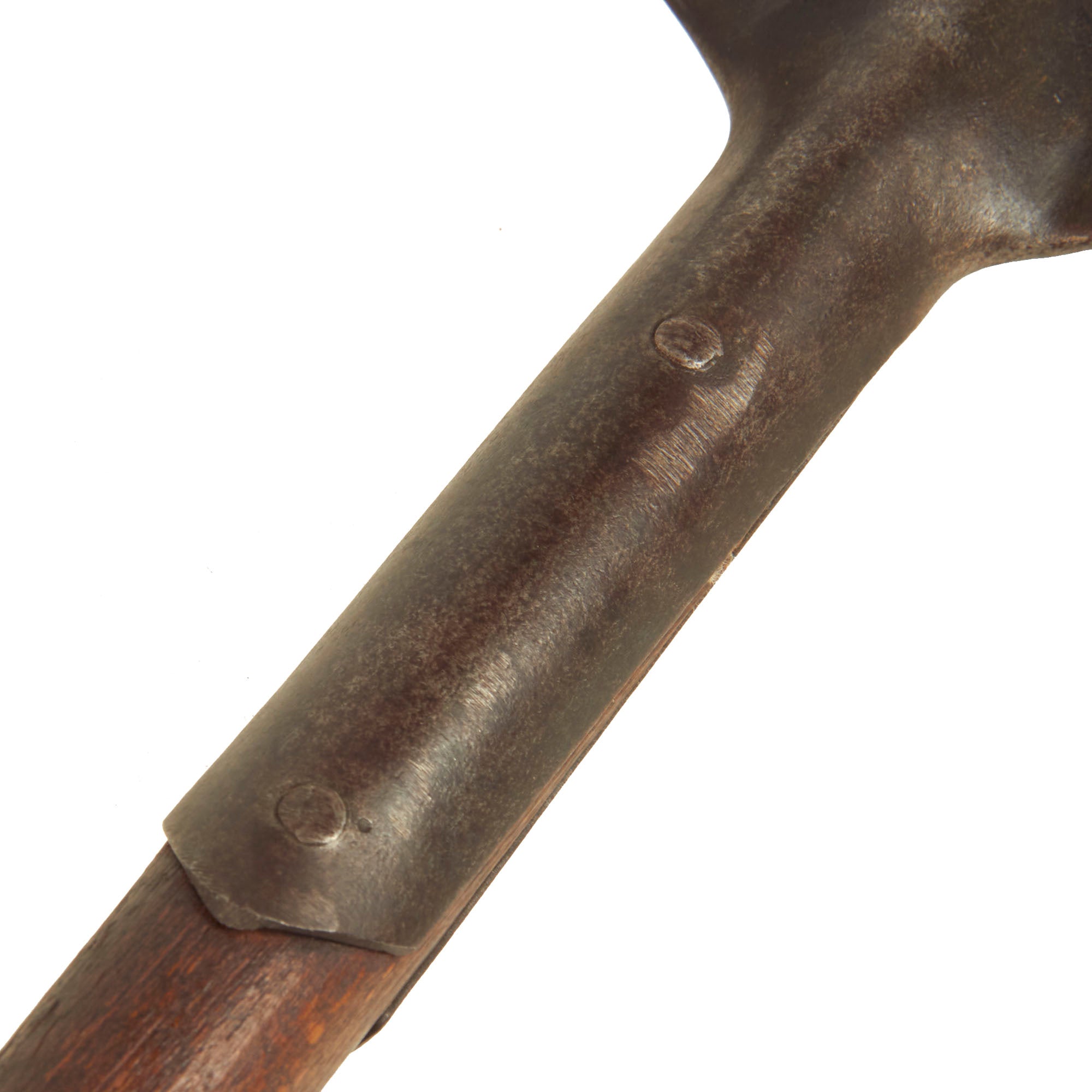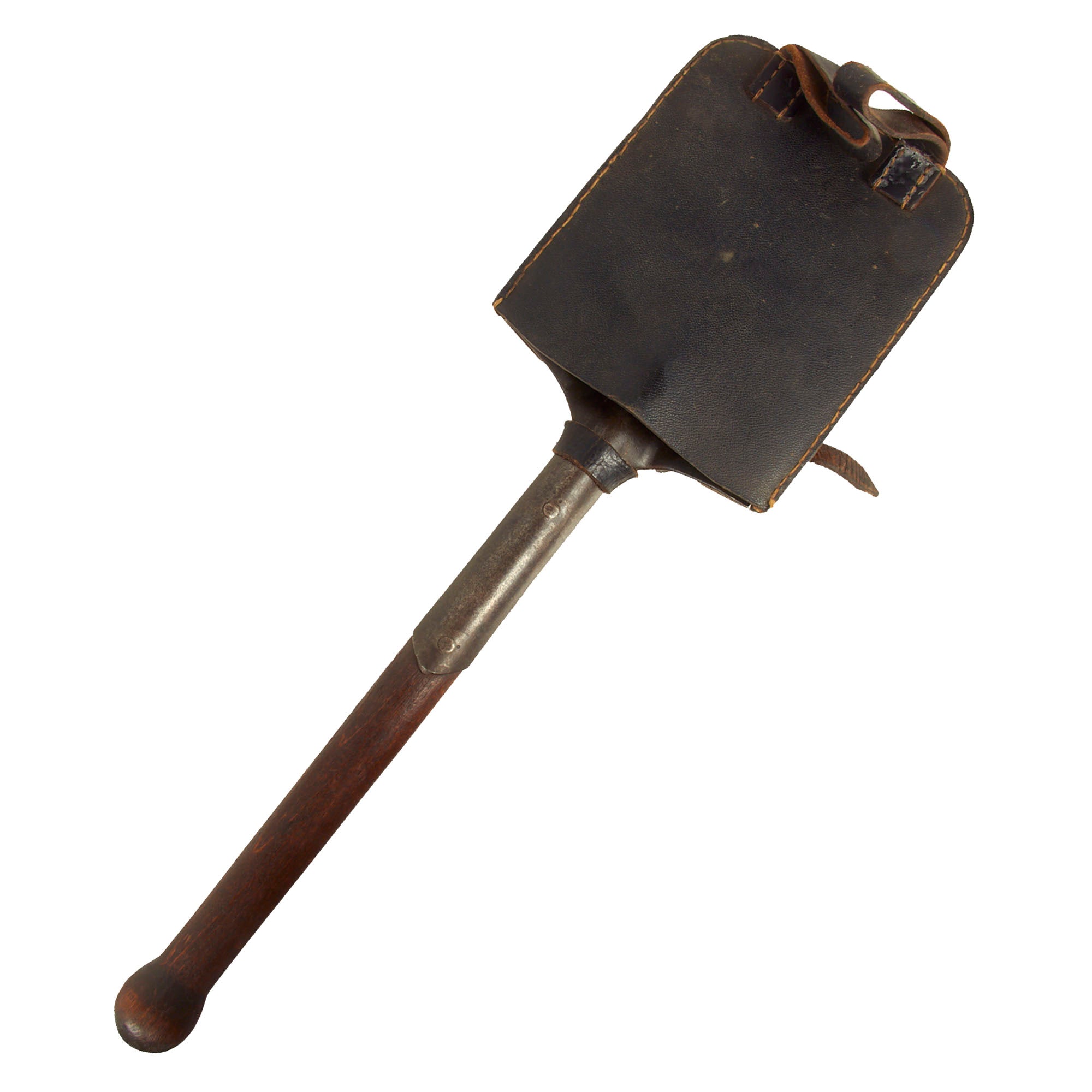 The entrenching tool consists of a roughly, 13” long turned hardwood handle with an enlarged ball head for ease of handling and a roughly, 7” x 5 ¾” slightly curved, tooled steel construction shovel head. The handle is secured to the shovel head by dual extended steel sleeves with two flush, flat head retaining rivets. The obverse extended sleeve is integral to the shovel head while the reverse sleeve is a separate triangular plate that is secured to the shovel head. Nicely maker marked obp with a 1943 date, for maker Carl Krampe Wwe, in Rummenohl, Westfalen.