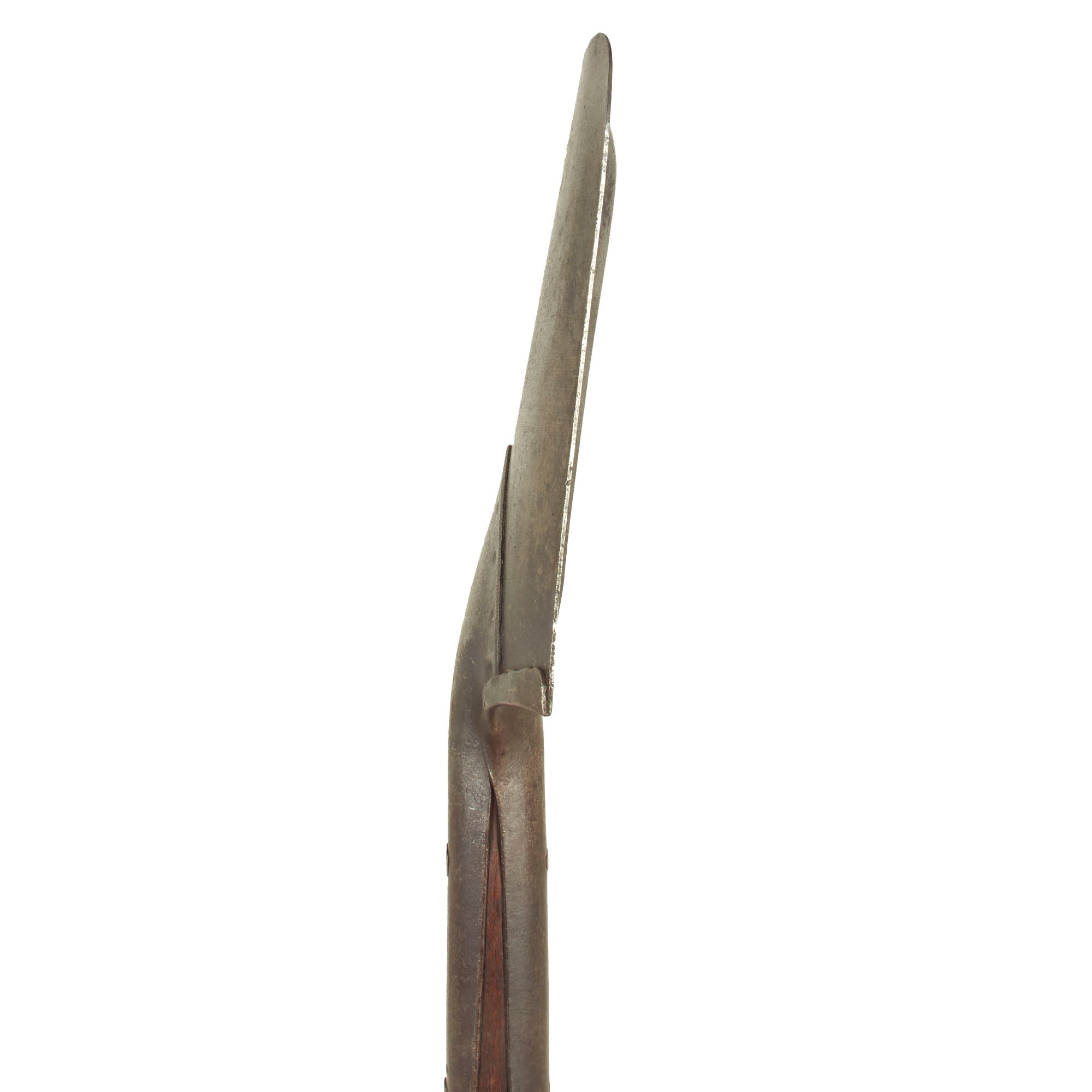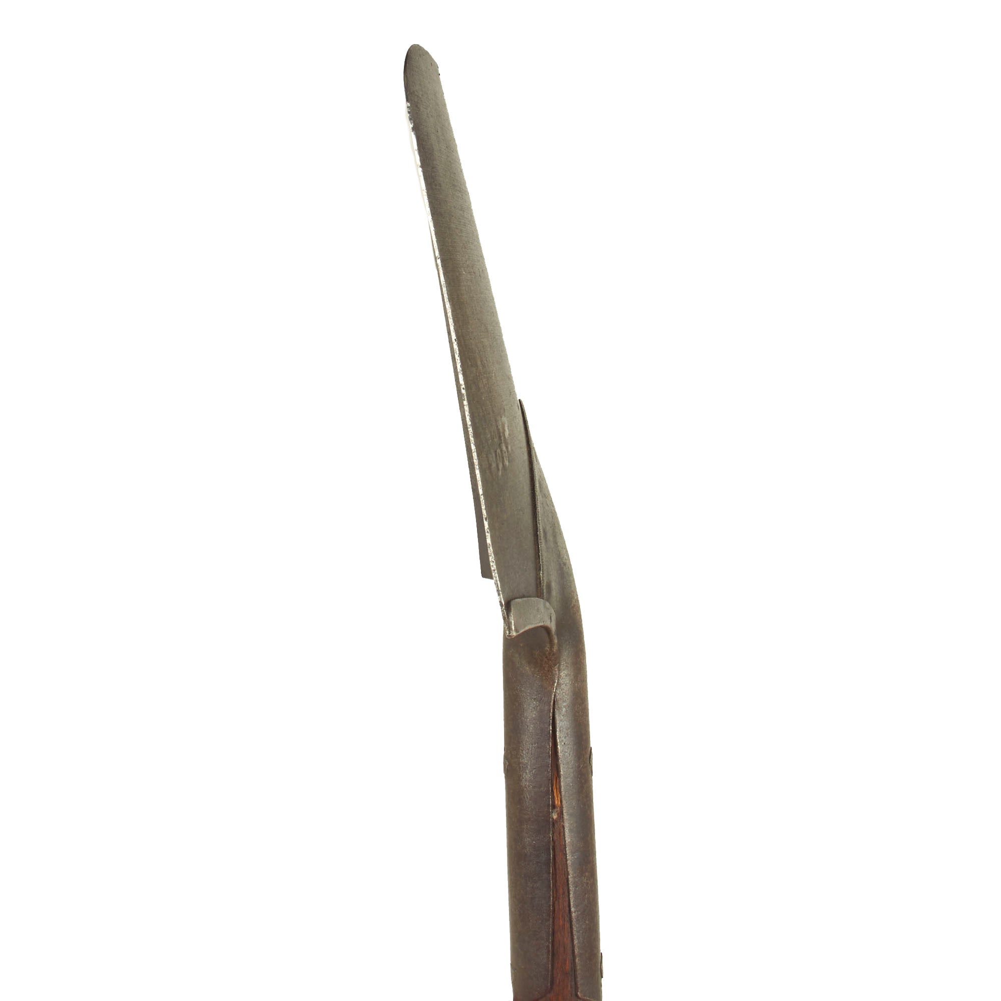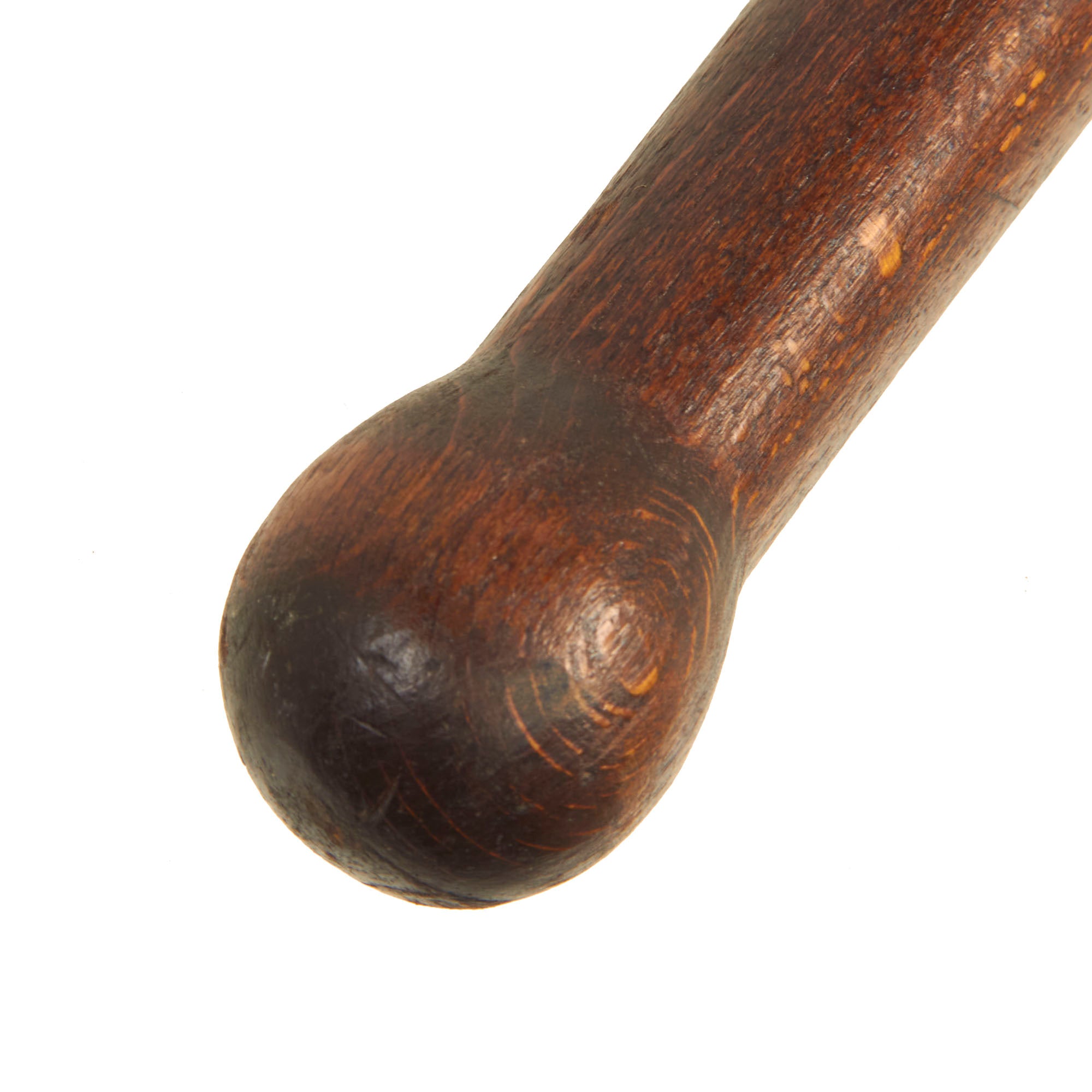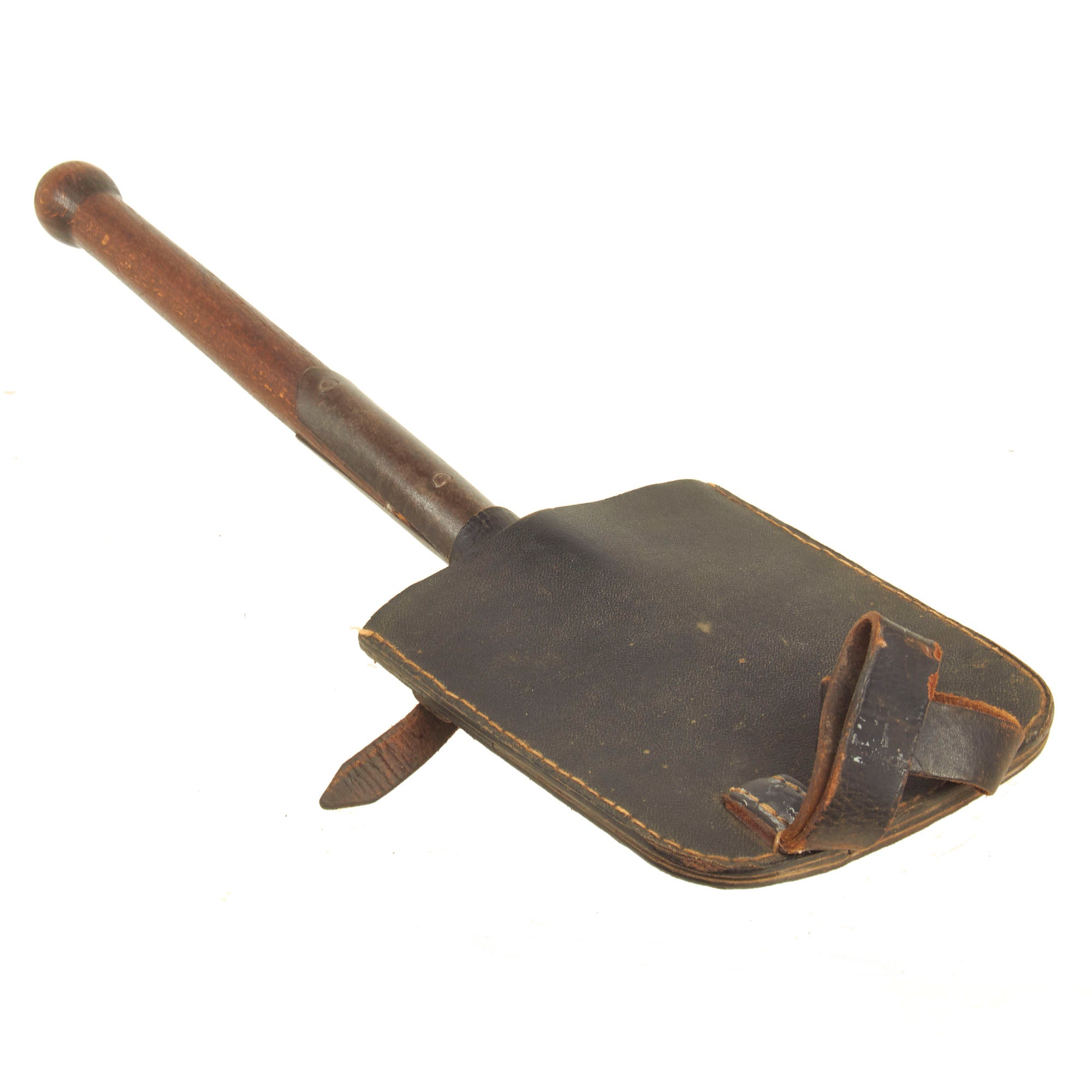 The entrenching tool consists of a roughly, 13” long turned hardwood handle with an enlarged ball head for ease of handling and a roughly, 7” x 5 ¾” slightly curved, tooled steel construction shovel head. The handle is secured to the shovel head by dual extended steel sleeves with two flush, flat head retaining rivets. The obverse extended sleeve is integral to the shovel head while the reverse sleeve is a separate triangular plate that is secured to the shovel head. Nicely maker marked obp with a 1943 date, for maker Carl Krampe Wwe, in Rummenohl, Westfalen.