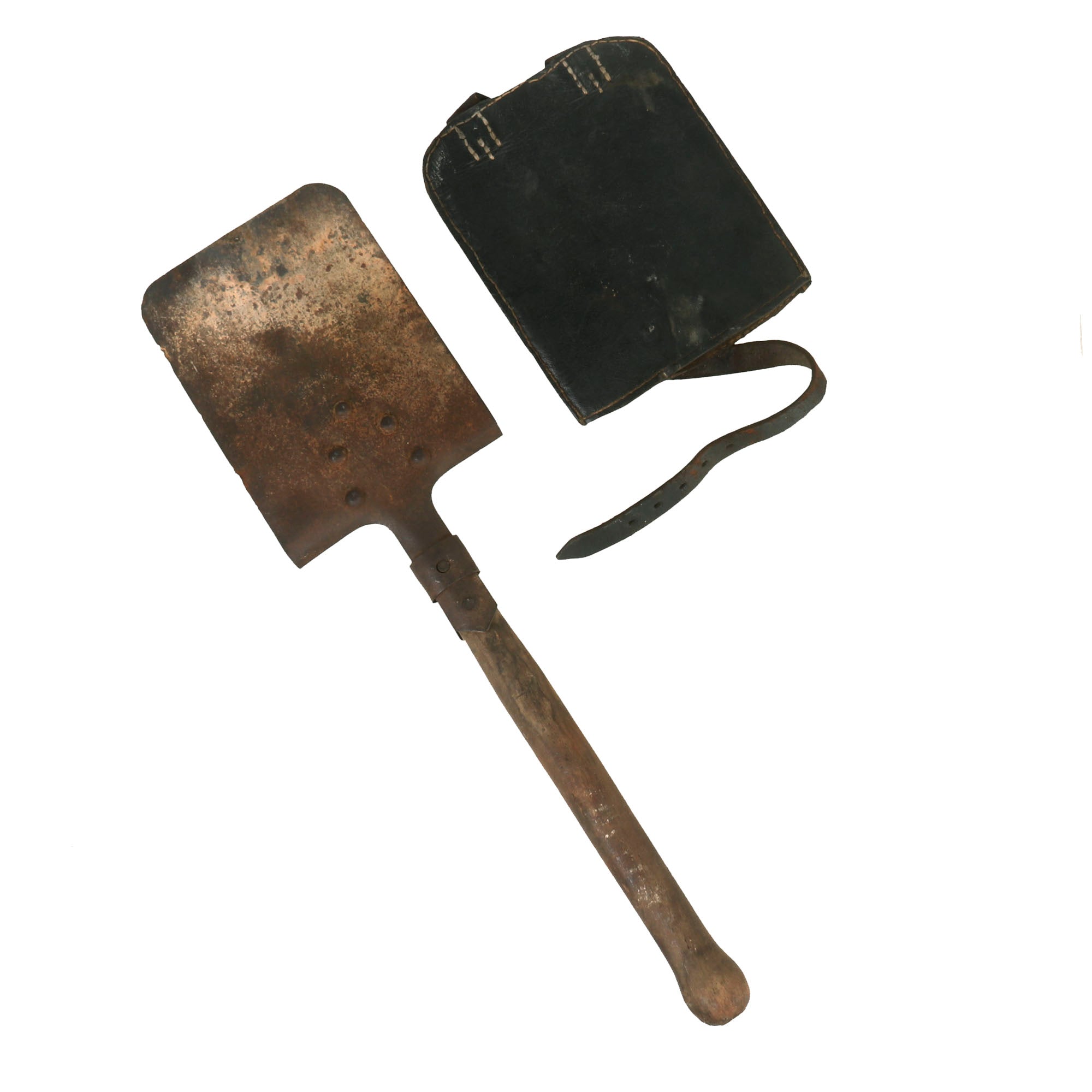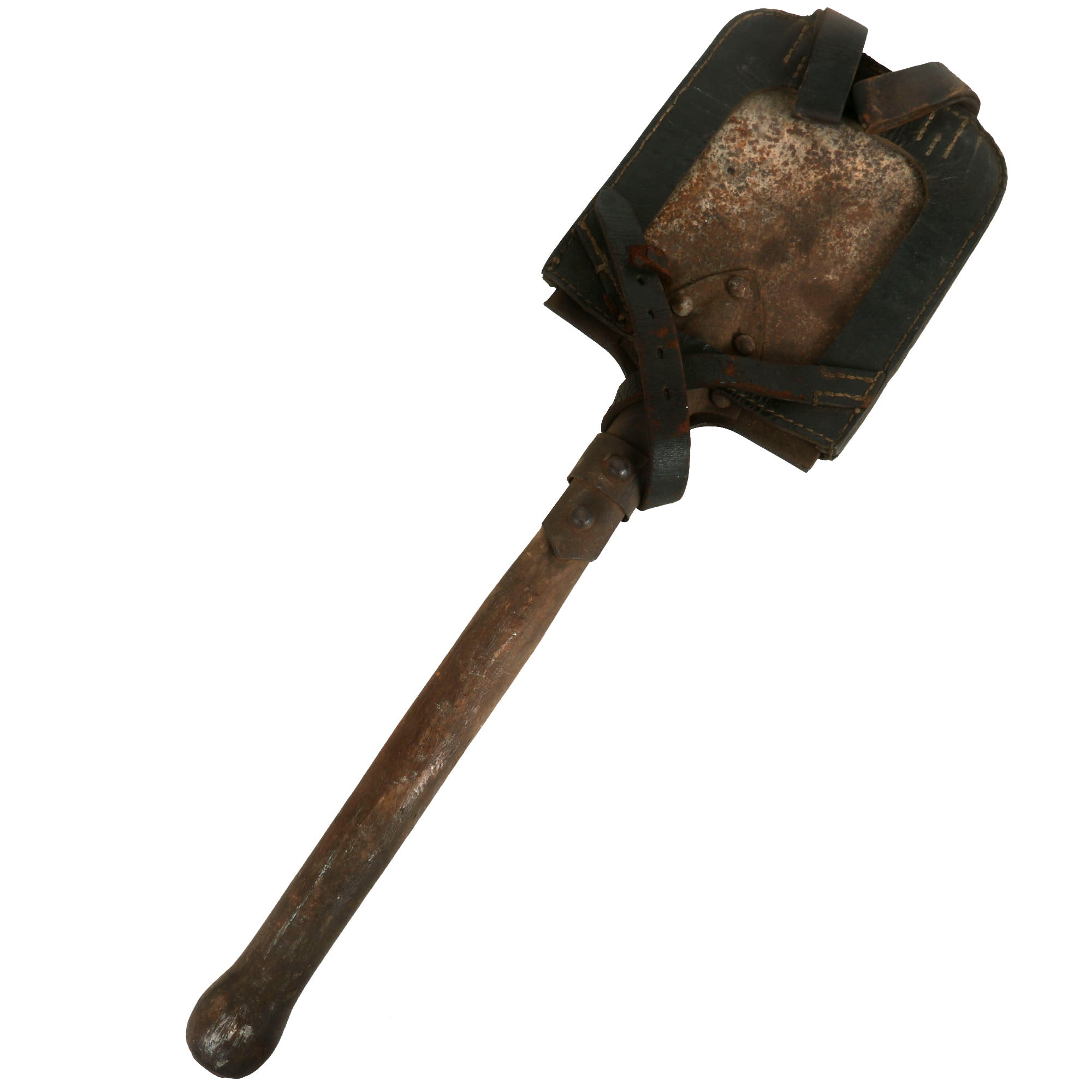 Original Item: Only One Available. The entrenching tool was a basic item issued to all EM/NCO’s and was issued with a specific carrying case that was to be worn on the load carrying waist belt. Originally the non-folding entrenching tool utilized by the Germany army in WWII was a carryover of the WWI and Reichswehr era M1887 entrenching tool until November 12, 1938 when a new improved folding shovel was introduced to replace the earlier non-folding pattern. Although the new folding shovel proved more practical and popular with the troops, the earlier entrenching tool was utilized right up until the end of the war. The entrenching tool was a very valuable piece of kit enabling the individual soldier to dig in for protection as required and was also utilized as a close combat weapon.