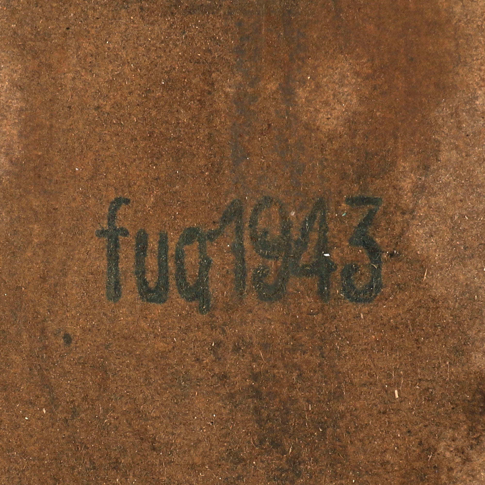 The second pattern carrier is black Preßstoff construction "closed back", entrenching tool carrying case. The case features a triple layered, closed back frame in the shape of the entrenching tools head. The outer edges of the frame all have heavy machine stitched seams. The top edge of the case has two leather loops designed to secure the case to the individual’s waist belt. The carrier is ink-stamped on the interior fuq 43, for Cottbusser Lederwarenwerk Curt Vogel KG, Cottbus, Wernerstrasse 62, a known maker of P08 holsters and other leather goods.