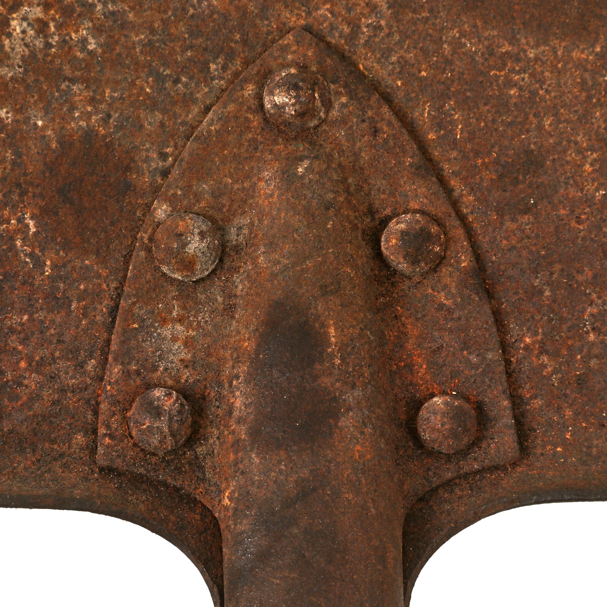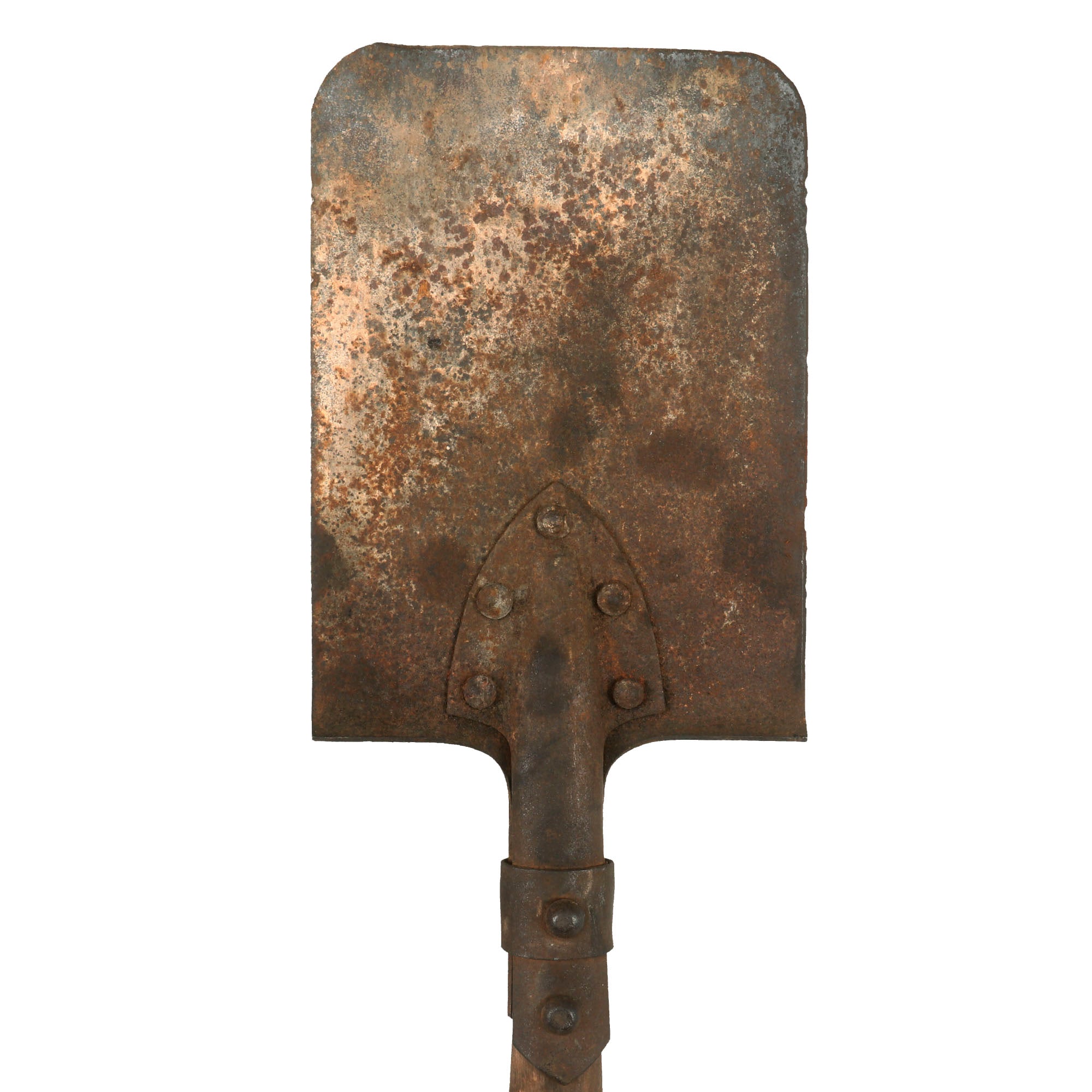 This entrenching tool consists of a roughly, 14” long (including the length inside the head) turned hardwood handle with an enlarged ball head for ease of handling and a roughly, 7¾” x 5⅝” nearly flat, tooled steel construction shovel head. The handle is secured to the shovel head by dual extended steel sleeves with two large cylindrical head retaining rivets. The shovel itself may have been maker-marked long ago but is now too oxidized to be recognizable.