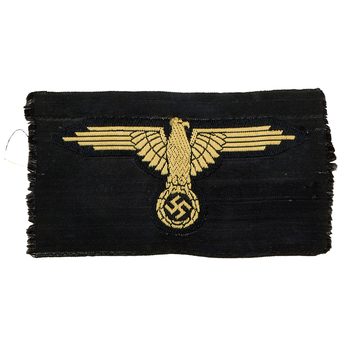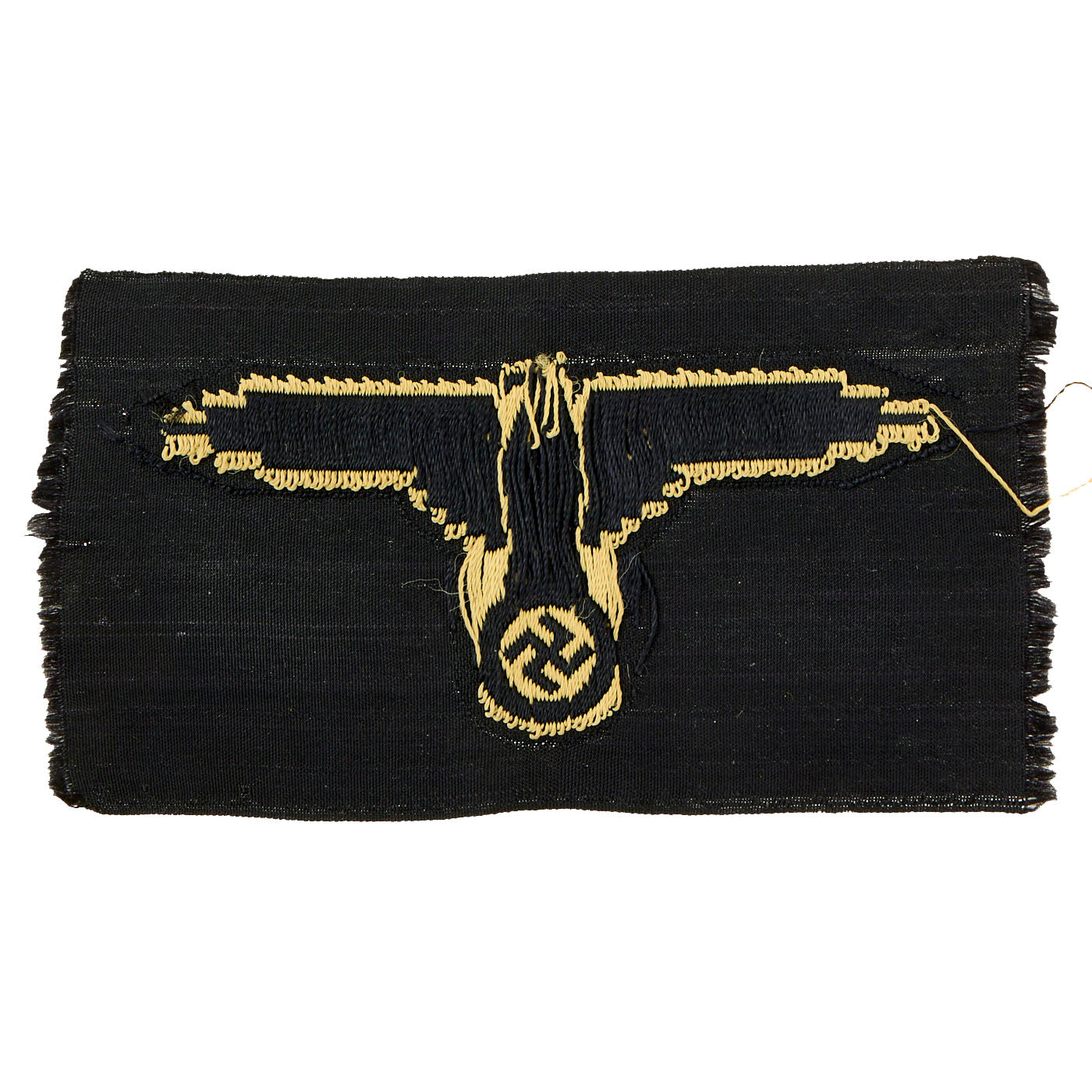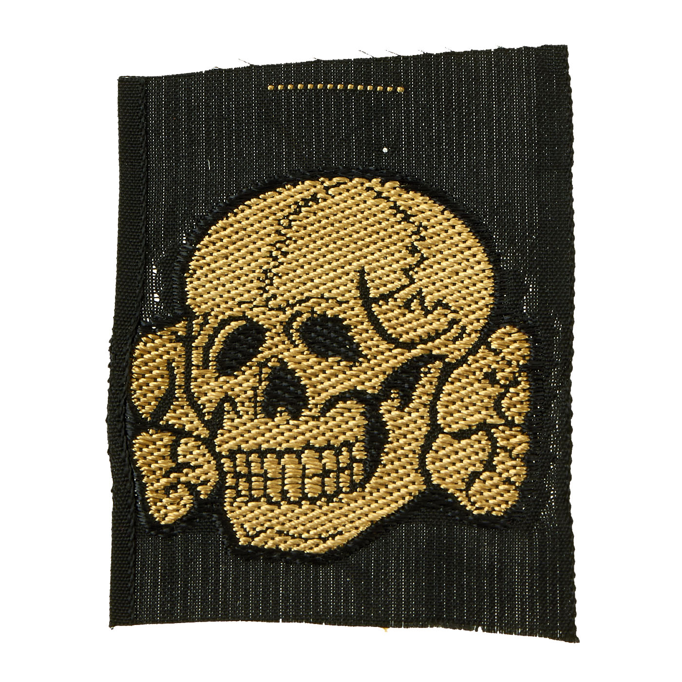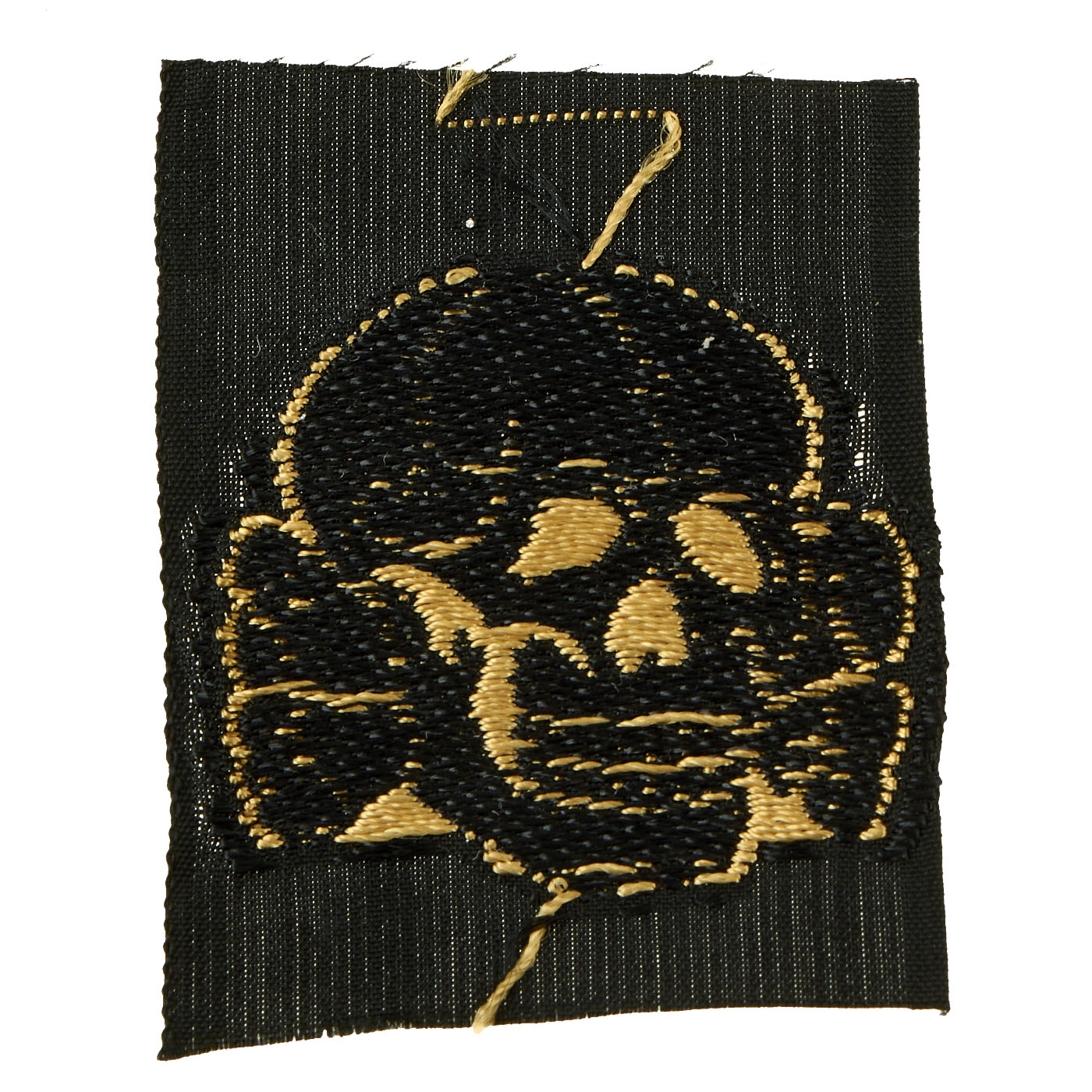 The cap eagle features outstretched wings clutching an encircled mobile swas in its talons, and is made from black and light tan thread woven into black rayon base. The Death's Head has a correct double row of teeth, and is woven from the same materials. Both show only light wear, and are still attached to the correct fabric rectangles, which indicates that they were never attached to a cap.