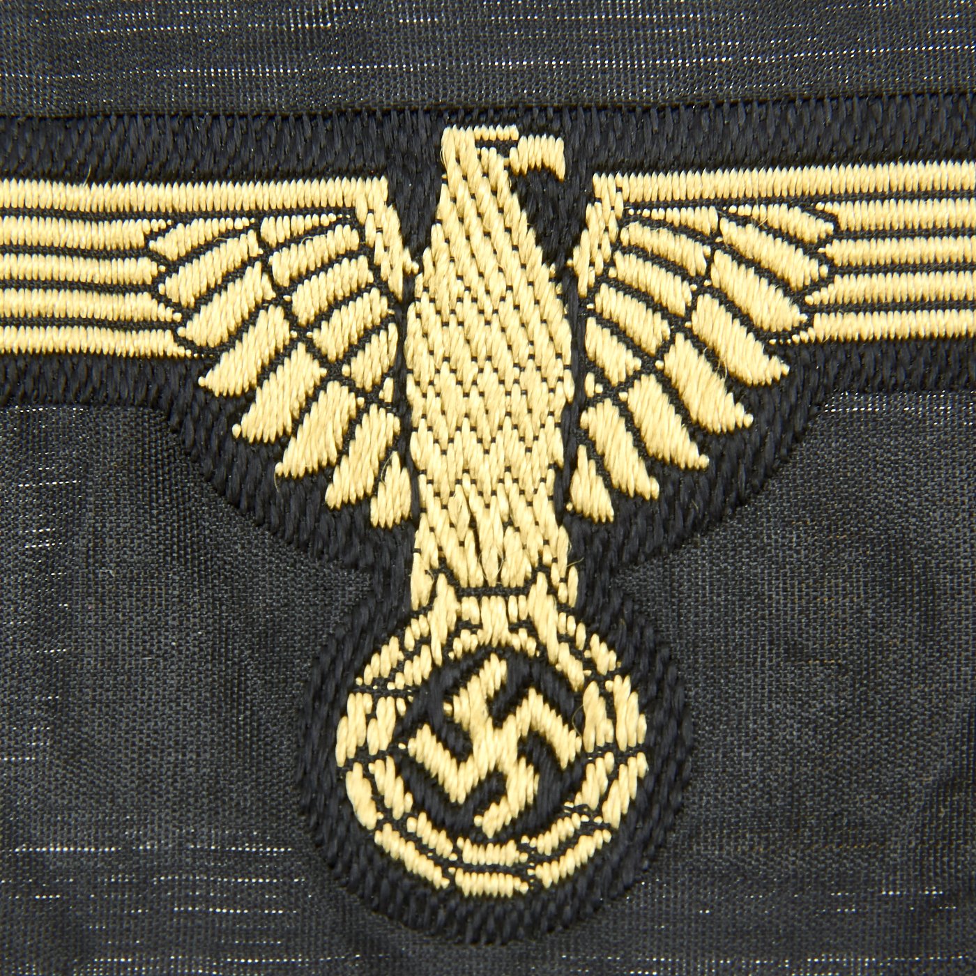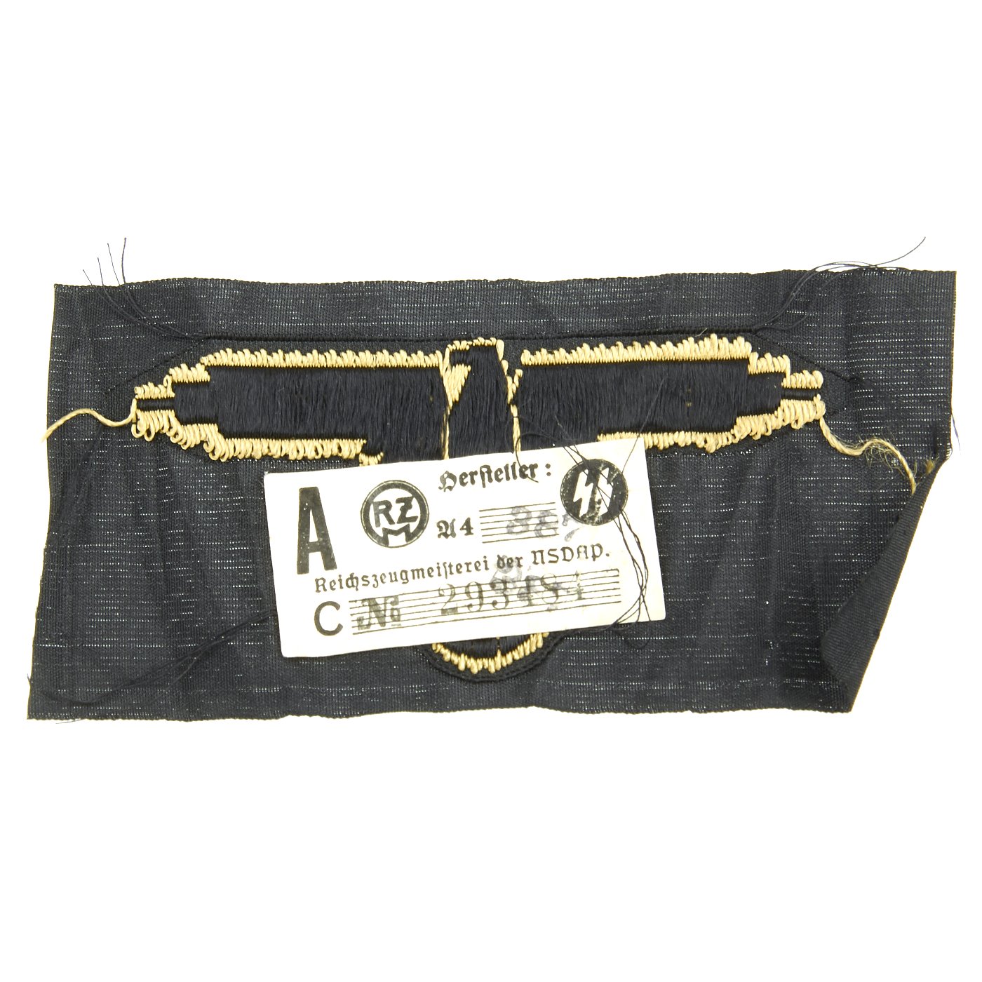 Original Item: Only One Available. This is an excellent unissued BeVo woven construction, Deutsches Afrika Korps SS style national eagle. It features outstretched wings clutching an encircled mobile swas in its talons on a woven, black rayon base. The reverse bears original paper RZM tag, which is also in great shape. The tag has a correct “A” tax code and features the RZM logo as well as the ink stamped numerical designation of the hersteller (manufacturer) A4/387 over lot No. 293484.