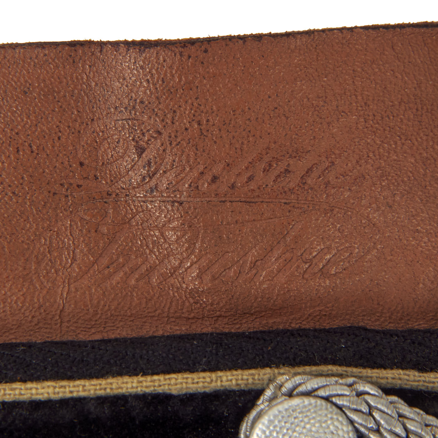 The center band is produced in black velvet and in very good condition. The nickel silver finished insignia are in wonderful crisp condition. The silver bullion chinstrap is very good. The black vulkanfibre visor is in great condition. The underside is finished in an orange/brown hue. The sweatband is in very good condition, securely affixed into the cap. The left side of the sweatband is marked with a maker name “Deutsche Industrie” in Germanic cursive script.