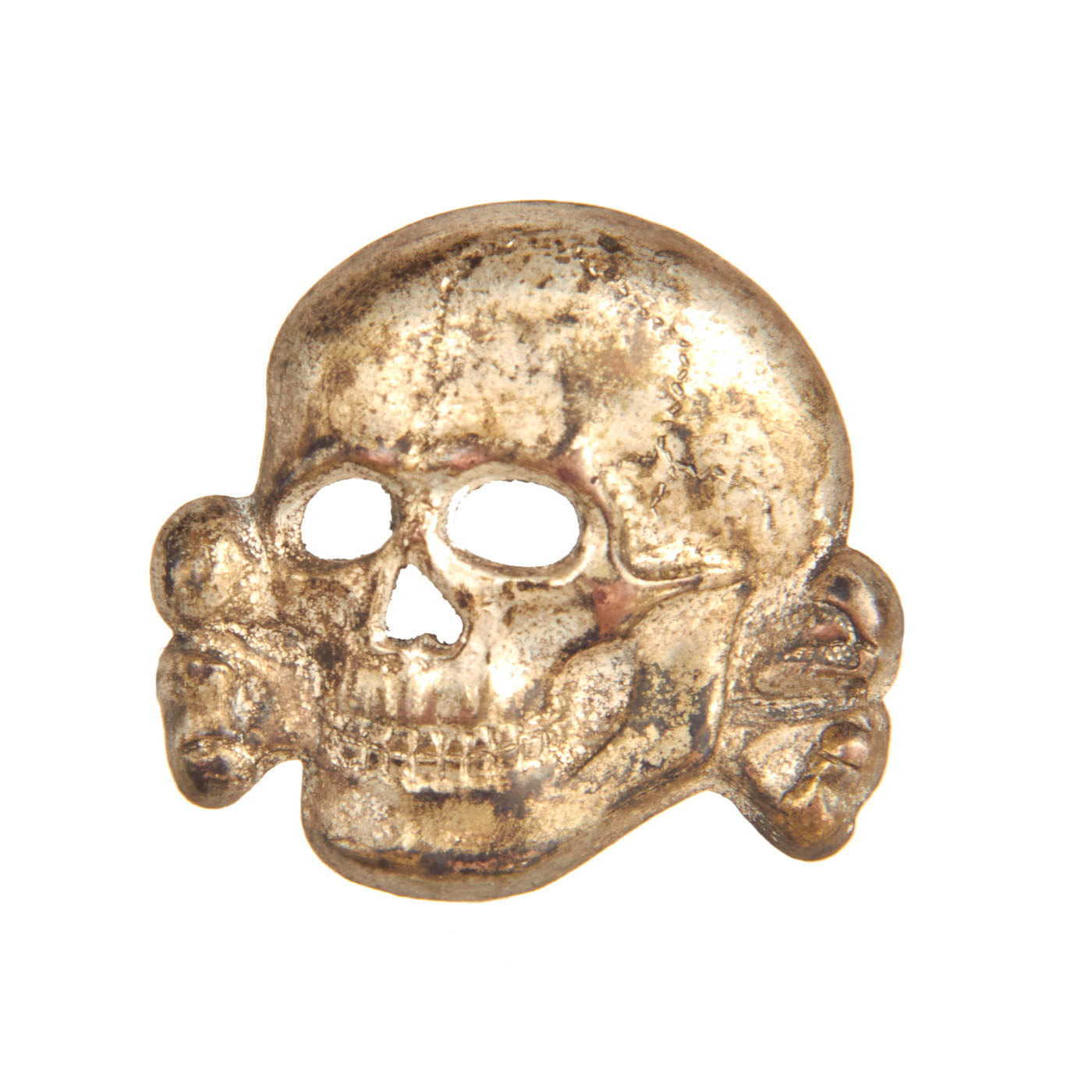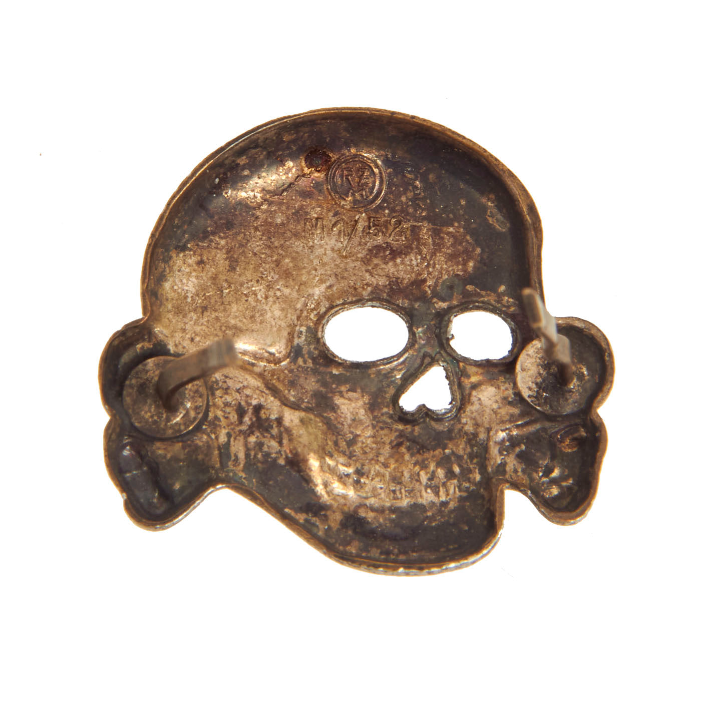 The SS Visor Cap Skull was made by the firm of Deschler & Sohn of München (Munich) in Bavaria. The skull rates, overall, in good condition, and is non-magnetic with a silver wash. The rear shows a clear raised RZM mark over M1/52, the manufacturer's RZM code for Deschler. Two flat wire attachment prongs are attached to the reverse for mounting to a visor. The prongs are soldered to two flat discs which give the prongs added strength by allowing more of a solder area to secure to. Both prongs are original to the skull and have no repairs, confirmed by the silver wash. We carefully removed the skull to picture the rear to verify the authenticity. When we removed the skull, we were pleased to observe a crisp “ghost” indentation where the skull had been in place on the Cap for a very long time!