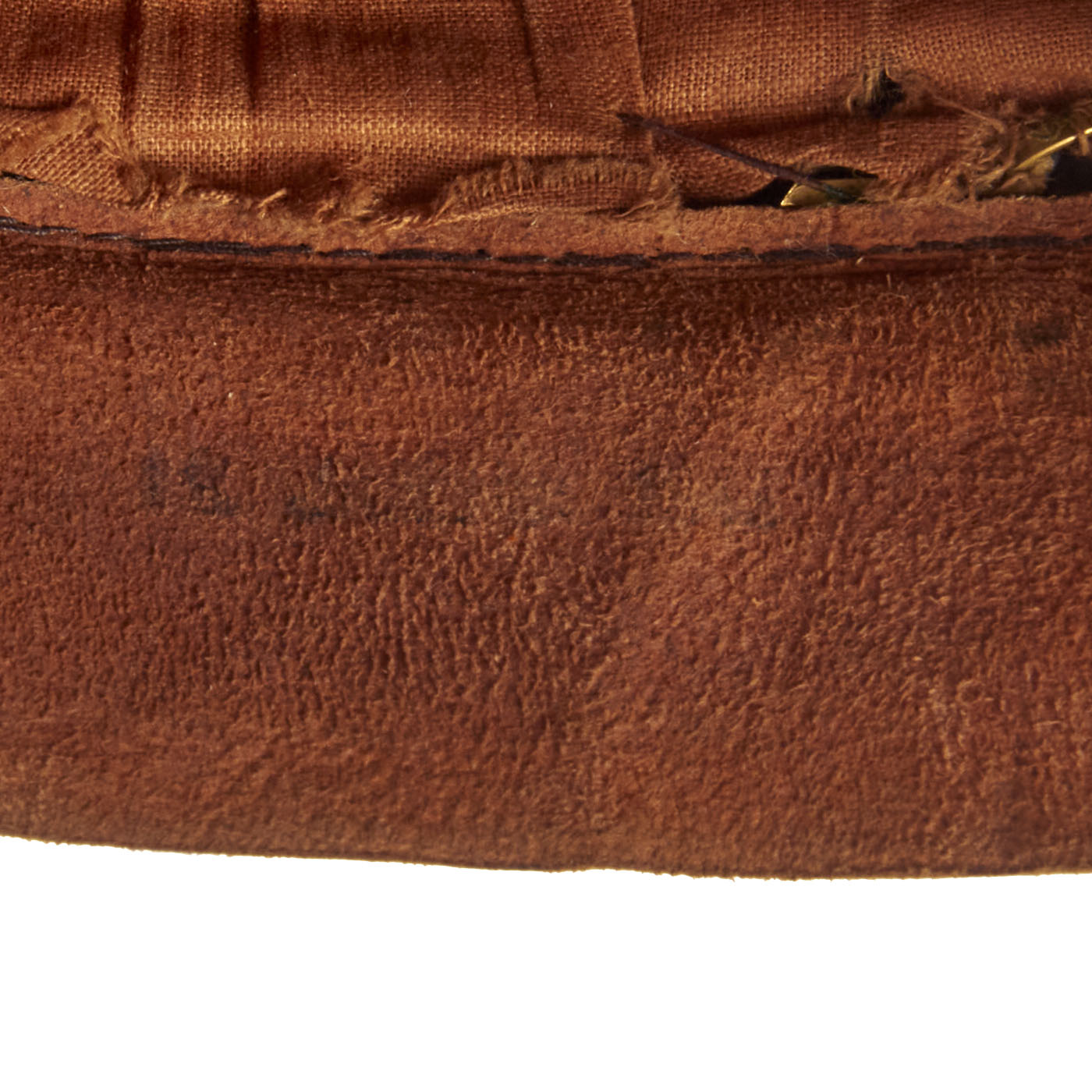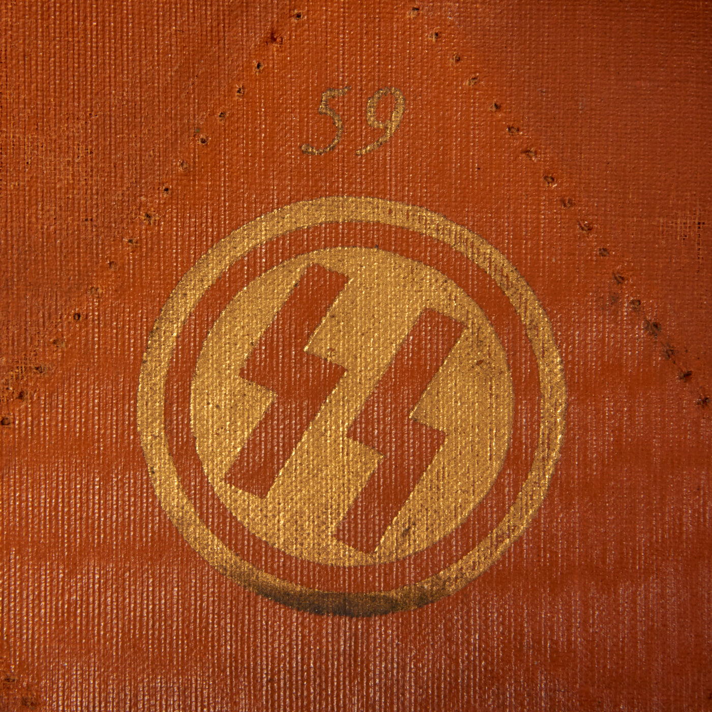 The interior top panel is finished in orange/brown oilcloth while the remainder of the interior is finished in orange/brown cloth. The diamond shaped moisture shield is unfortunately missing. The gold silk screened ᛋᛋ doppelte Siegrune (Double Sig/Victory Rune)symbols are fully intact.