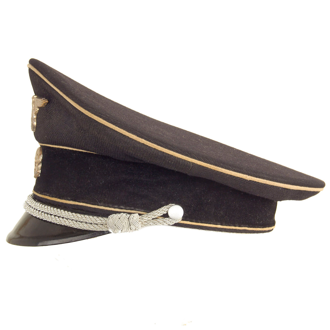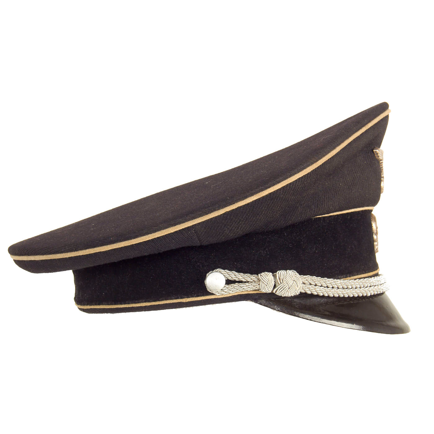 The visor cap (Schirmmütze) was an important part of the headgear worn by German uniformed military, civil, paramilitary and political organizations during the Third Reich. This was the standard cloth headgear worn as a part of the service uniform. Visor caps were worn outdoors as well as indoors, and were often required to be worn by all personnel on duty. Visor caps were made in versions specific to each organization and were often further differentiated through the use of insignia, colored piping, or style of chin cord, to indicate rank, role or branch. The insignia used on these caps ranged from simple stamped metal emblems, to elaborate hand embroidery. Visor caps were issued to enlisted soldiers and NCOs in the military and in some other organizations. Officers had to purchase their own hats, and lower ranks could choose to purchase caps that were of a higher quality than the rather basic, issue examples. The private purchase caps were generally made in very high quality, with fine materials. A wide variety of fabrics were used, from Trikot and doeskin, to heavy wool, or even lightweight white fabric for summer wear. In the military, issue of these caps was generally suspended shortly after the outbreak of the war, but they continued to be worn by some troops until the end of the war.