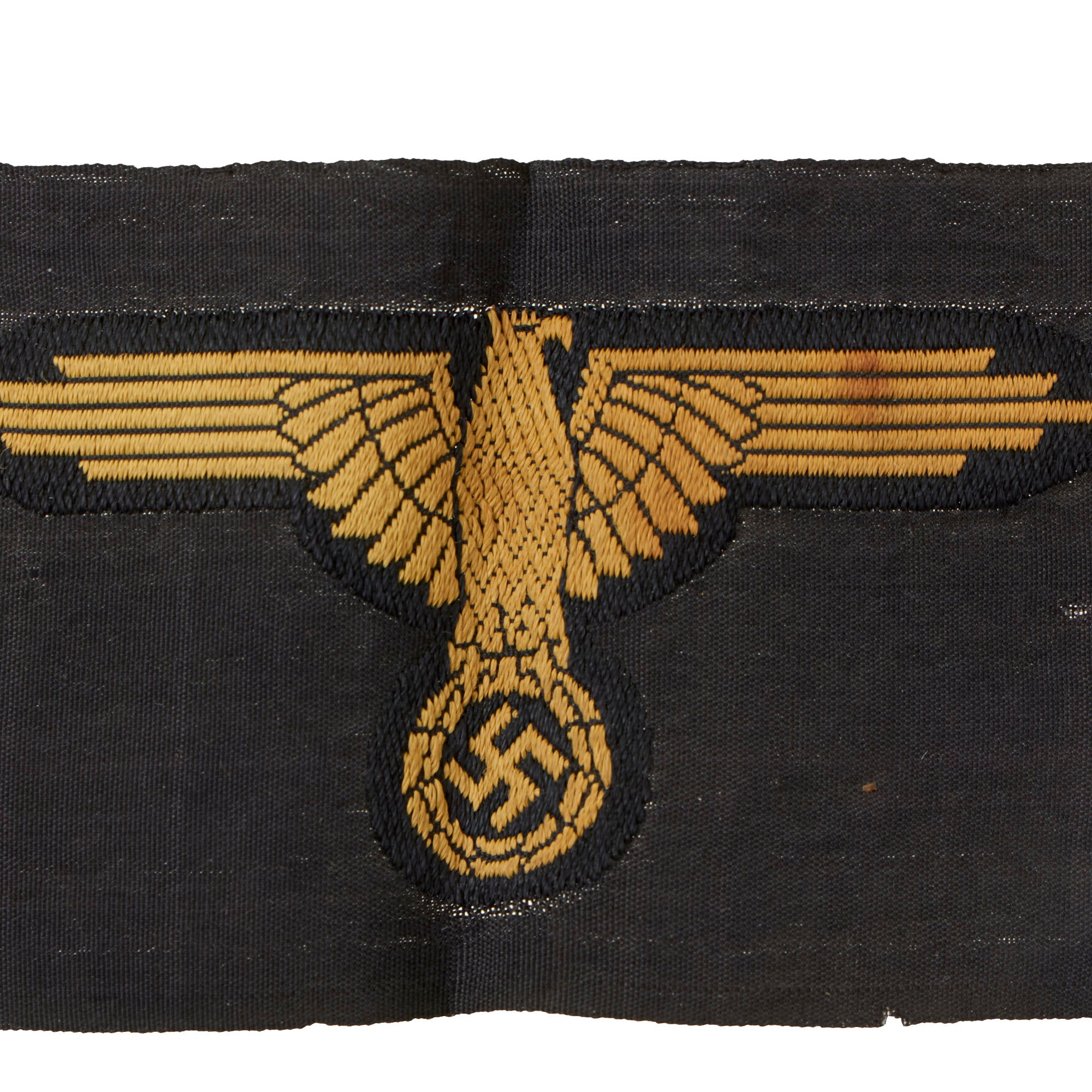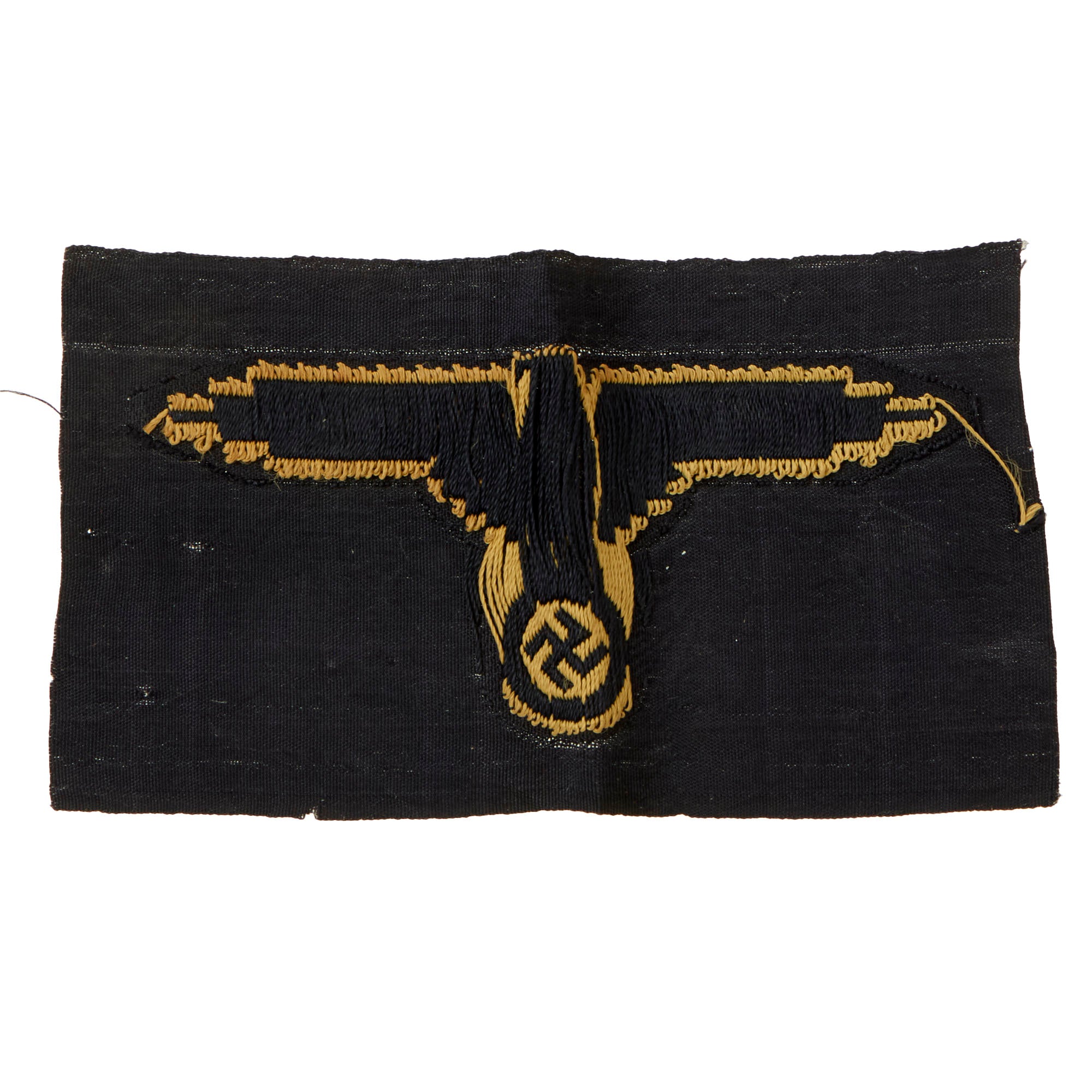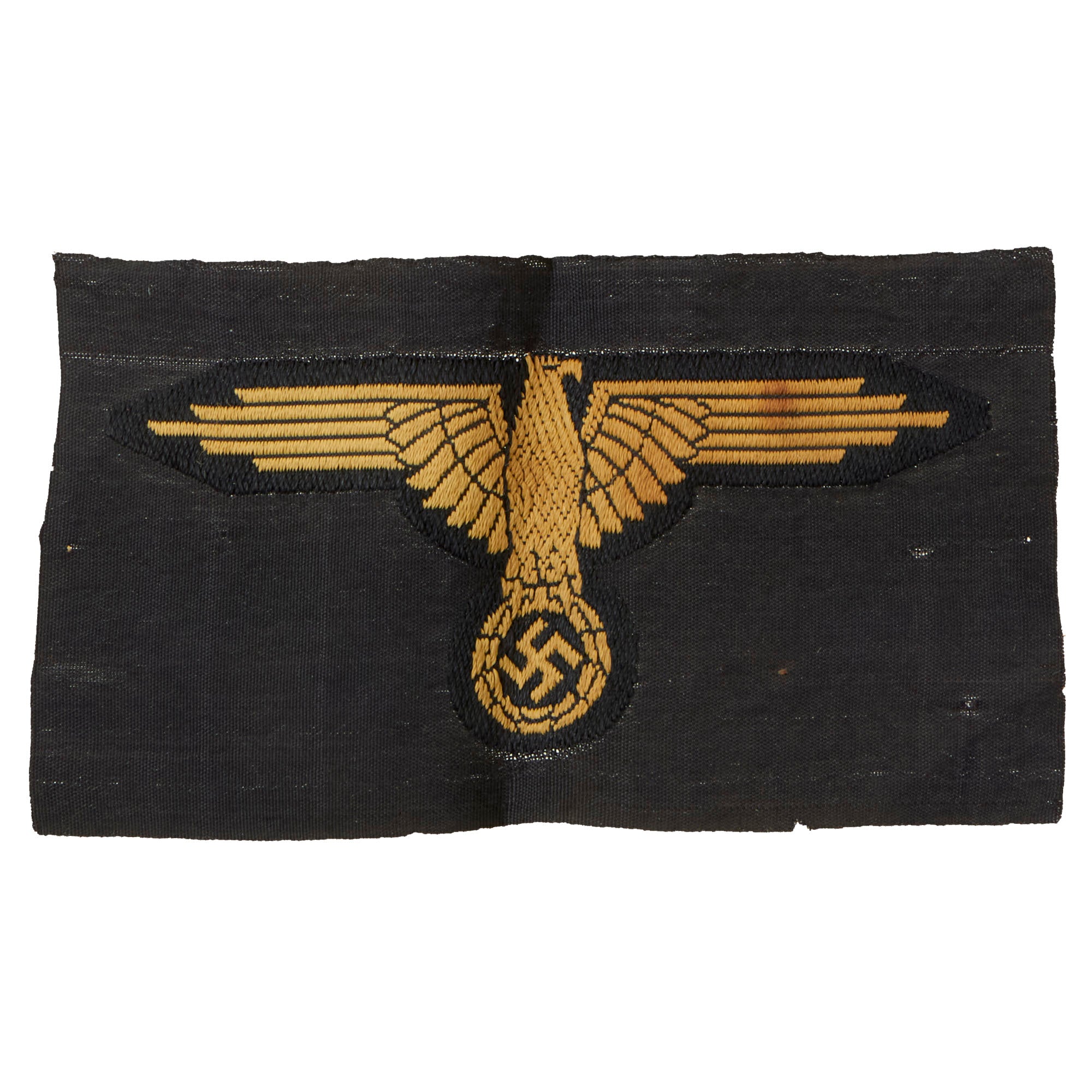 Original Items: Only One Available. This is a very nice unissued condition SS Tropical Sleeve Insignia, which depicts a beautiful BeVo woven eagle on a black rayon background. The eagle has a slight tan color which is an indication that it is for the tropical uniform. The details throughout the bird are extraordinary as he has open wings, looks to the viewer’s right and clutches a wreathed swas. The insignia has definitely never been installed on a uniform, but it does look to have been on display for some time, and also has suffered some staining on the right side. Measures approximately 4"W x 2 1/4"H.